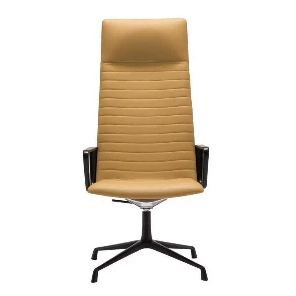 High back armchair with upholstered shell and aluminum swivel four-star base with self-return and finished in polished aluminum, white or black. Additional options include: parallel upholstery stitching, tilt mechanism and back finished in walnut veneer. The Flex family of seating has evolved with the addition of the new collection Flex Executive. This collection consists of conference chairs and armchairs that are available in three backrest versions: low, intermediate, and high. Additionally, two versions of lounge chairs, with two distinct backrest heights, complete the collection. Additional options include back finished in walnut veneer.