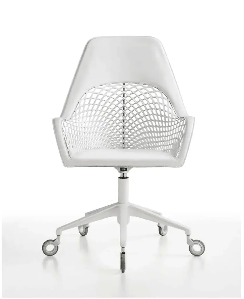 Guapa DPA swivel and high adjustable armchair with five-ways base in lacquered steel. Tilt mechanism integrated. It comes with white wheels combined with a white base or with chrome wheels with black edge combined with the black base. Seat and backrest are in hide.
