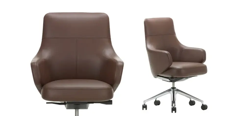 The prestigious Grand Executive armchair makes an exceptionally comfortable seating choice for well-appointed home offices, thanks to its individually adaptable FlowMotion mechanism and luxurious leather upholstery. Material description- Executive armchair in accordance with EN 1335.- Mechanism: FlowMotion mechanism with individual adjustment of backrest resistance.- Backrest and seat: seat shell with integrated armrests. Backrest shell made of plastic; seat and back upholstery made of polyurethane foam. Leather cover.- Base: five-star base in polished die-cast aluminium. With double castors (Ø 60 mm) for hard and soft floors in in basic dark.The Grand Executive chair combines the elegance of the Grand Repos lounge chair, which was designed by Antonio Citterio for the Vitra Home Collection, with the functionality of a modern office chair. The dignified aura of the Grand Executive chair is complemented by a sleek aesthetic. Covered in high-quality leather, its softly padded upholstery provides supreme comfort. Decorative seams highlight the chair’s handcrafted details and delineate its volumetric structure. The FlowMotion mechanism can be adapted to the individual user to ensure synchronised comfort in every sitting position. The Grand Executive Highback model is equipped with an adjustable neck cushion.The Grand Executive chair comes in different versions: Grand Executive Lowback is distinguished by its lower backrest and Grand Executive Conference offers a sophisticated solution for visitor and conference seating. Together with Grand Repos and Repos, they form a family of chairs that gives a unified look to offices and conference rooms as well as lobbies, waiting zones and reception areas.