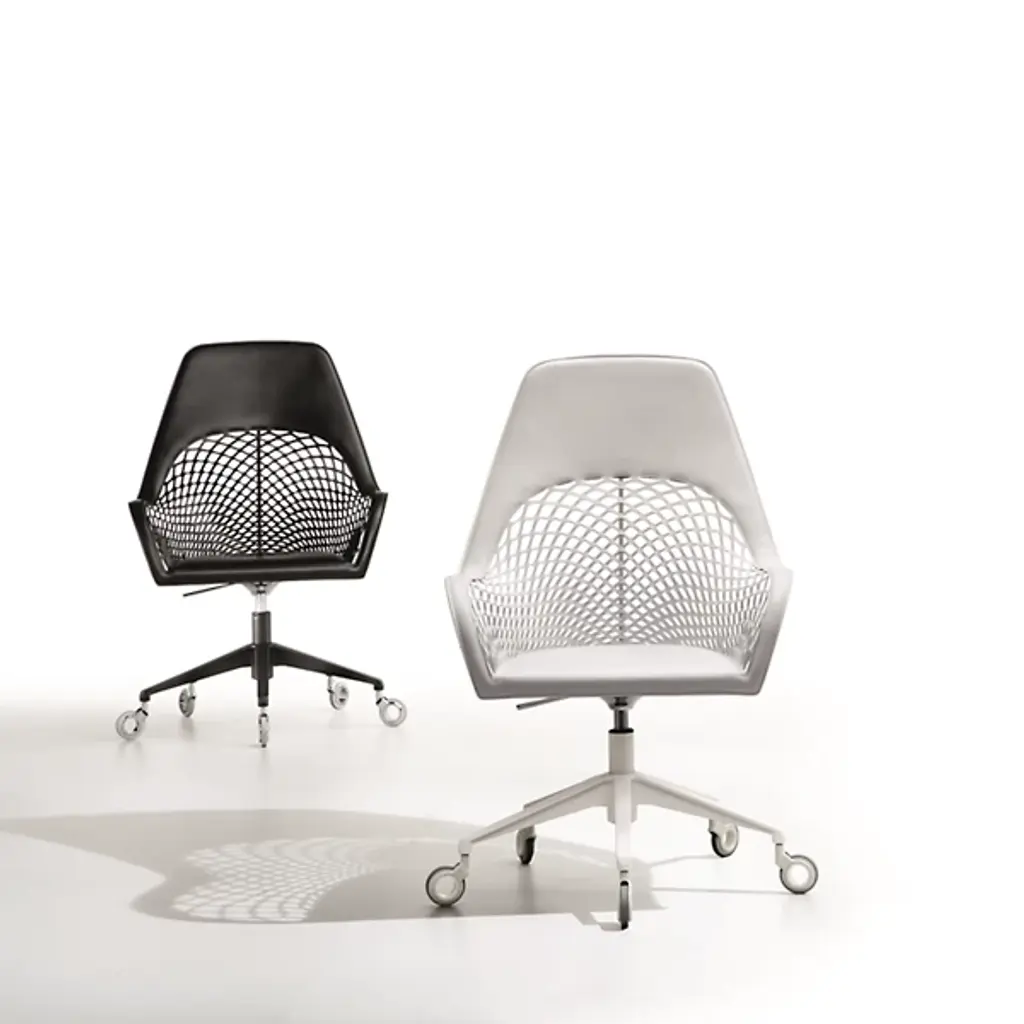 A stylish and refined modern piece that brings comfort to the office setting. The Guapa Office Chair from Midj matches with a range of décor choices, allowing work or play to last hours on end without issue. The base is made of smooth steel and features a set of wheels that provide a sturdy foundation. The seat itself is made of hide and showcases a single piece that flows, creating the backrest and the armrests.