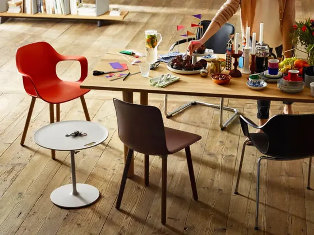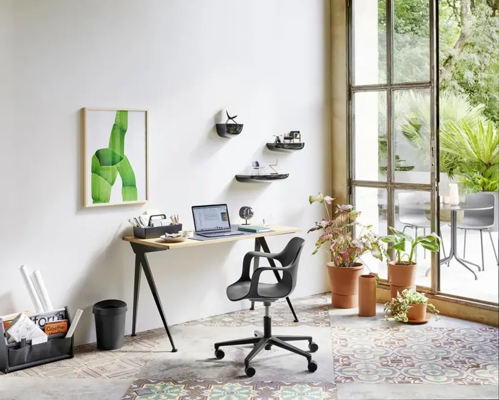 The HAL Armchair seat shell comes with integrated armrests, and its exceptional comfort is enhanced when paired with the height-adjustable swivel base of the Studio version and optional seat cushions. The HAL Armchair Studio is an ideal choice for a wide range of home office environments.Material description- Seat shell: dyed-through polypropylene, with armrests. All versions of the HAL Armchair are available with seat cushions (attached to shell with screws).- Seat shell: dyed-through polypropylene, with optional seat cushion (screwed to the seat shell).- Base: five-star base in die-cast aluminium powder-coated in basic dark. Swivel mechanism with shock-absorbing seat suspension, height-adjustable.HAL is Jasper Morrison's interpretation of a shell chair in the tradition of the Plastic Chair by Charles and Ray Eames, whose variety of different bases enables versatile use – from dining tables to meeting rooms, from bars to auditoriums. HAL is now also available in the version HAL RE with seat shells made of recycled plastic – as side chairs or armchairs.The chair bases exist in metal or wood, on castors as studio models or in high versions for bar stools and as a beam solution for waiting zones.These different base options can be combined either with a seat shell in plastic (HAL and HAL RE) or plywood (HAL Ply), or with a lightly padded shell covered in fabric (HAL Soft).The recycling material for HAL RE stems from Germany's 'Yellow Bag' (Gelber Sack) collection of household waste, which primarily consists of used packaging. Utilising this recycled material instead of conventional plastic generates fewer climate-damaging emissions and also significantly reduces energy consumption.Due to the composition of the recycled material, the different colours are interspersed with tiny specks of pigment. The colour white cannot be implemented in the new material at the moment and will follow as soon as technically feasible. The HAL RE seat shell can also be 100% recycled at the end of the product's life.When destined for use in large numbers in auditoriums, multipurpose rooms, training areas etc., HAL RE can be ordered with stackable bases, optional row connectors and seat numbering elements, as well as with a stacking trolley.The comfort of the pleasantly flexible plastic or wooden shells can be further enhanced through the addition of seat cushions or seat upholstery – or by opting for HAL Soft with its full upholstery.In the versions with a plastic shell and powder-coated base, HAL is also suitable for use in outdoor settings.The related HAL Armchair rounds out the HAL family.