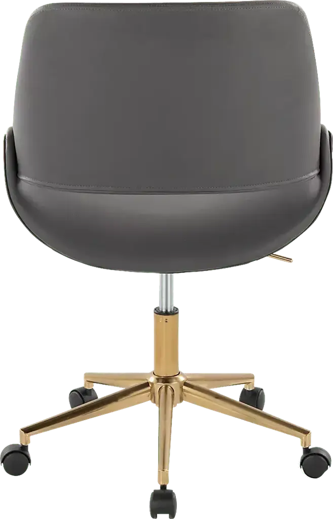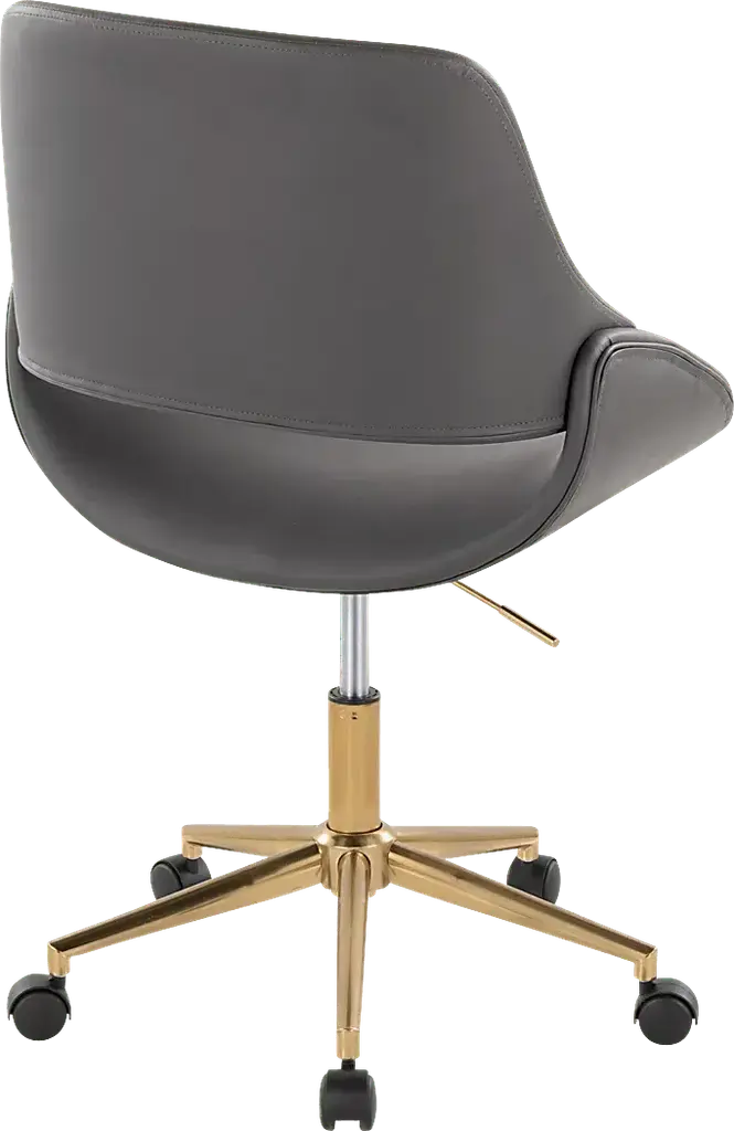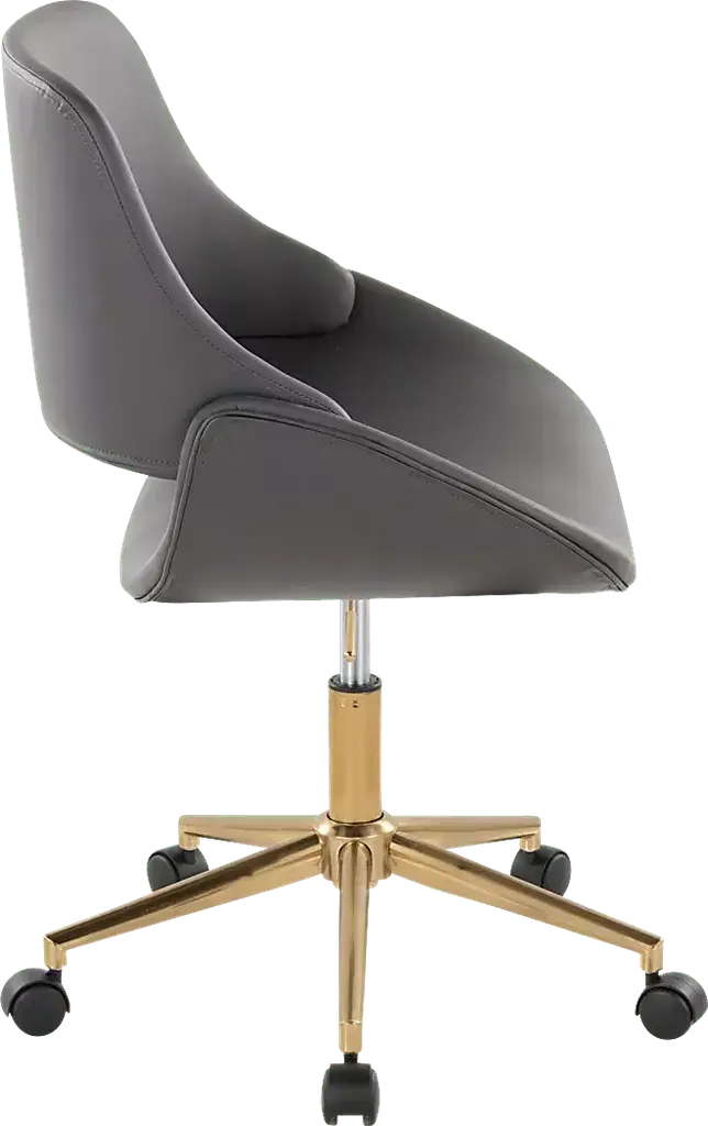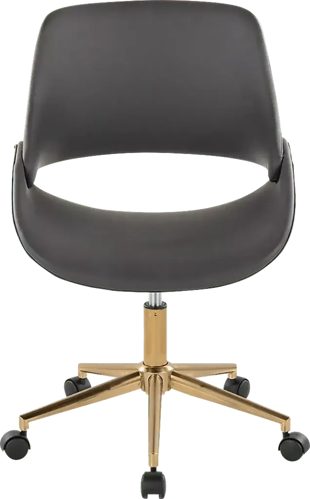 The wide and welcoming seat of the Halma desk chair beckons one to sit and relax. A curved back and contoured faux leather upholstered seat is accented by a sleek metal adjustable base that add to the stylish yet comfortable design. Customer assembly required.