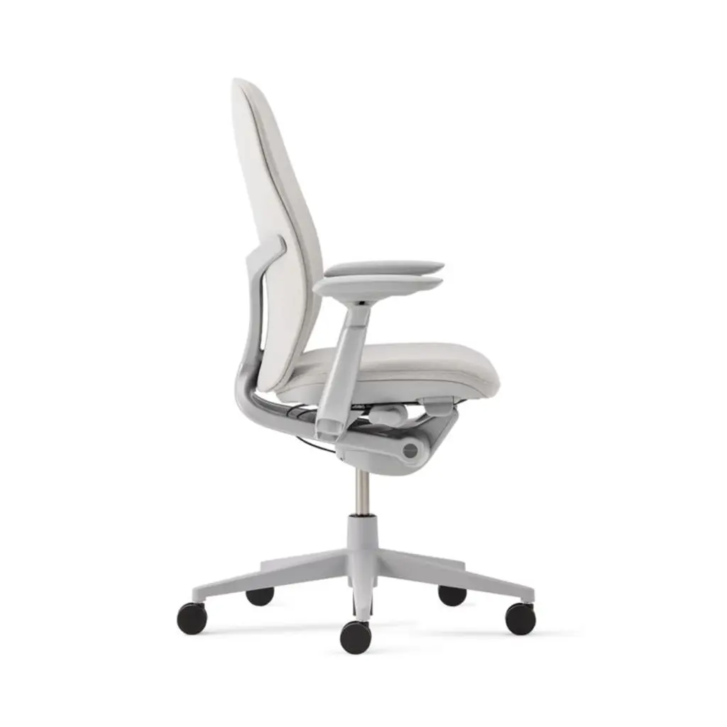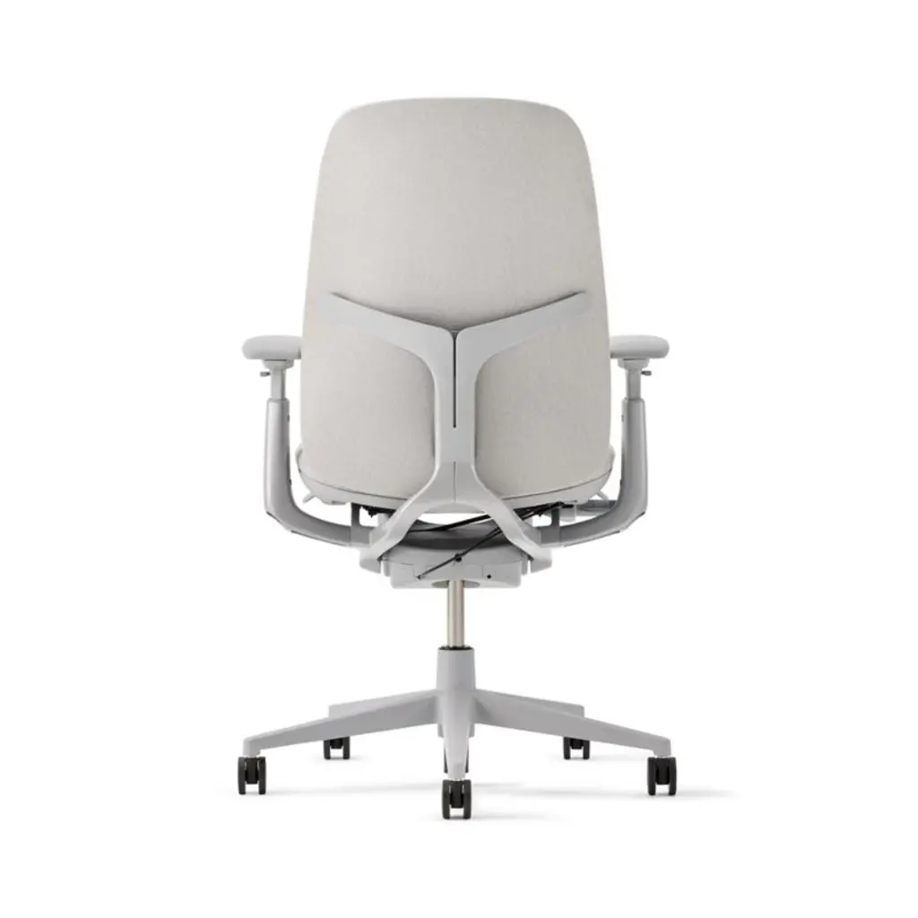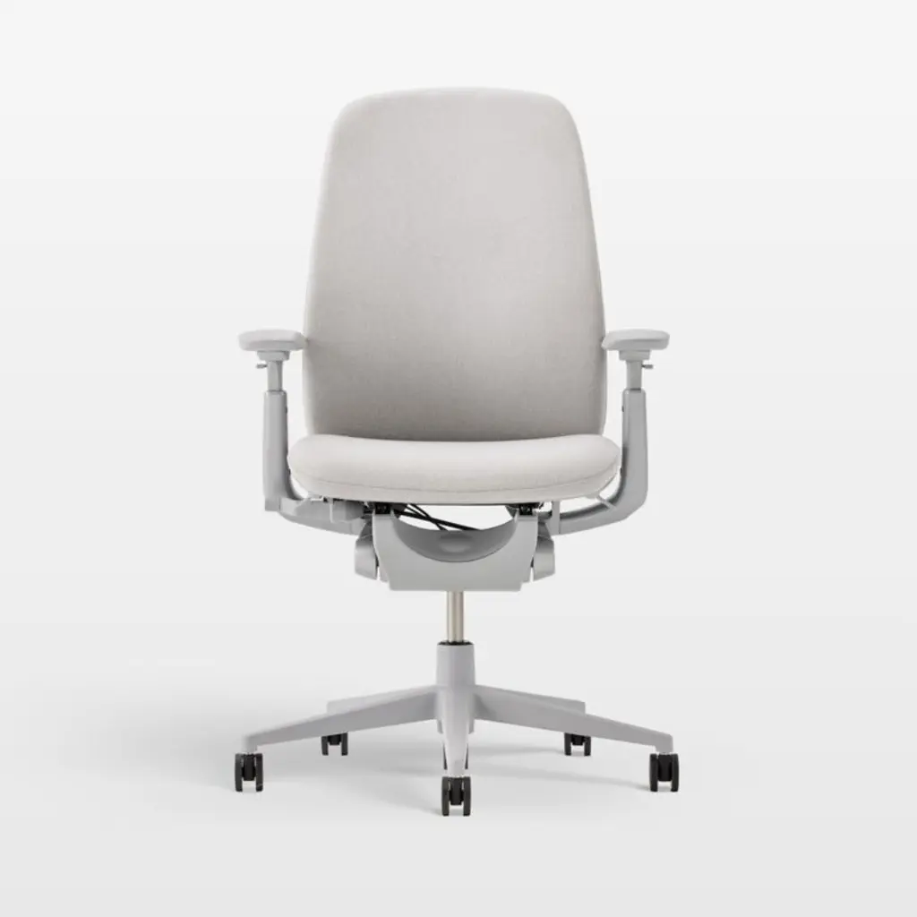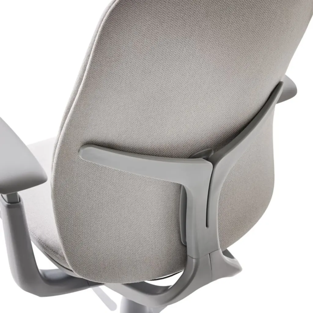 Choose your desired position and the Zody chair accommodates with a full range of adjustments for a comfortable and supportive sit. The perfect partner to a sit-to-stand desk, the chair allows for a "perch" posture that's half-sitting and half-standing. It also offers a forward tilt option that angles the seat downward. Made with ocean-diverted recycled plastic, the light grey upholstery is woven with a subtle herringbone that's durable and soft to the touch.
