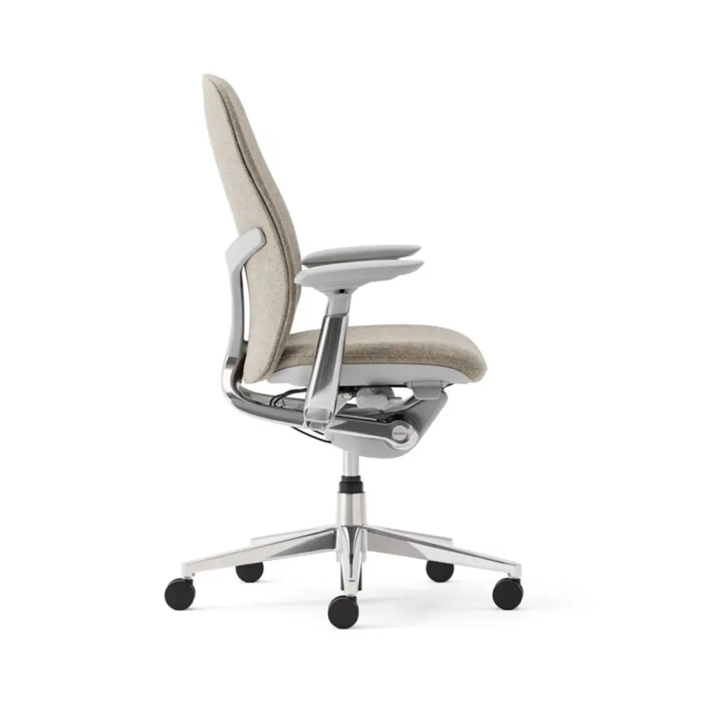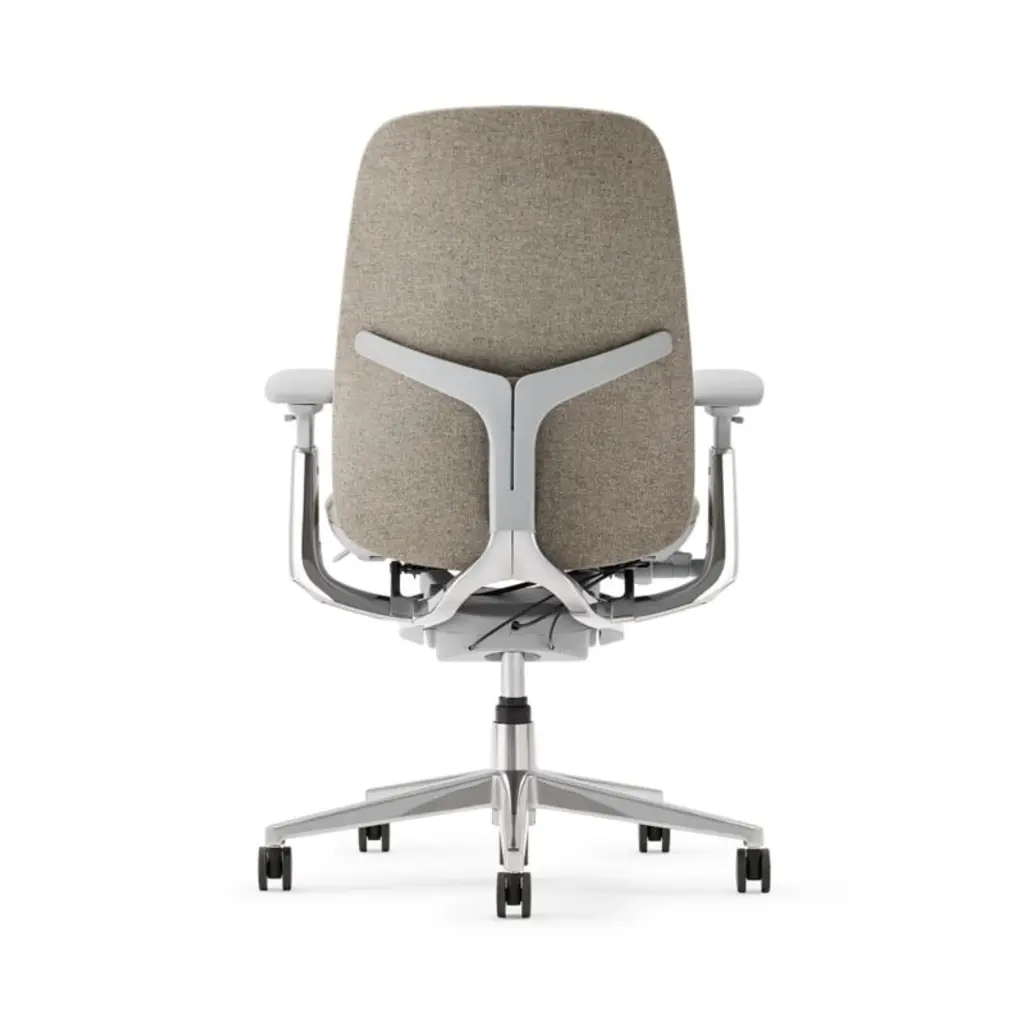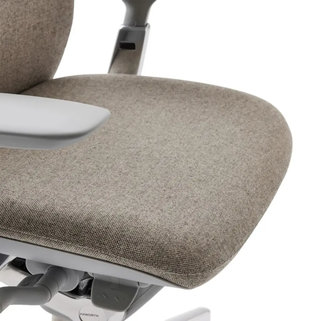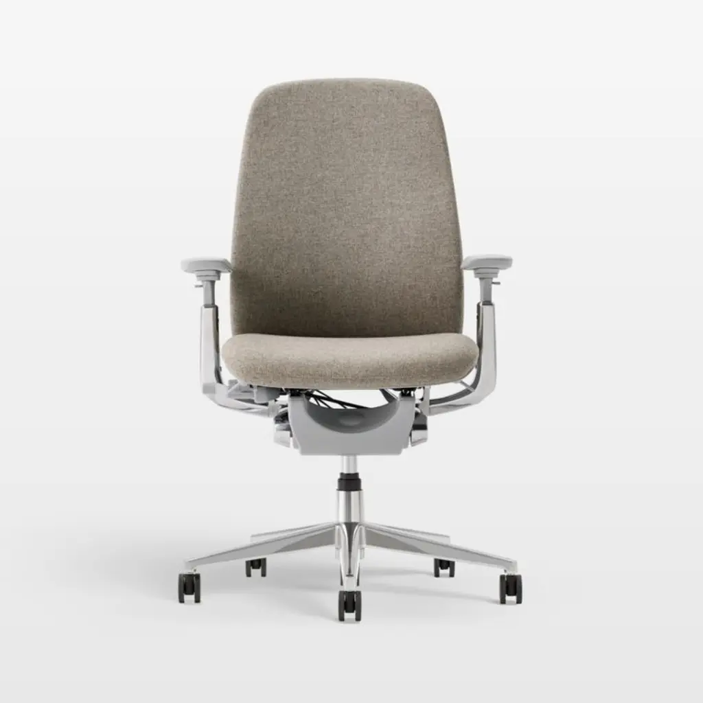 Choose your desired position and the Zody chair accommodates with a full range of adjustments for a comfortable and supportive sit. The perfect partner to a sit-to-stand desk, the chair allows for a "perch" posture that's half-sitting and half-standing. It also offers a forward tilt option that angles the seat downward. The chair is fully upholstered in a neutral stone fabric made of a durable wool-flax blend that yields rich tonal color.
