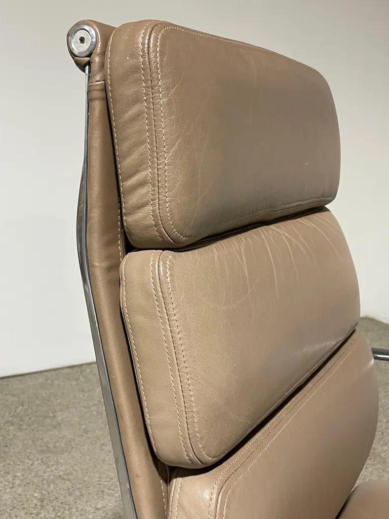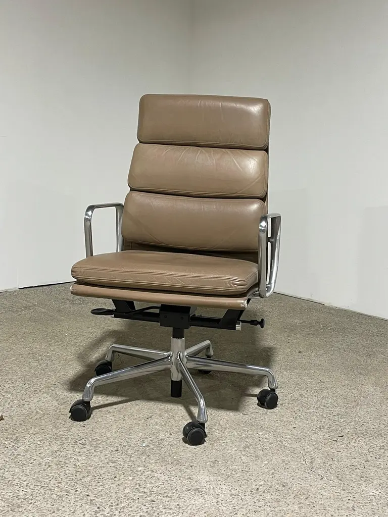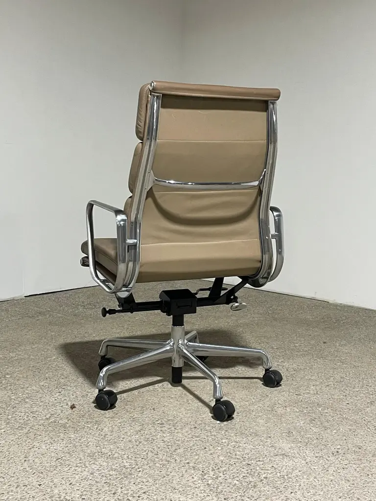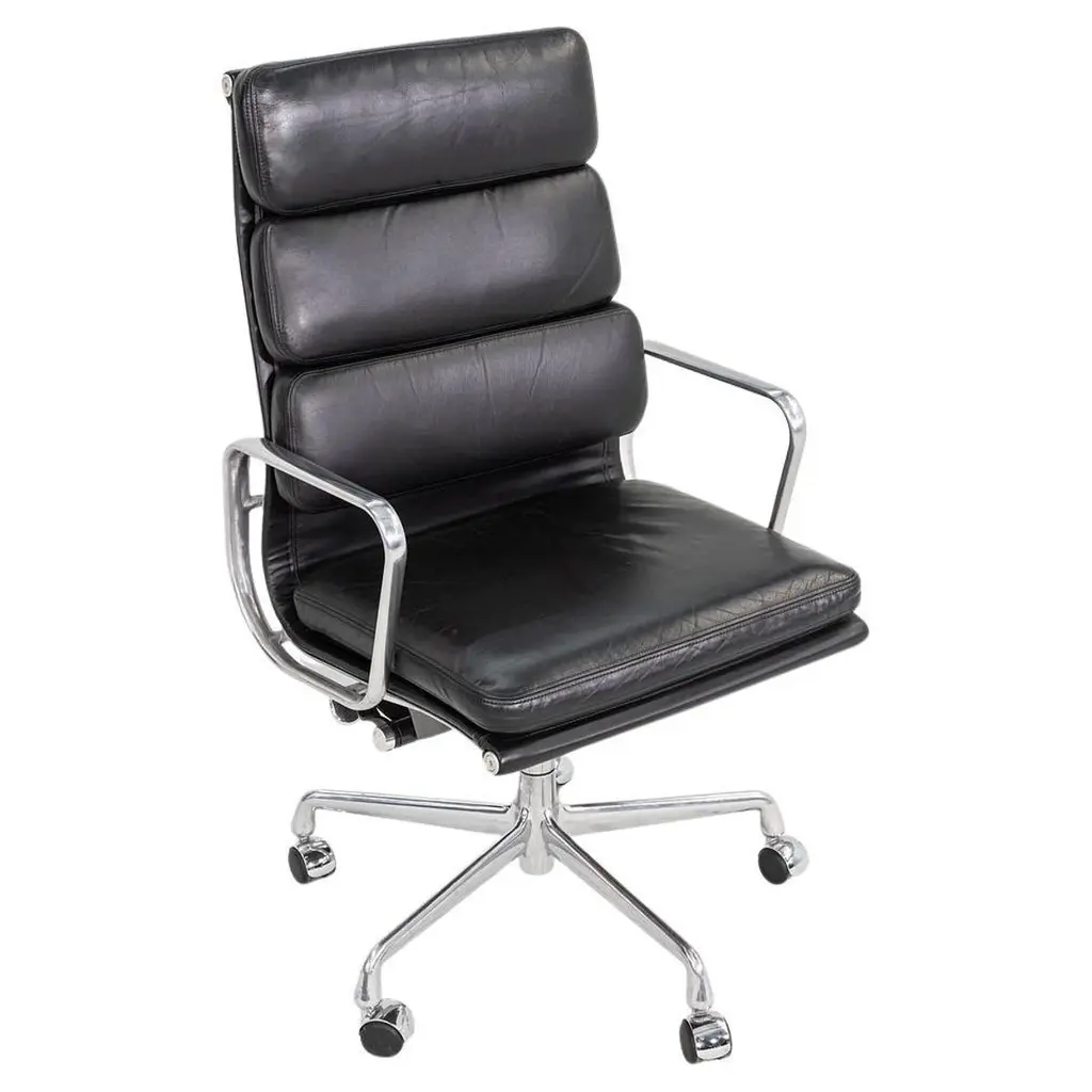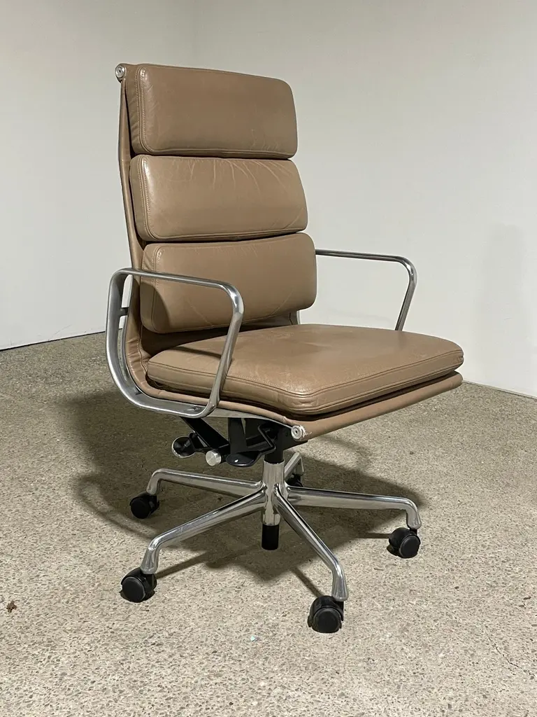 Presenting the iconic Eames Aluminum Group Executive-Height Soft Pad Desk Chair, originally designed by Charles and Ray Eames for Herman Miller in 1968. This example is from the mid 2010s. Very good overall condition.Ships from Philadelphia PA.Ships via UPS or custom shipping quotes available.Each chair measures 23 inches deep, 23 inches wide, and 40.25 inches high. It has a minimum seat height of 19.25 inches that is adjustable to 22.5 inches. It has a seat depth of 16.5 inches. The leather is in good condition with some patina present. The aluminum bases have some normal light wear present. The arms are in good shape and with some minor wear.