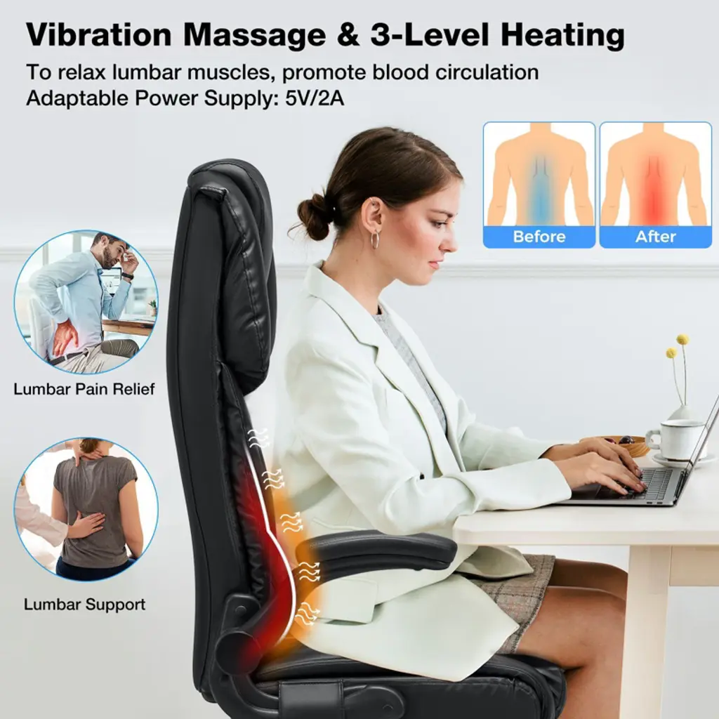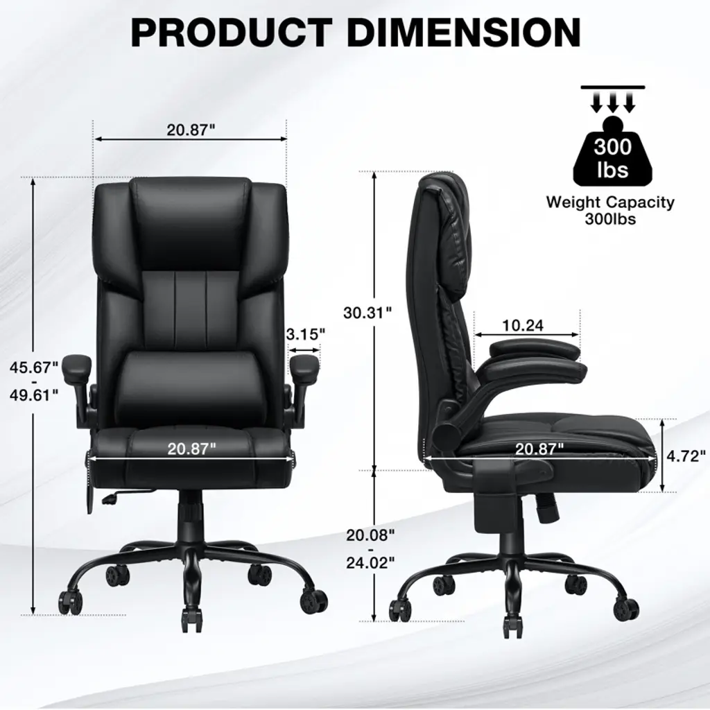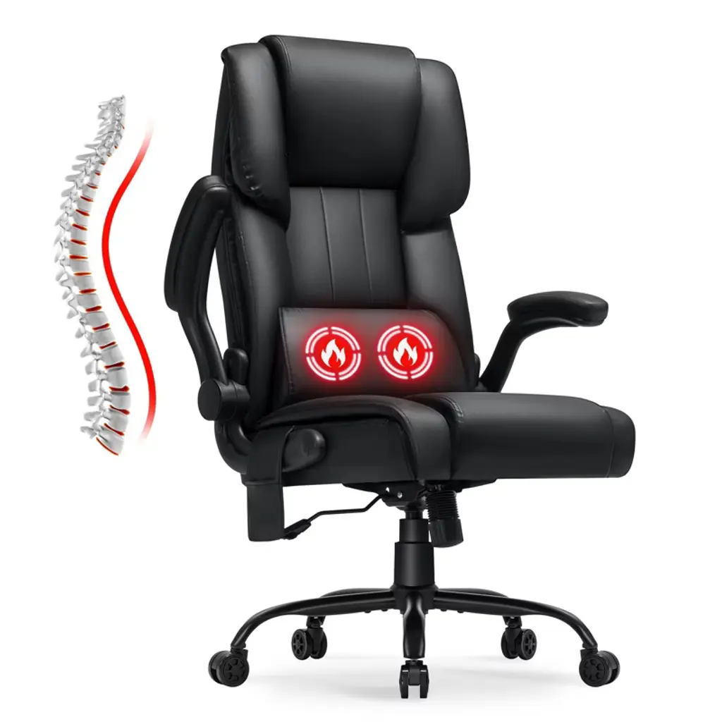 Upgrade your workspace with the HOFFREE Executive Chair!Experience ultimate comfort with built-in heat and massage, perfect for relaxing after a long day. Designed with high-density memory foam and adjustable features, this chair provides support for long hours of work, gaming, or reading. Plus, the space-saving flip-up armrests make it ideal for any desk setup.Durable, stylish, and comfortable, your new go-to office chair is here!#WorkFromHome #GamingChair #MassageChair #ComfortAndStyleSPECIFICATIONSBrand: HOFFREEColor: BlackProduct Dimensions: 20.87"D x 20.87"W x 49.61"HSpecial Feature: Adjustable Height, Space Saving, Heated, Heavy Duty, MassageRecommended Uses For Product: Office, Relaxing, Reading, Computer, GamingMaterial: Faux Leather, MetalItem Weight: 41.8 PoundsFrame Material: MetalStyle: ExecutivePACKAGING INCLUDES1 x Reclining Office ChairCONTACT USIf you have any problems with our items or services, please feel free to contact us any time.We are always online and do our best to solve your problems and provide you with the best customer services!
