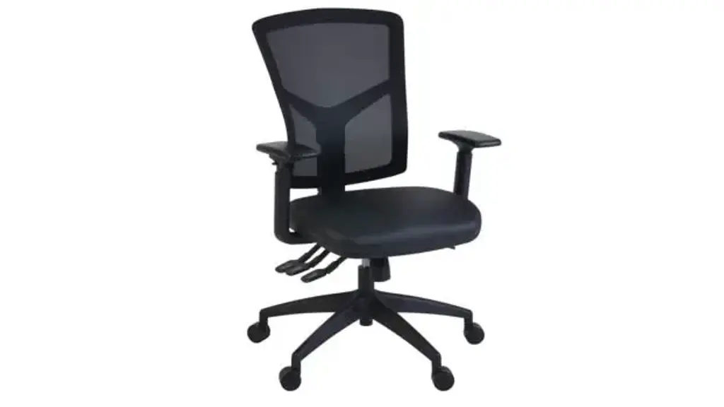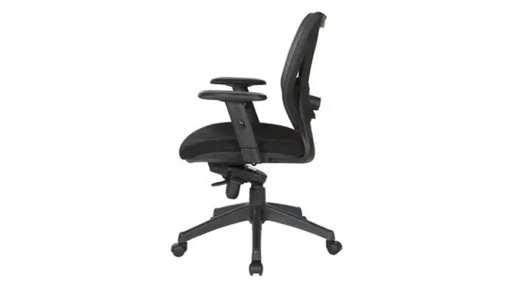 Mesh Back Chair with Padded Fabric Seat, Height Adjustable Arms, Adjustable Lumbar Support and Black Angled Nylon Base. Pneumatic Seat Height Adjustment, Pivot Point Tilt, 2-to-1 Synchro Knee Tilt, Tilt Tension, Tilt Lock. Chair rotates a full 360 degrees in either direction. Overall Dimensions: 27.75" W x 24.75" D x 39.25 - 42.5" H Seat: 20" W x 19.75" D Back: 19.5" W x 20.5" H Arms to Floor: 28" Ships ready for easy assembly.