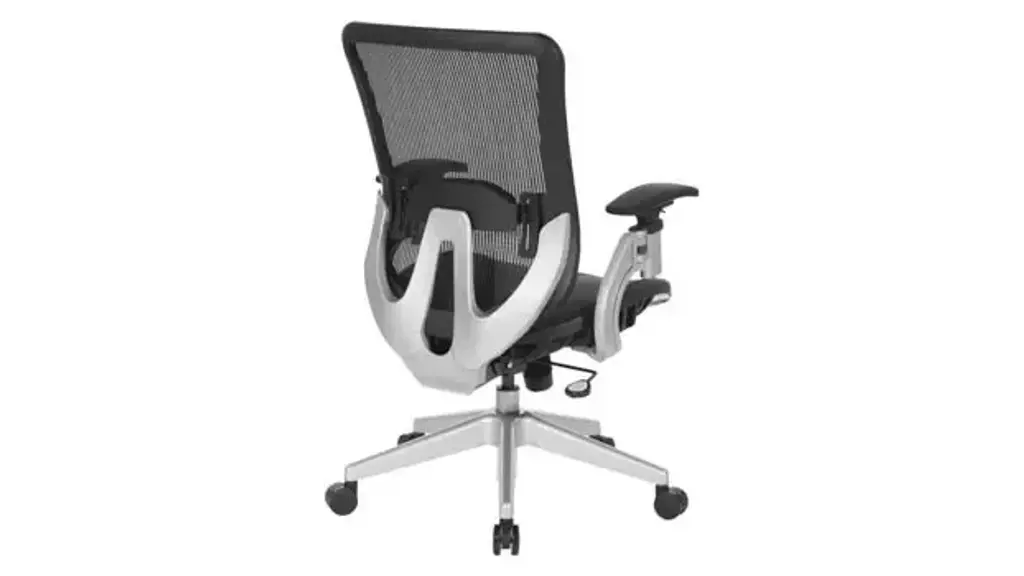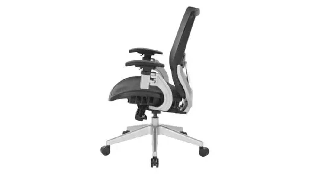 Black Vertical Mesh Seat and Back Chair with Height Adjustable Lumbar Support, Height Adjustable Padded Arms and Silver Angled Nylon Base. Pneumatic Seat Height Adjustment, 2-to-1 Synchro Tilt with Seat Slider, Tilt Tension, Tilt Lock. Chair rotates a full 360 degrees in either direction, Overall Dimensions: 29.25" W x 25.25" D x 39.5-43.75" H Seat: 21.5" W x 19.5" D Back: 19.25" W x 22.75" H Seat Range: 17.75-22 Arms to Floor: 26.75" Ships ready for easy assembly.