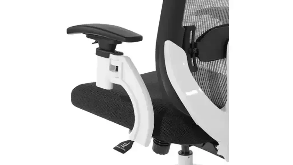 White Vertical Mesh High Back Chair with Height Adjustable Lumbar Support, Colored Mesh Seat, Height Adjustable Padded Arms, and White Angled Nylon Base. Chair rotates 360 Degrees. Choose from a variety of 100% Polyester Mesh Seat Colors. Features: Pneumatic Seat Height Adjustment, 2 -to -1 Synchro Tilt, Tilt Tension, Tilt Lock and Seat Slider. Overall Dimensions: 29.25" W x 25.25" D x 39.5-43.75" H. Seat: 21" W x 18.75" D Back: 19.5" W x 22.5" H Arms to Floor: 26.75" Ships ready for easy assembly.