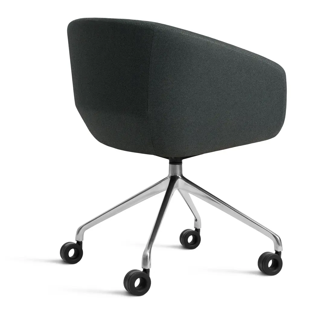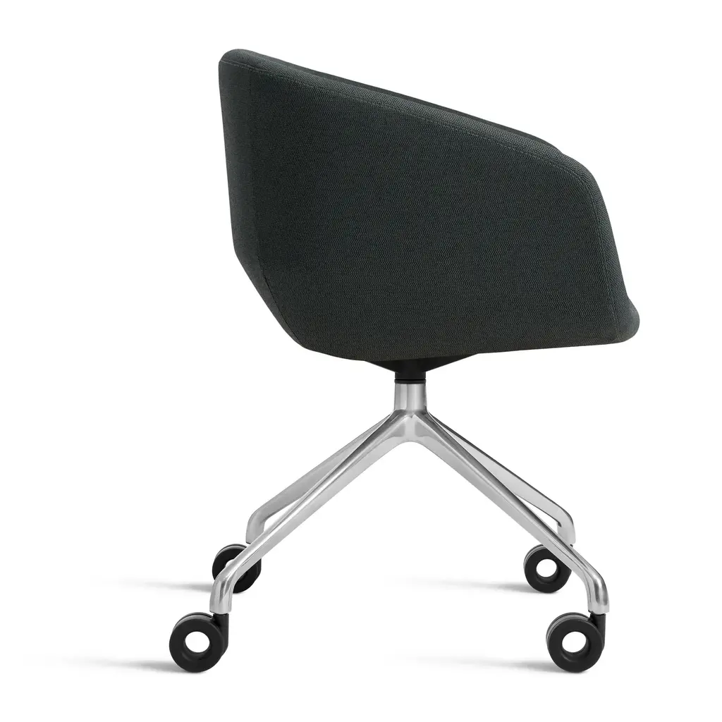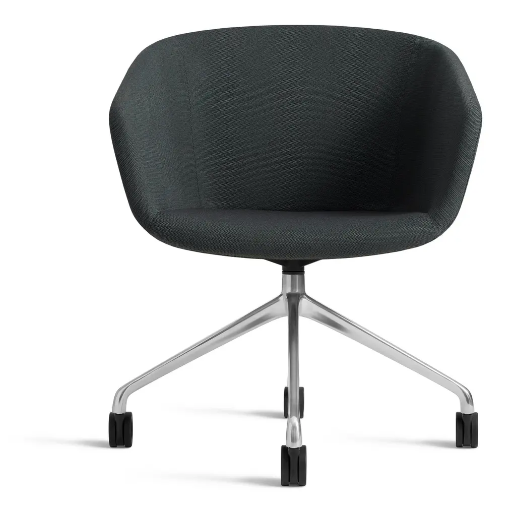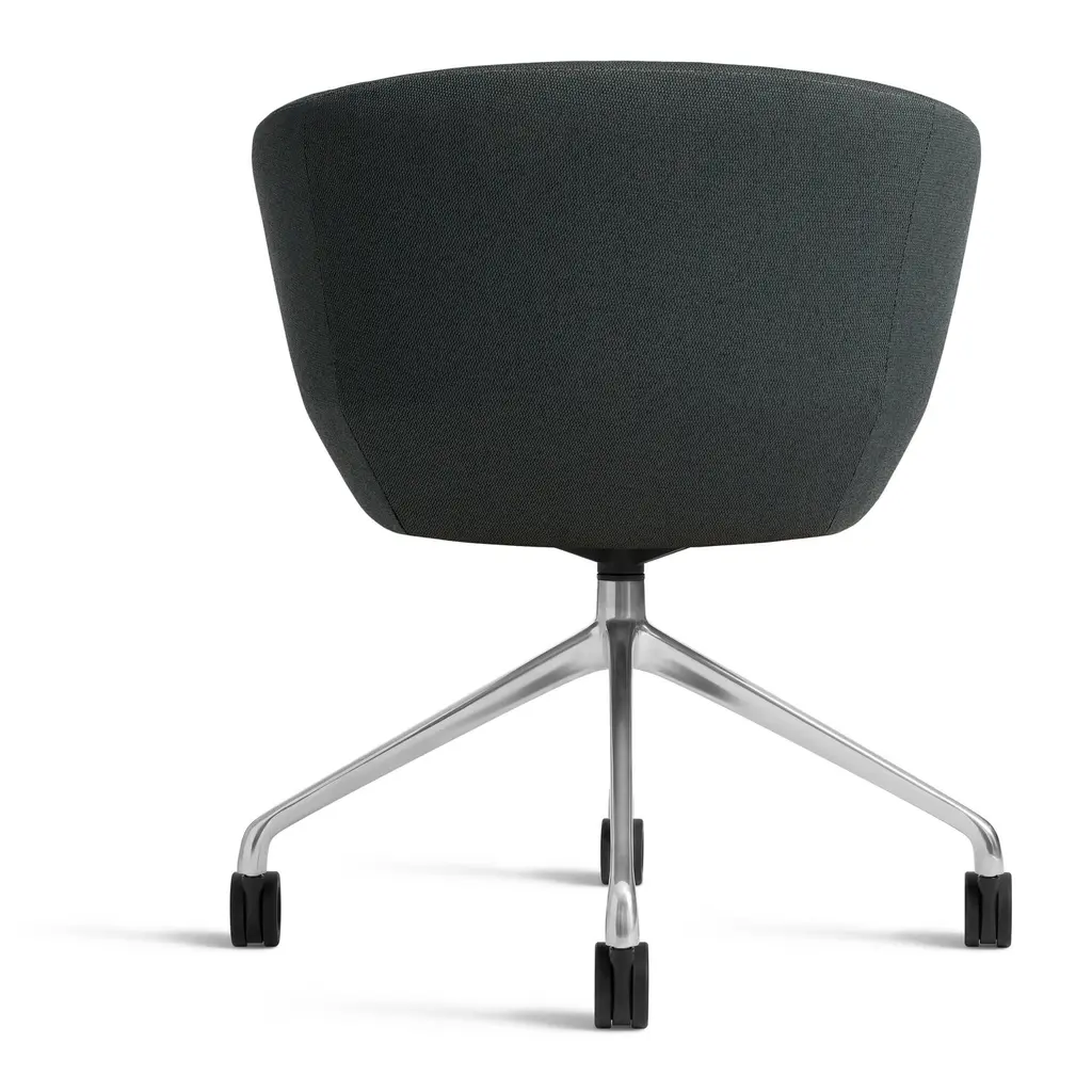 Graceful contours, tuned proportions and an aluminum base make for one heck of a power pose. A fully-upholstered back and well-padded bucket seat eliminate discomfort and bring harmony to your home office. Soft facet back detail adds a satisfying bit of office drama.