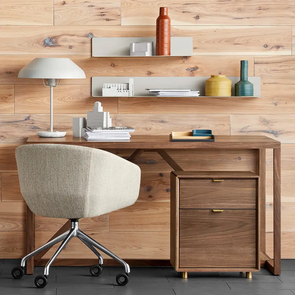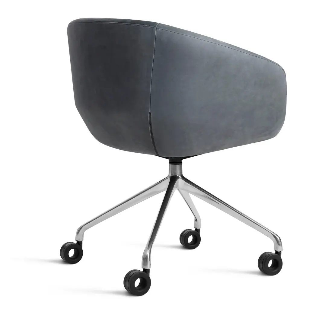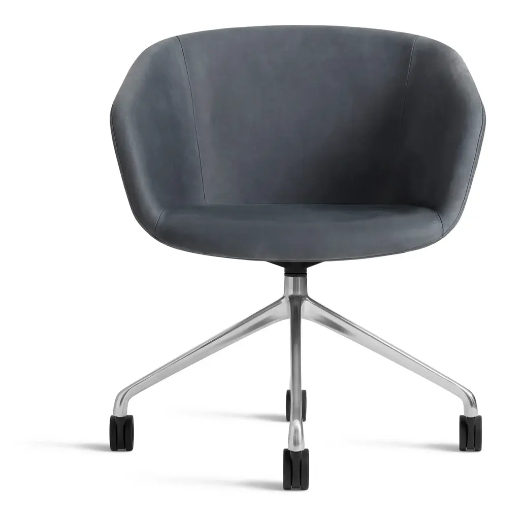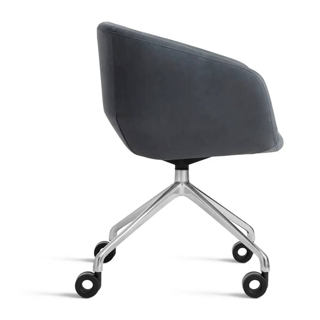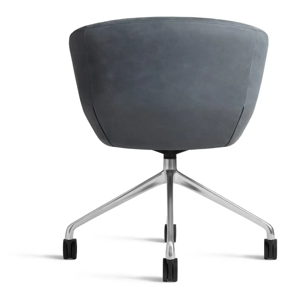 Graceful contours, tuned proportions and an aluminum base make for one heck of a power pose. A fully-upholstered back and well-padded bucket seat eliminate discomfort and bring harmony to your home office. Soft facet back detail adds a satisfying bit of office drama.