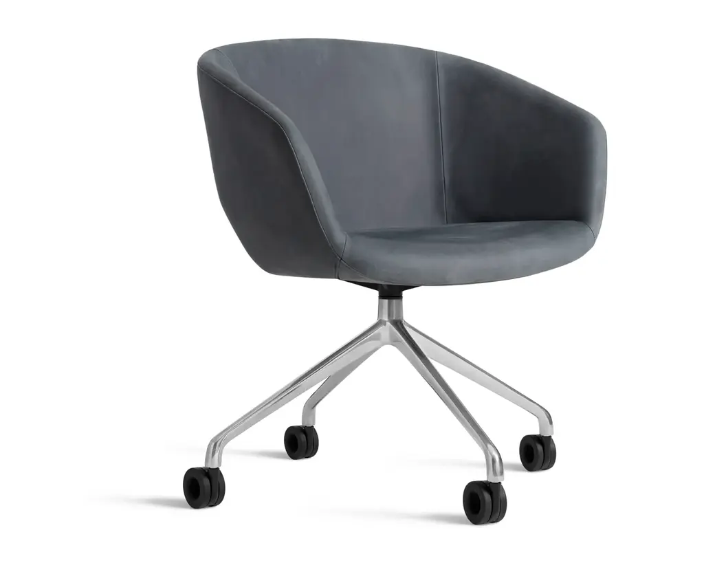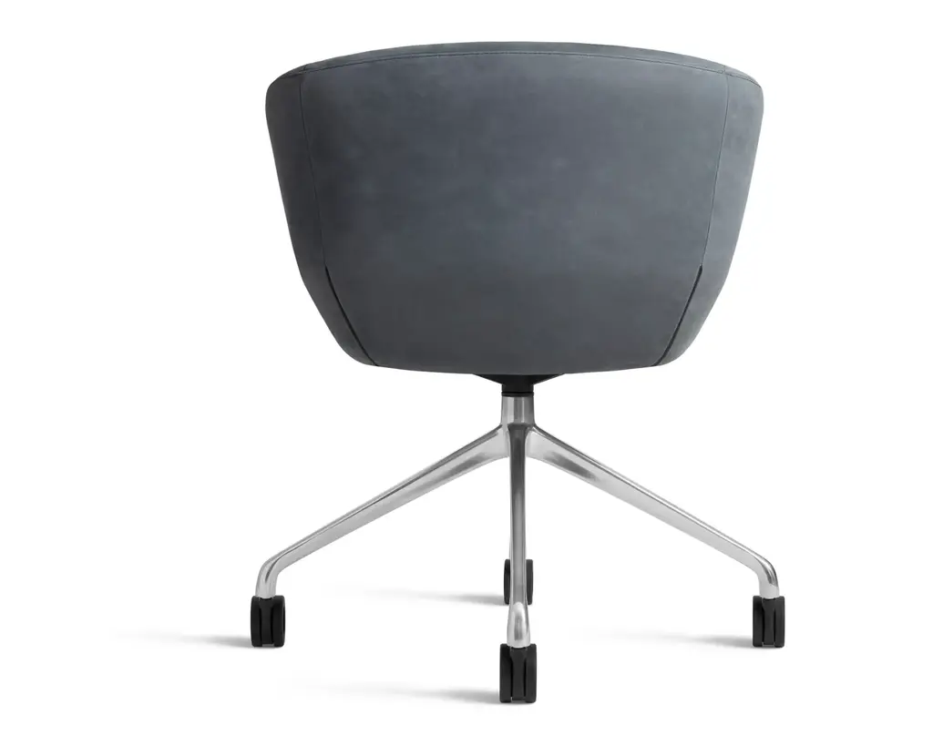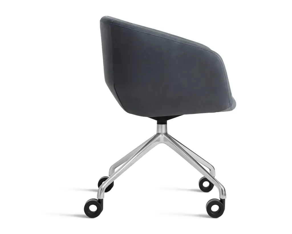 Graceful contours, tuned proportions and an aluminum base make for one heck of a power pose. A fully-upholstered back and well-padded bucket seat eliminate discomfort and bring harmony to your home office. Soft facet back detail adds a satisfying bit of office drama.