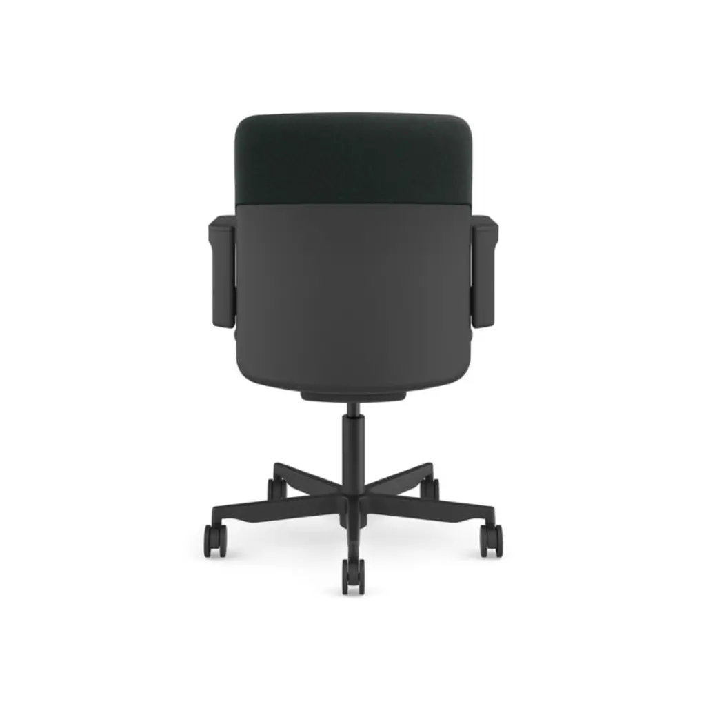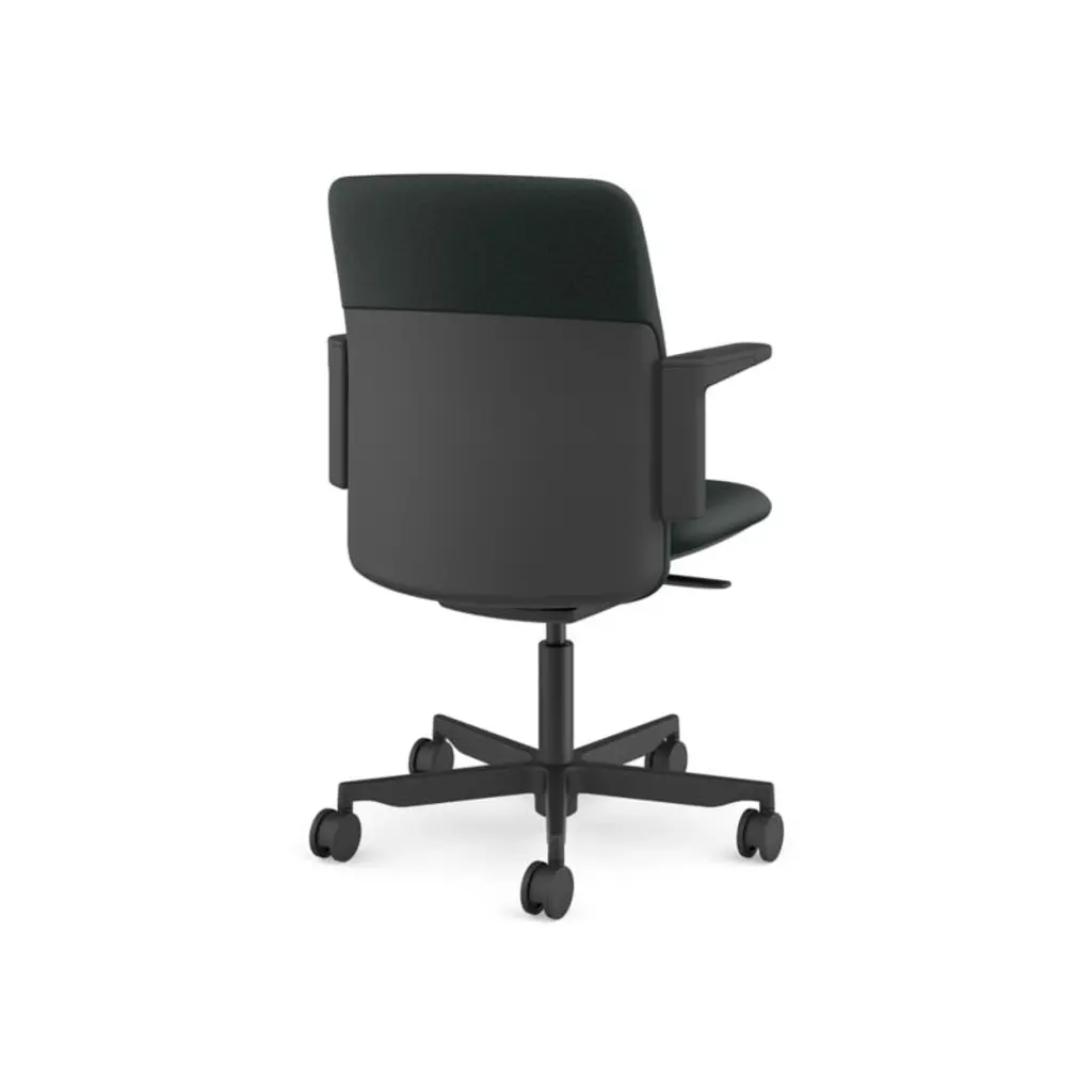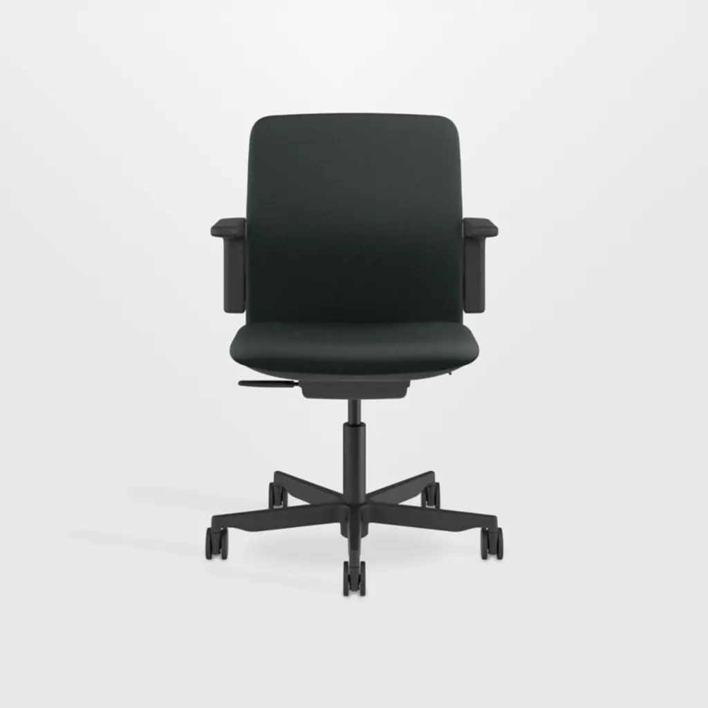 A chair with a feel-good story, the Path task chair by Humanscale incorporates almost 22 pounds of recycled materials. Deep green Formsense Eco Knit fabric crafted of post-consumer recycled polyester conforms to the body, providing self-adjusting lumbar support and a custom fit. The trademarked Gravity Mechanism uses the sitter's weight as a counterforce, creating perfect balance for every user. The sculpted seat cushion's contours match those of the body, reducing pressure points for a comfortable workday at home.