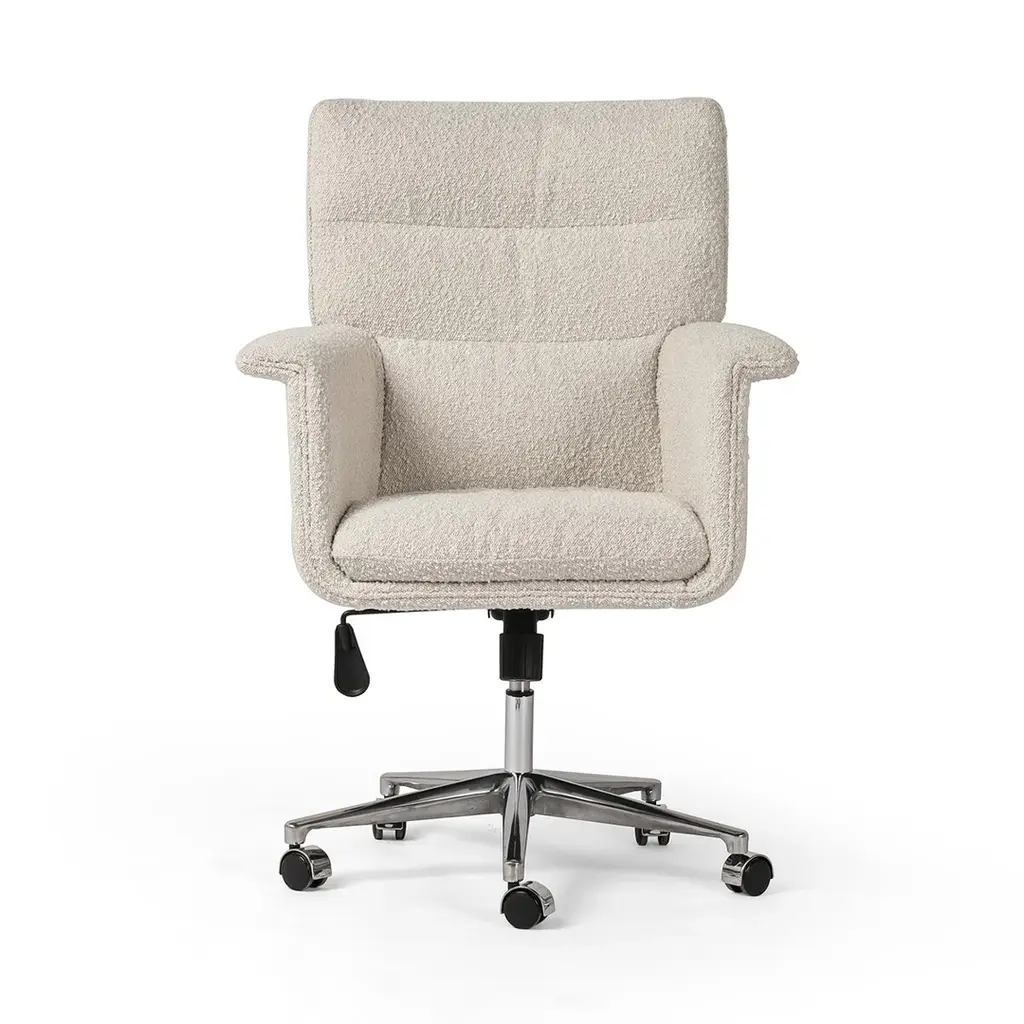Cream performance boucle pairs with a polished aluminum base. Casters plus height adjustability offer ease and comfort. Performance fabrics are specially created to withstand spills, stains, high traffic and wear, ensuring long-term comfort and unmatched durability. Perfectly sized for executive desks. In Stock Early December Adjustable height 360 degree swivel base Performance fabric This image is for illustrative purposes only. The colors shown are accurate within the constraints of lighting, photography, and the color accuracy of your screen.