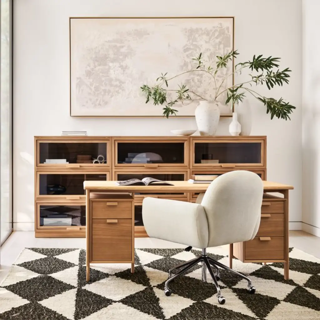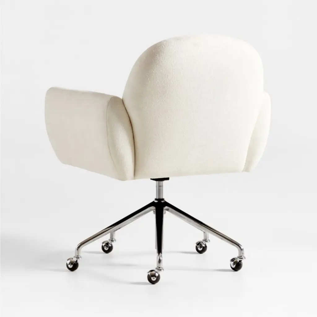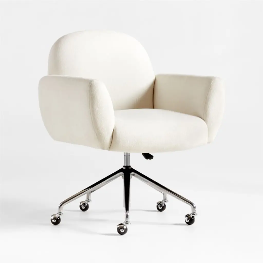 Settle into the living room-style embrace of our Imogen office chair designed for workday comfort. Upholstered in a velvety-soft fabric in decor-friendly ivory, the chair sits comfy and deep with open arms and plush cushions. A chrome-plated star base streamlines the look and rolls from desk to file cabinet on caster wheels. The Imogen office chair is a Crate & Barrel exclusive.By choosing FSC ®-certified furniture, you are supporting responsible management of the world's forests.