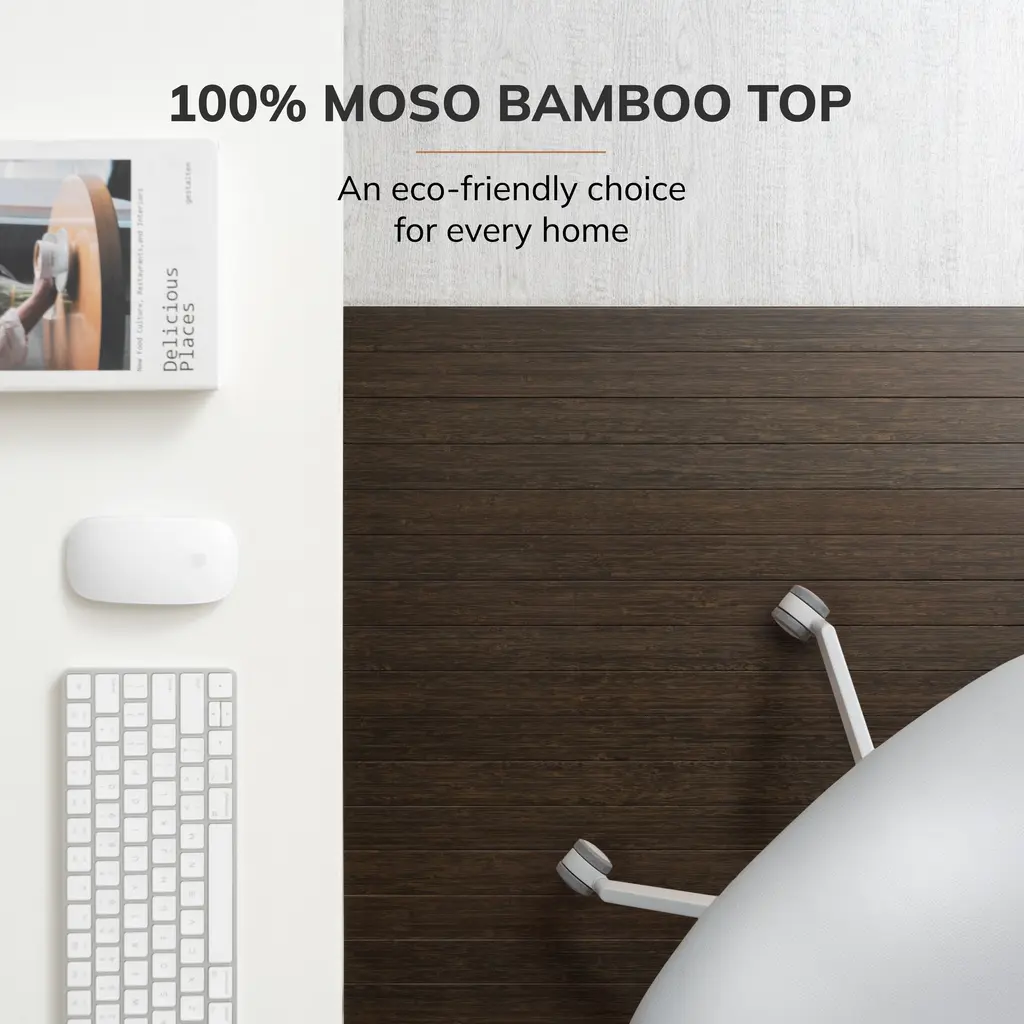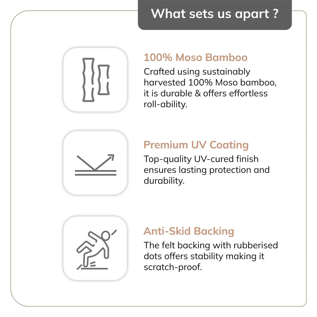The Jani Eco Bamboo Roll-up Rectangular Chair Mat is crafted from durable, eco-friendly bamboo that adds a distinctive natural accent to your office. This chair mat provides a smooth rolling surface for your office chair and works with both low-pile carpet and hard floor surfaces, ensuring protection from wheel scuffs and marks while enhancing your workspace's aesthetic.