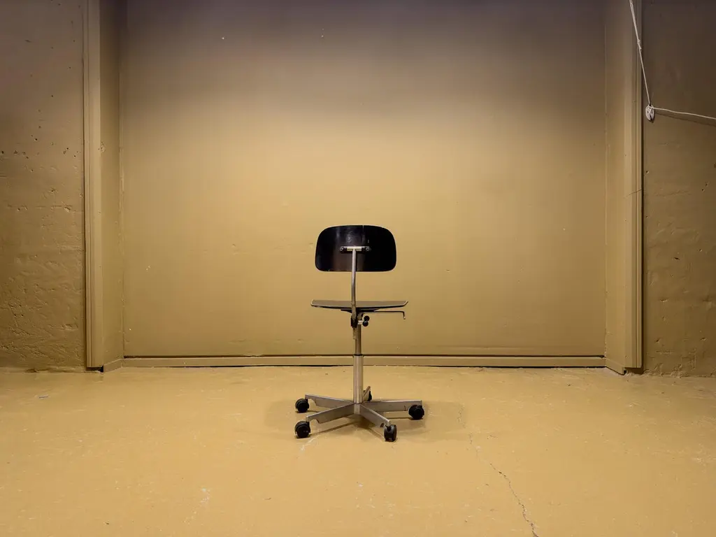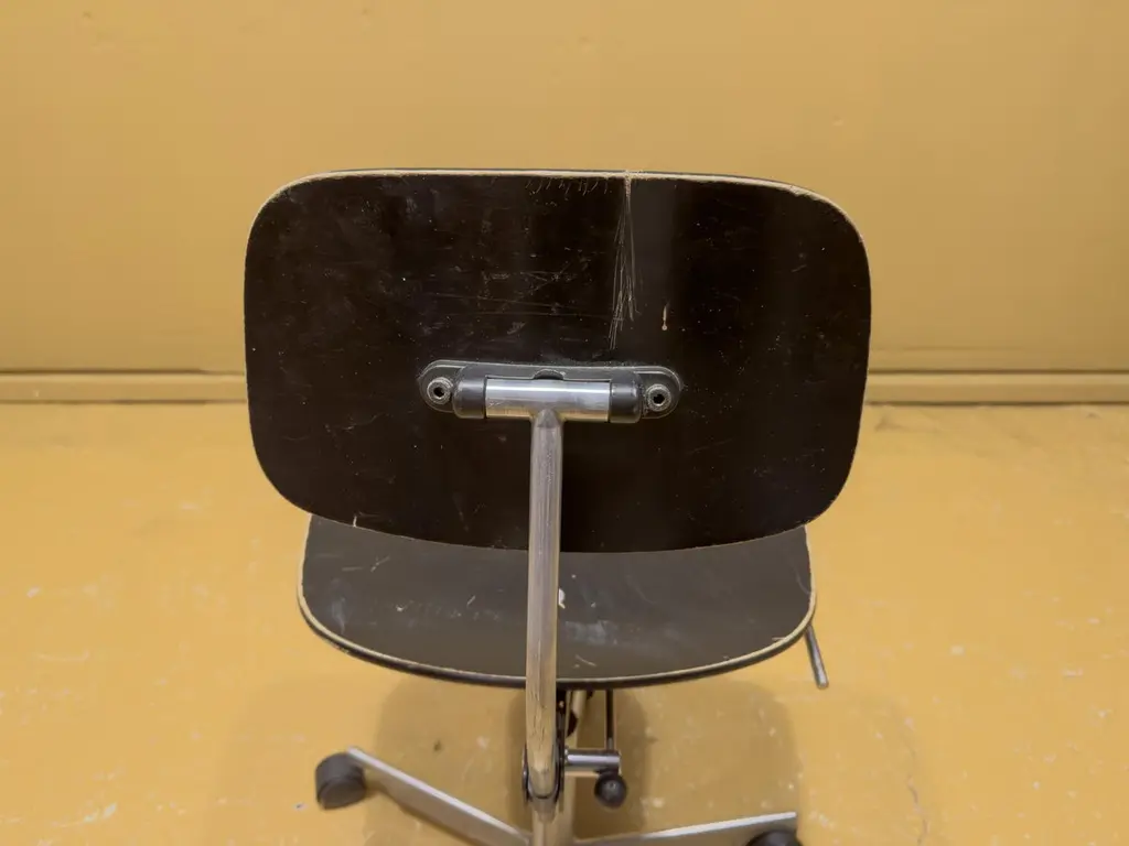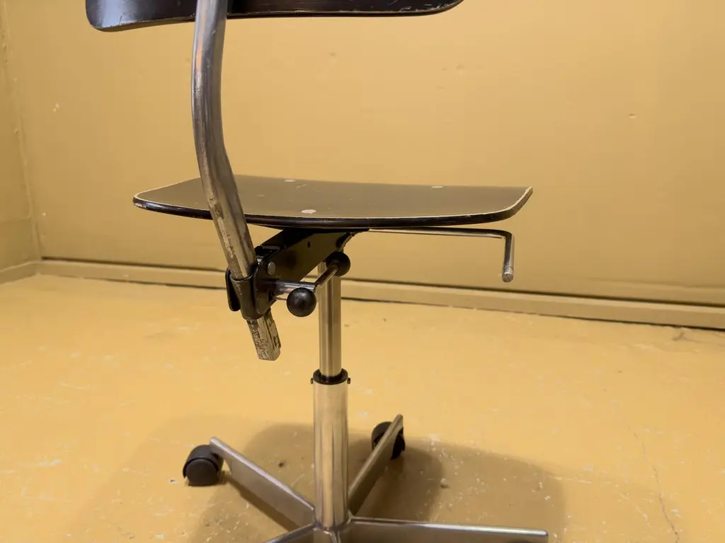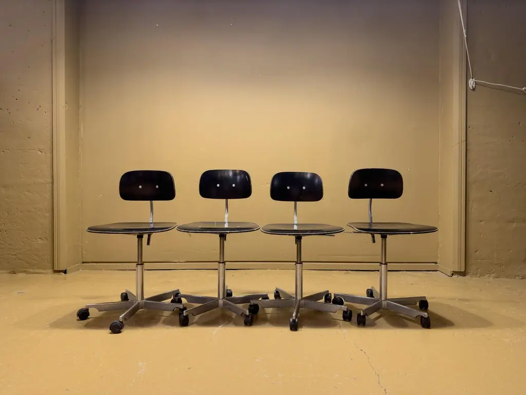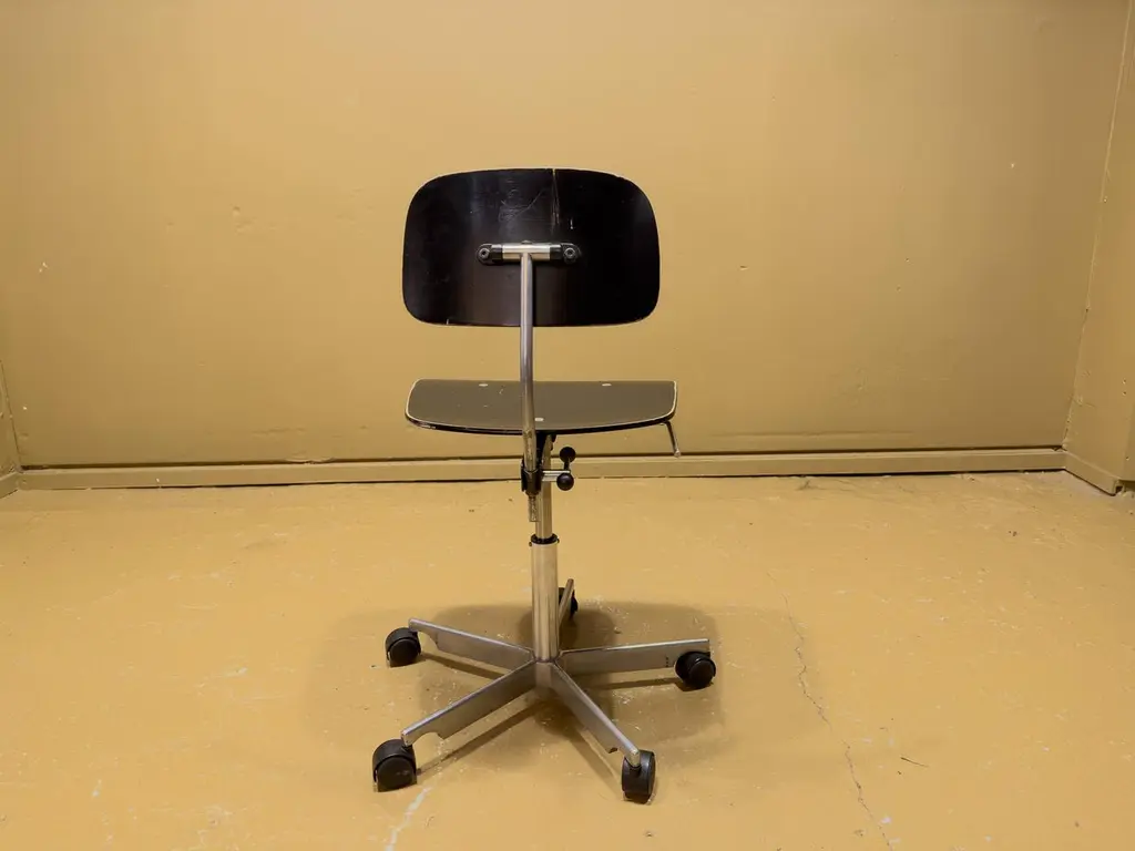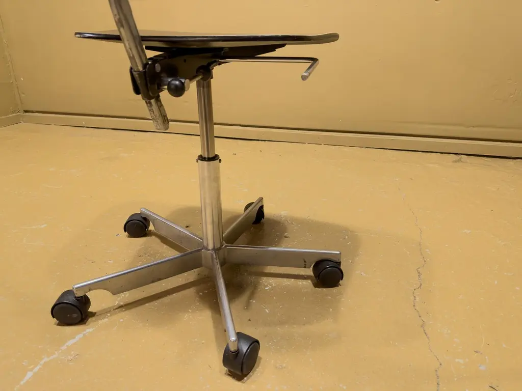 Manufactured by Fritz Hansen starting in 1958, the pioneering addition of double castors to this aluminium and wood veneer desk chair makes it an enduring and ubiquitous design object.The curved backrest provides ergonomic support, while the subtly contoured seat ensures comfort during extended use. The combination of black lacquered wood and polished metal gives these chairs a refined industrial feel oozing with character and timeless charm. Price is per chair, we have three remaining.