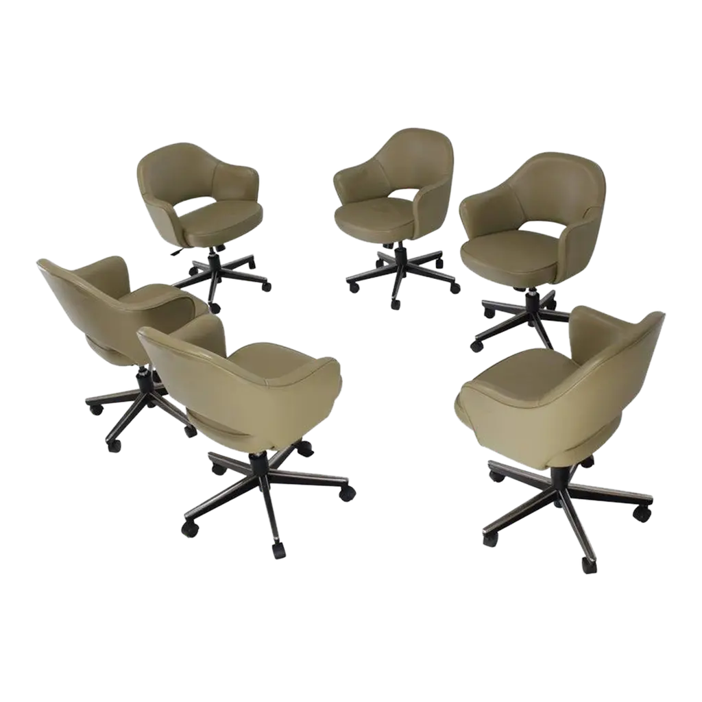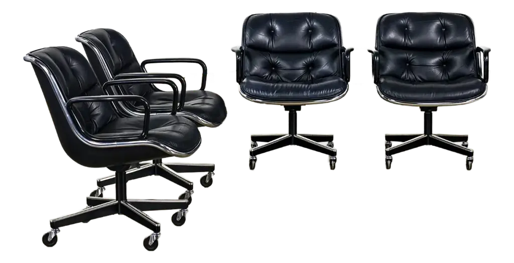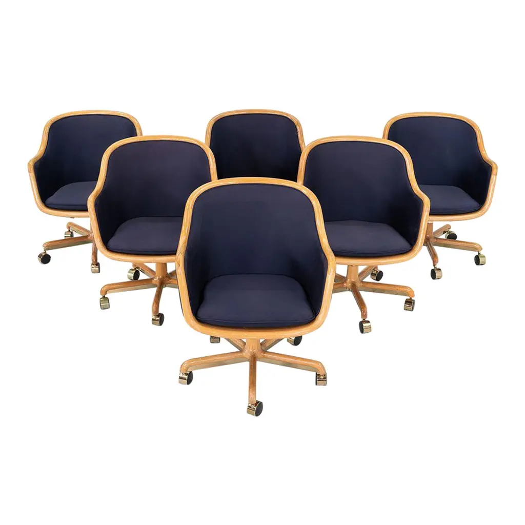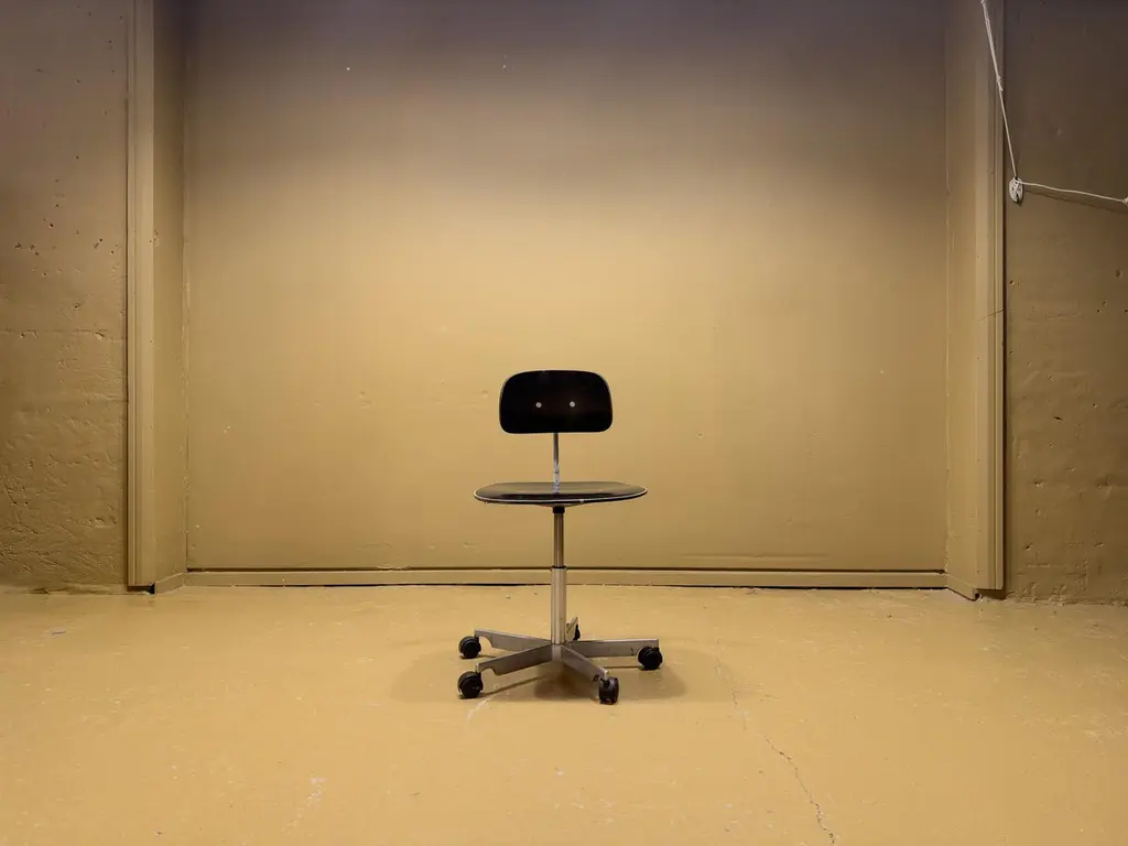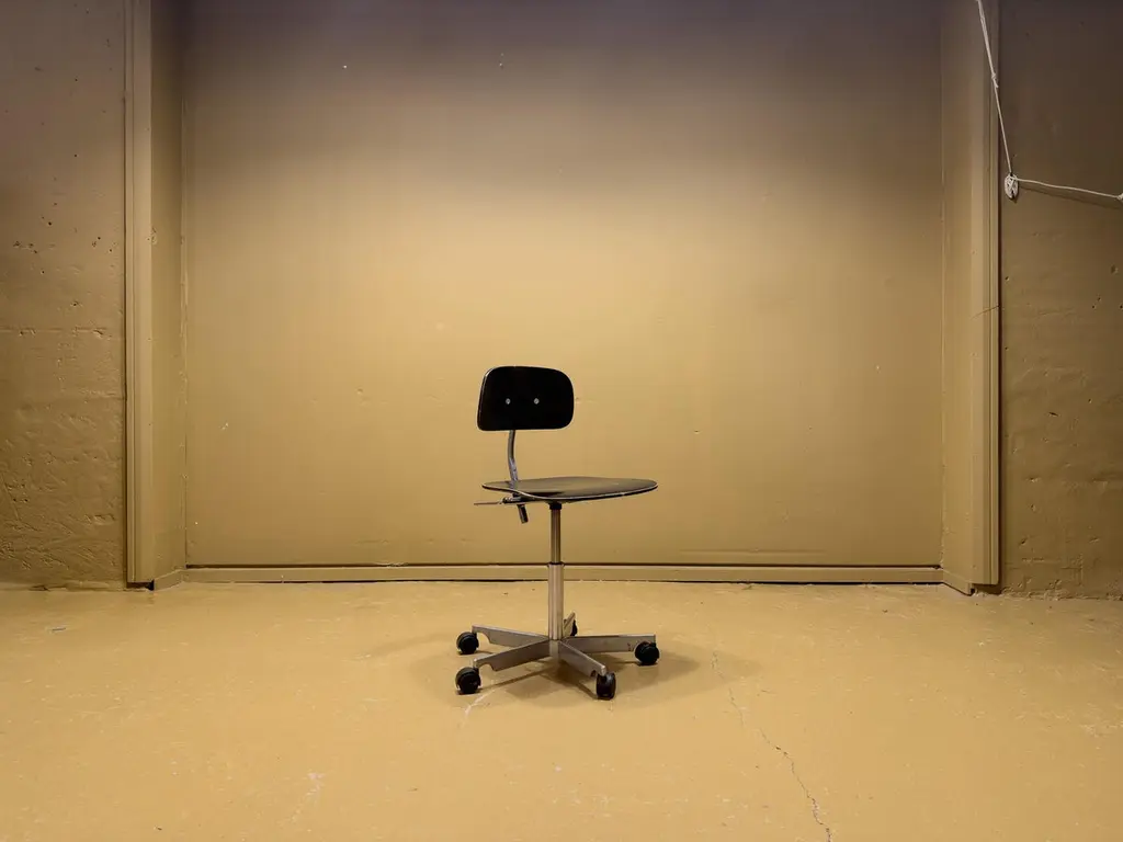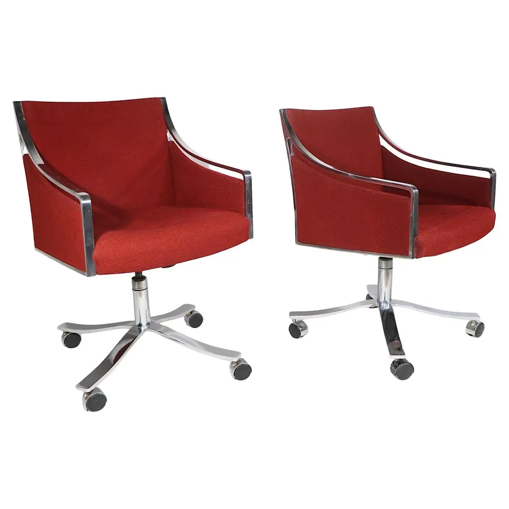 Manufactured by Fritz Hansen starting in 1958, the pioneering addition of double castors to this aluminium and wood veneer desk chair makes it an enduring and ubiquitous design object.The curved backrest provides ergonomic support, while the subtly contoured seat ensures comfort during extended use. The combination of black lacquered wood and polished metal gives these chairs a refined industrial feel oozing with character and timeless charm. Price is per chair, we have three remaining.