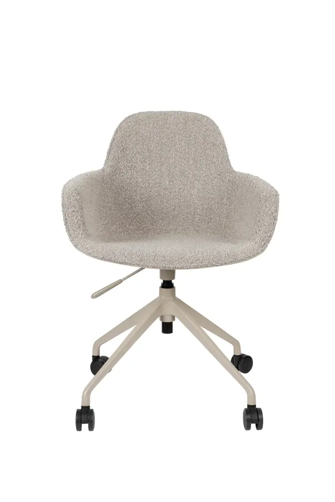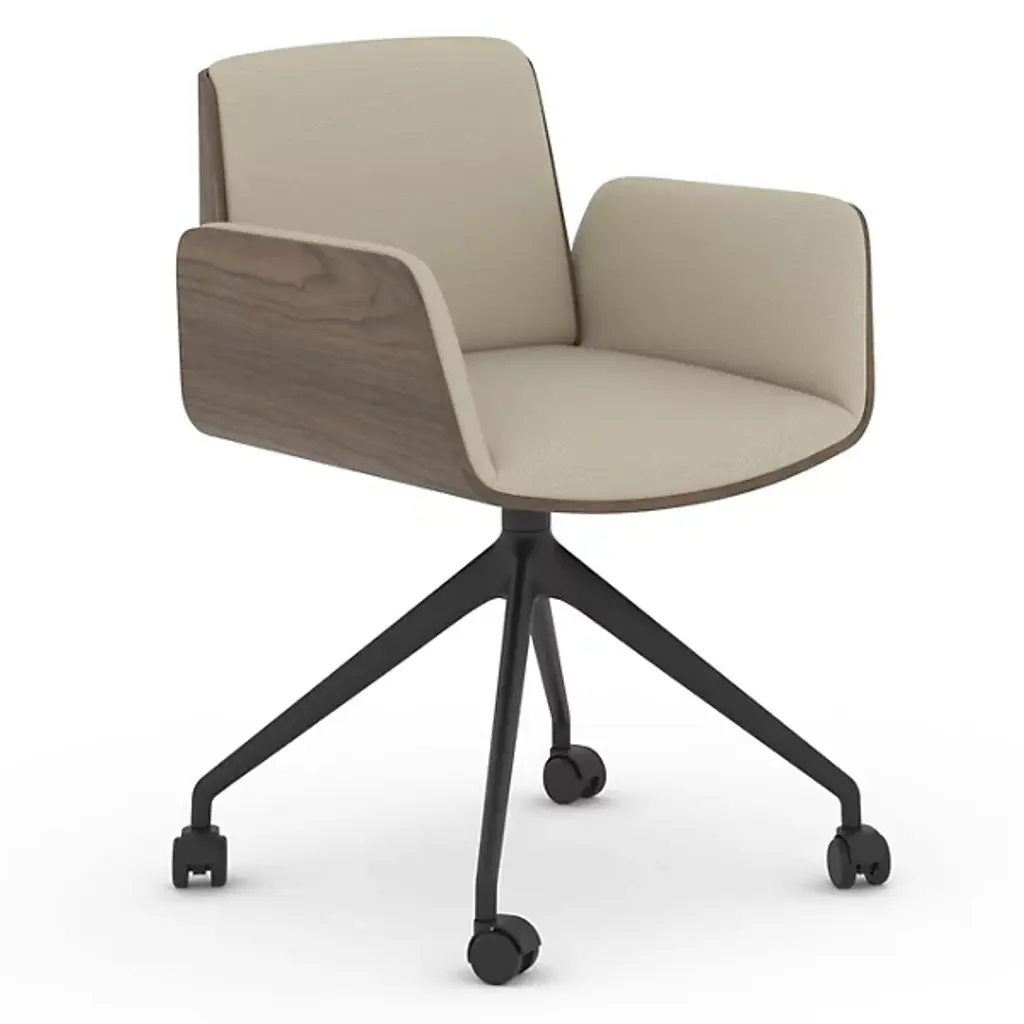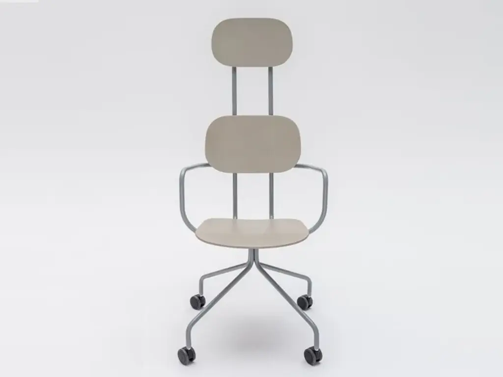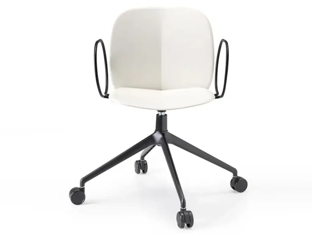 Kay is an office chair with upholstered seat covered in fabric and base on trestle with wheels.The swivel chair Kay, designed by Leonardo Rossano for True Design, comes from the combination of two simple elements of bent plywood. The seat wraps the armrests giving the illusion of the soft padding structural function. The result of this playful use of the materials is a nonchalant elegant chair that can be used in waiting and relax areas in offices or in an office zone in private spaces.