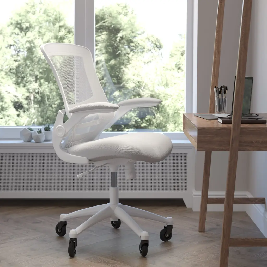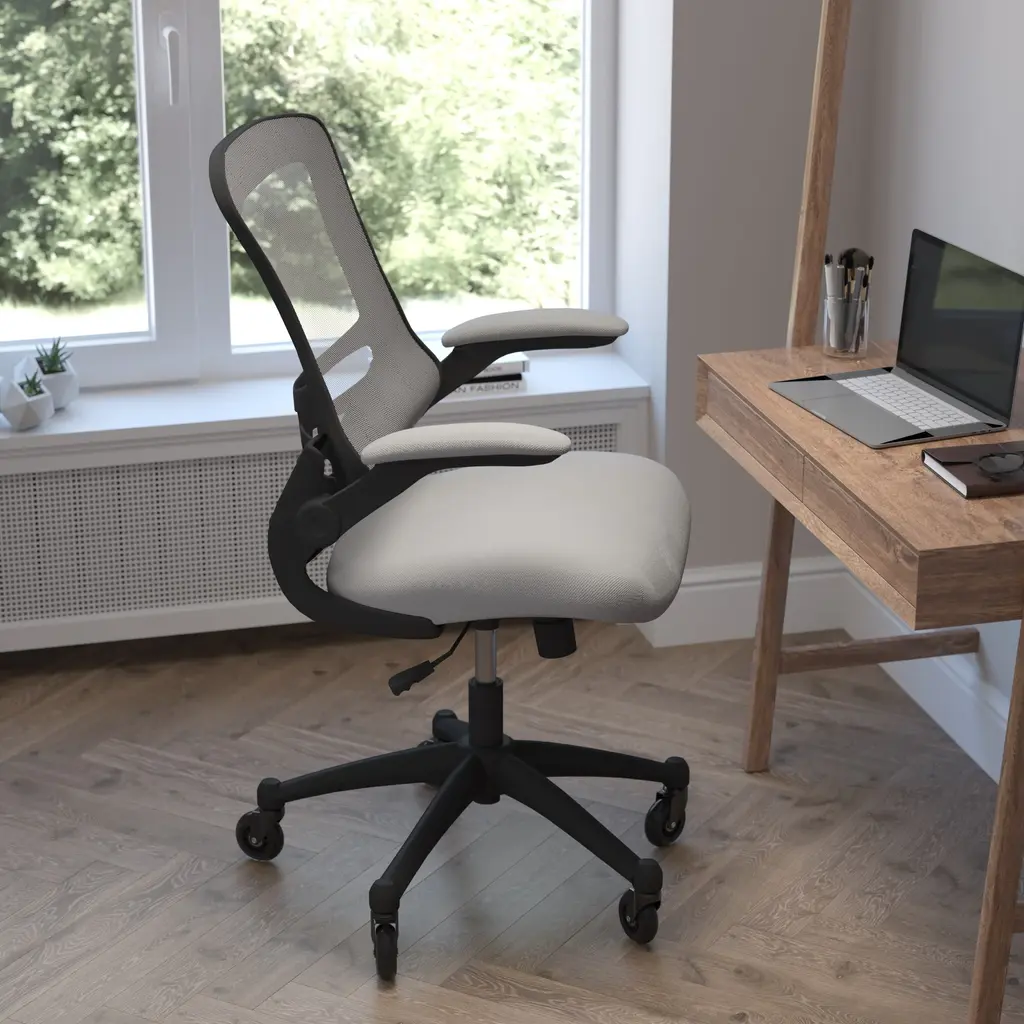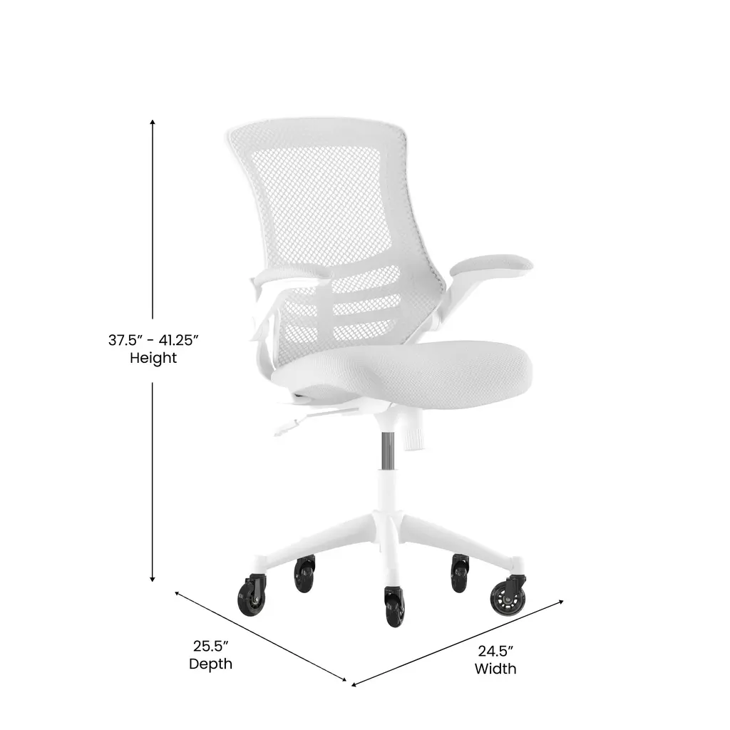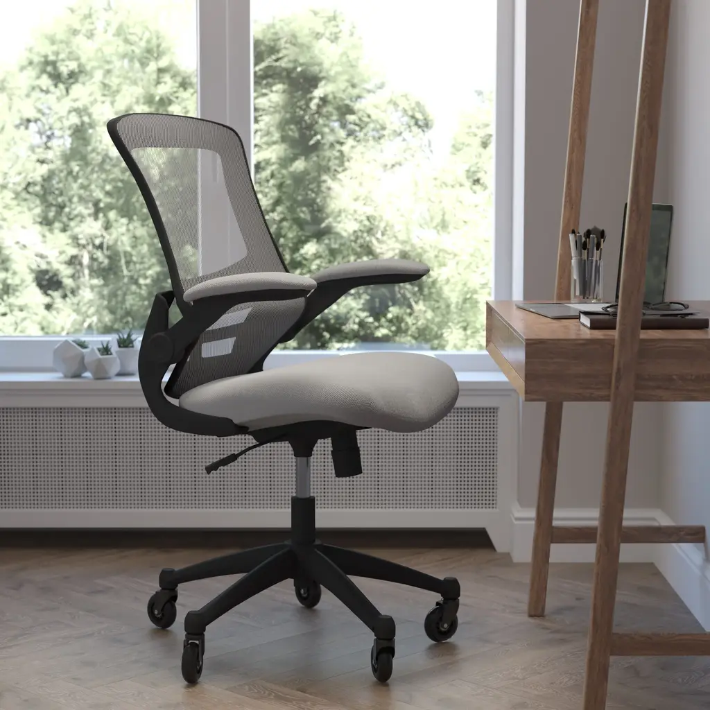 Whether you're working or gaming, be completely comfortable in this ergonomic chair that features transparent, breathable mesh across the back allowing air to circulate to keep you cool. Built-in lumbar support improves your posture and helps prevent back strain and muscle fatigue. Padded flip-up armrests relieves pressure from your shoulders and neck and rotate 90 degrees out of the way so you can move this mesh task chair closer to your desk. The contoured seat is padded with 3" of foam and covered with upholstery. A true asset in any space, this computer chair boasts 360 degree swivel capability paired with rubber skate style wheels with ball bearing motion to access multiple surfaces without strain. The pneumatic seat height adjustment lever allows the seat to raise and lower to each individual's needs. Turn the tilt tension adjustment knob to increase or decrease the amount of force needed to rock or recline. Don't worry about spills from your morning coffee or the lunch you ate at your desk, this mesh office chair with lumbar support cleans easily with a solvent base cleaner, no water needed. Whether it's a day filled with meetings, home office paperwork or marathon gaming sessions, this stylish mid-back swivel task chair with upgraded polyurethane tires will keep you cool and comfortable throughout your busy day.