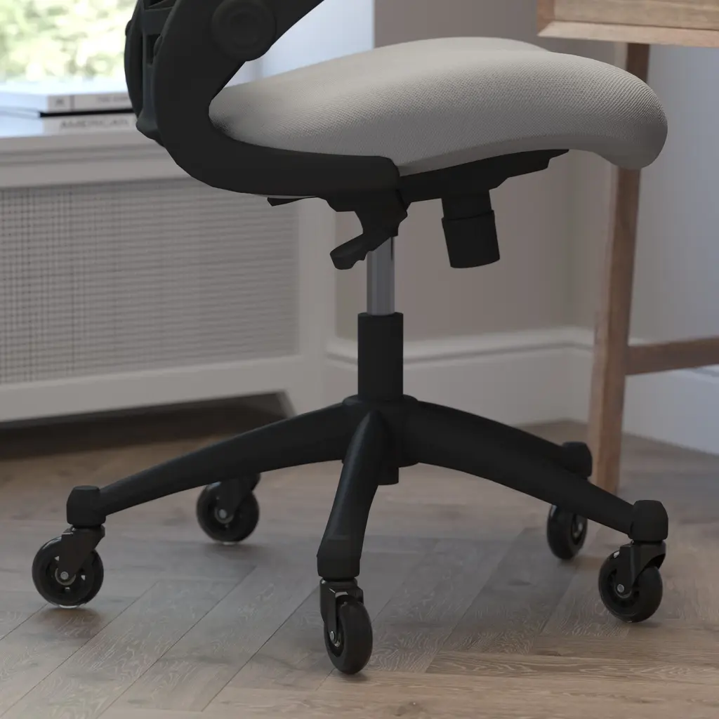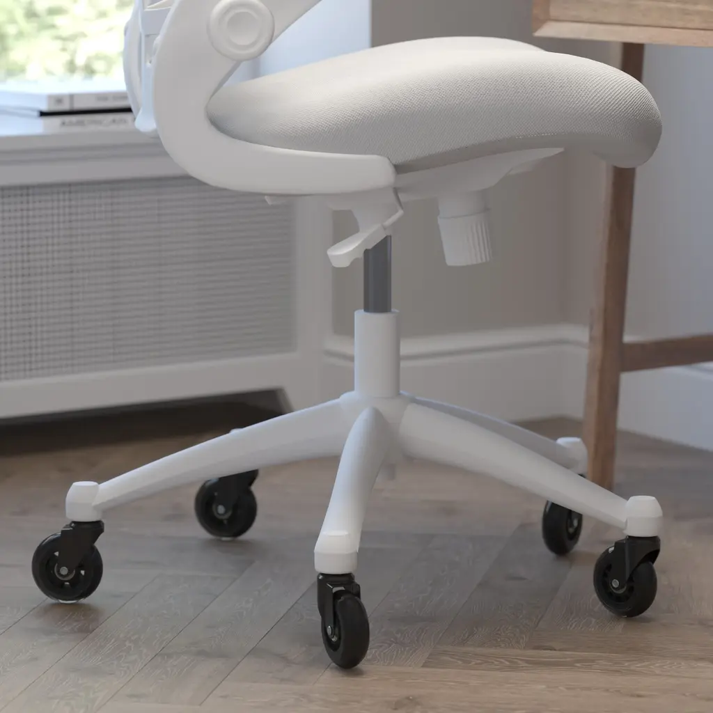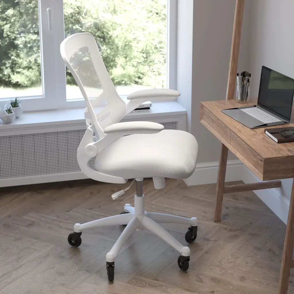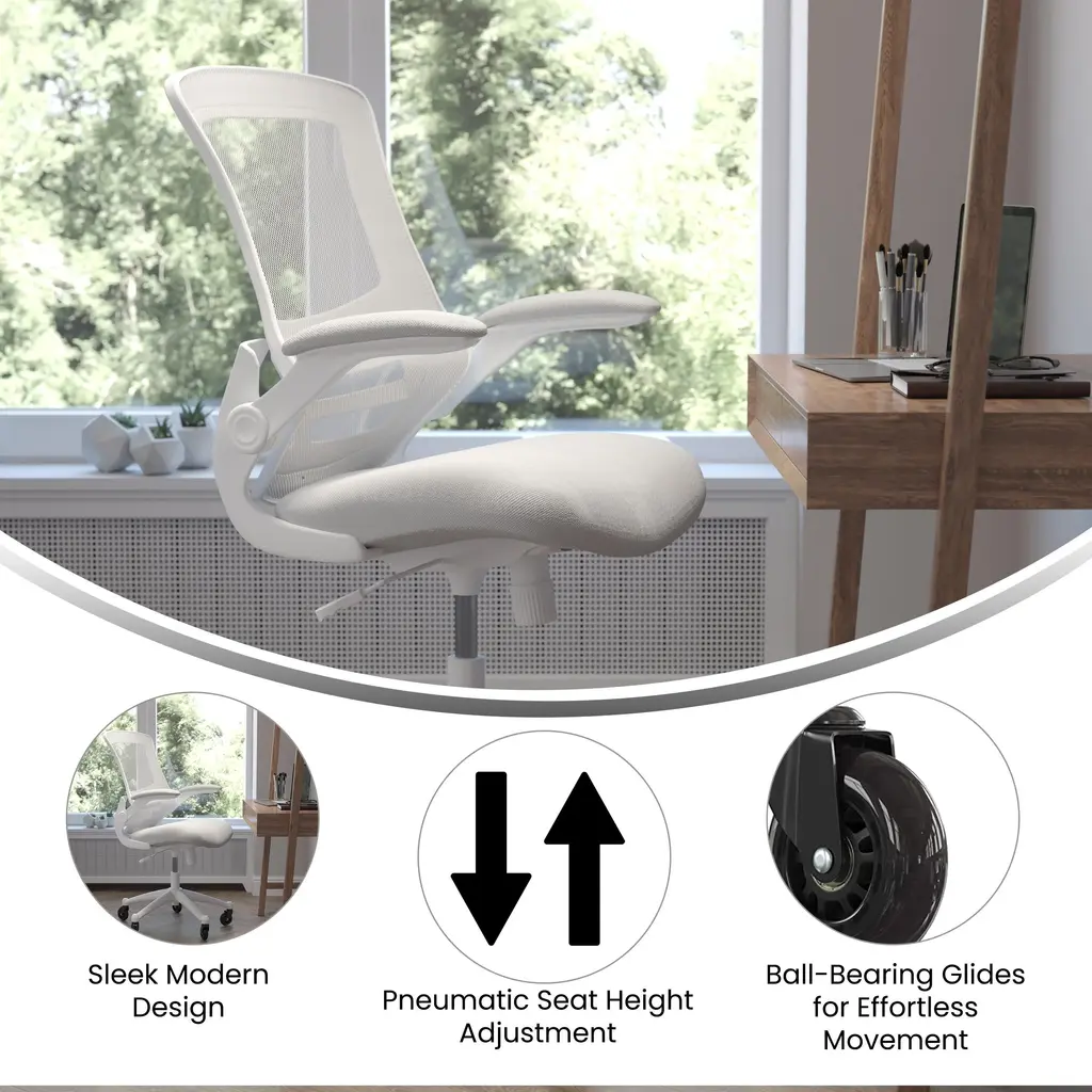 Whether you're working or gaming, be completely comfortable in this ergonomic chair that features transparent, breathable mesh across the back allowing air to circulate to keep you cool. Built-in lumbar support improves your posture and helps prevent back strain and muscle fatigue. Padded flip-up armrests relieves pressure from your shoulders and neck and rotate 90 degrees out of the way so you can move this mesh task chair closer to your desk. The contoured seat is padded with 3" of foam and covered with upholstery. A true asset in any space, this computer chair boasts 360 degree swivel capability paired with rubber skate style wheels with ball bearing motion to access multiple surfaces without strain. The pneumatic seat height adjustment lever allows the seat to raise and lower to each individual's needs. Turn the tilt tension adjustment knob to increase or decrease the amount of force needed to rock or recline. Don't worry about spills from your morning coffee or the lunch you ate at your desk, this mesh office chair with lumbar support cleans easily with a solvent base cleaner, no water needed. Whether it's a day filled with meetings, home office paperwork or marathon gaming sessions, this stylish mid-back swivel task chair with upgraded polyurethane tires will keep you cool and comfortable throughout your busy day.