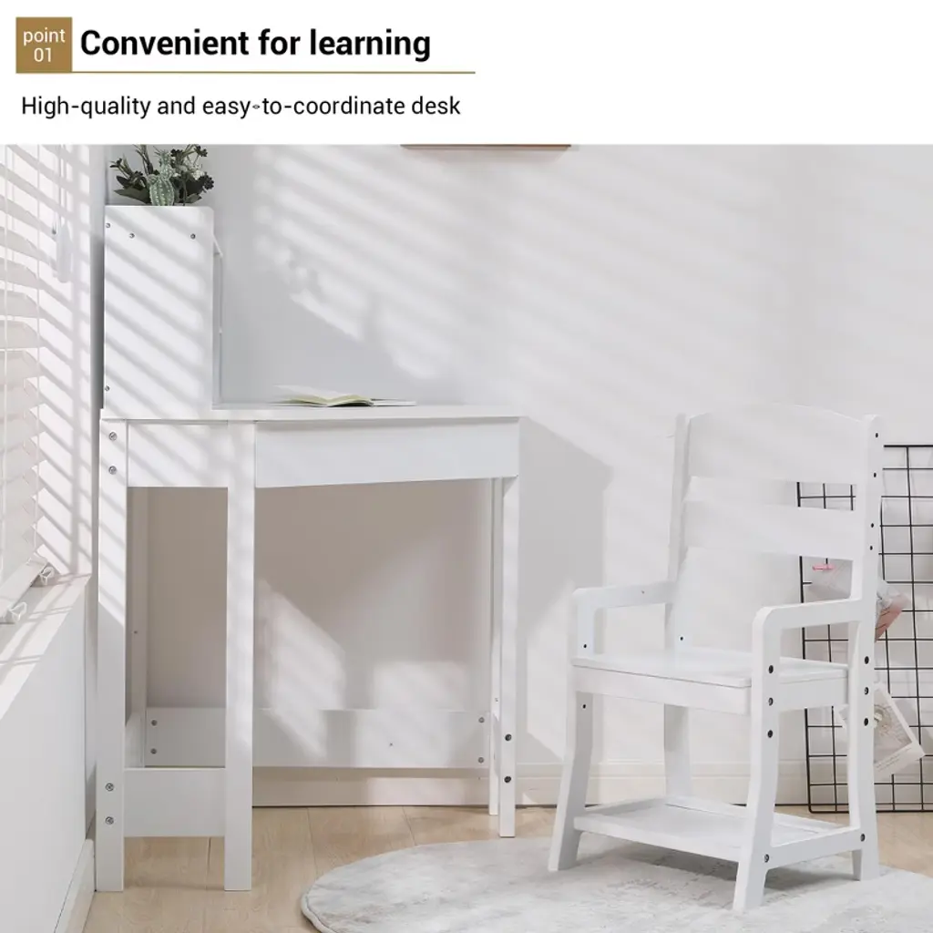 Kids Study Desk and Chair Set, Kids Corner Study Table with Hutch, Adjustable Chair, Cork Board, White Children Desk Chair Set, Wooden Art Table Homework Desk for Boys Girls