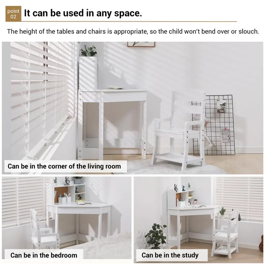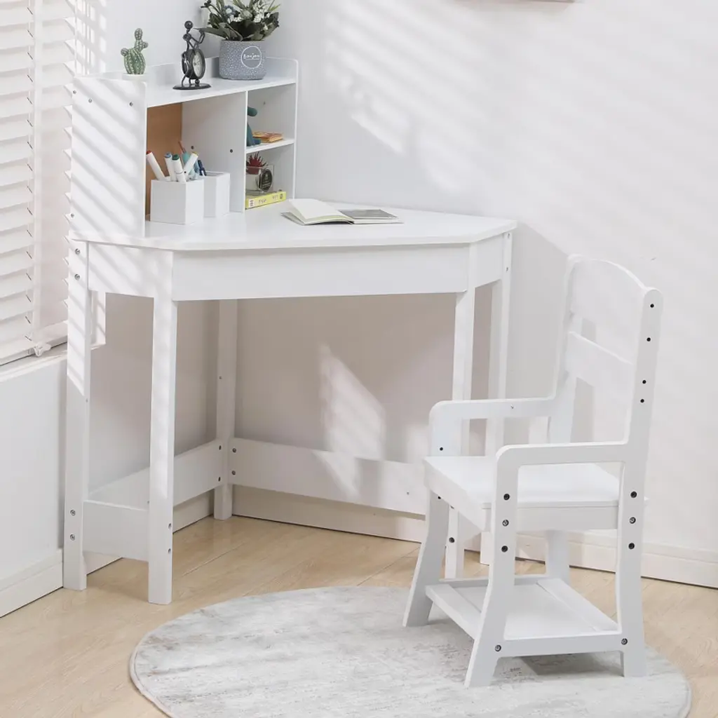 Kids Study Desk And Chair Set, White Corner Table With Adjustable Chair, Hutch, Cork Bulletic Board, Pen Holders, Small Art Table Homework Table Set