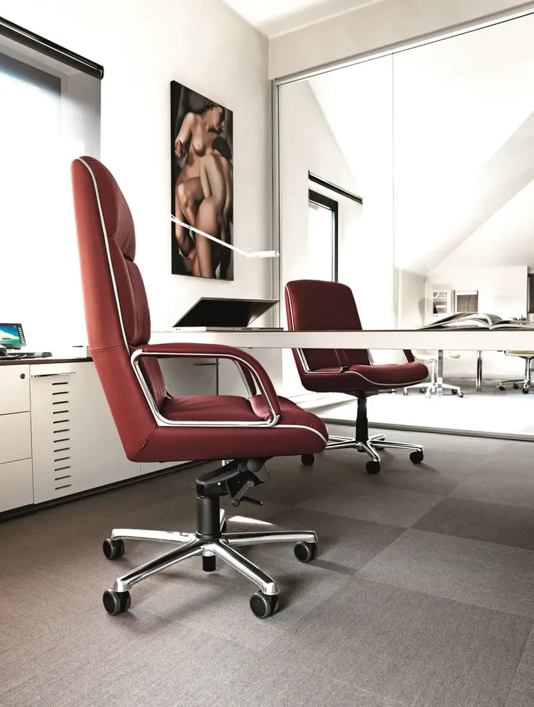 Kiruna Executive is an high back reclining armchair, fixed aluminium armrests with upholstered pads, aluminium base, rubber castors Ø65.Upholstery in fabric or leather.AVAILABLE MODELSKI | Upholstered shell, grey profiled edge KL | Upholstered shell, plain profiled edgeCOLORS & FINISHINIGAvailable in different colors and finishingsCERTIFICATIONSEN 1335