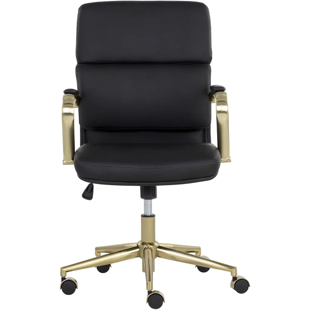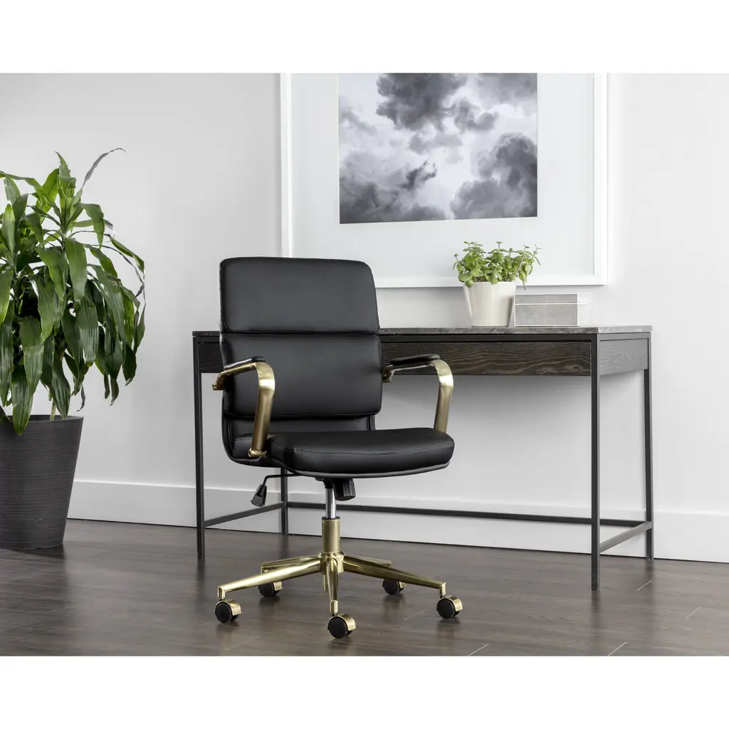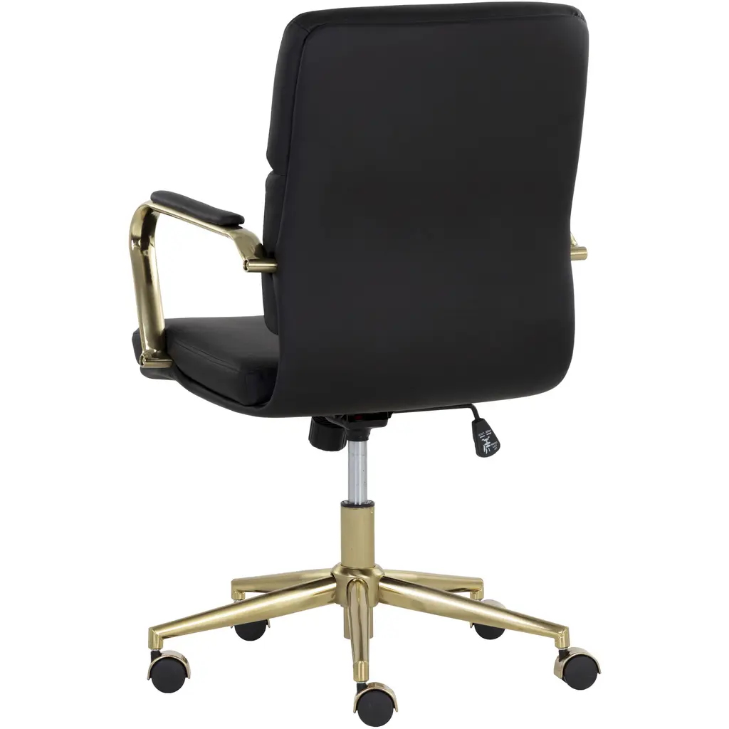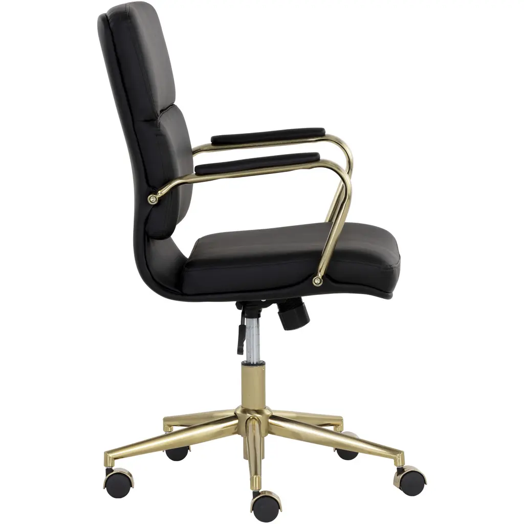 Create a stylish and functional workspace with this stunning modern office chair. Stocked in onyx faux leather and features generously padded seating for optimal comfort. Completed with castors for added mobility, and a gold stainless steel frame. Handle With Care: This design has been crafted with faux leather. Faux leather is manufactured to reflect the natural characteristics of leather as such, colour variations, markings wrinkles, grooves, and light scratches are appreciated characteristics. No two pieces will be alike. Visit our Product Care page for more information on how to ensure the lasting beauty of this piece.