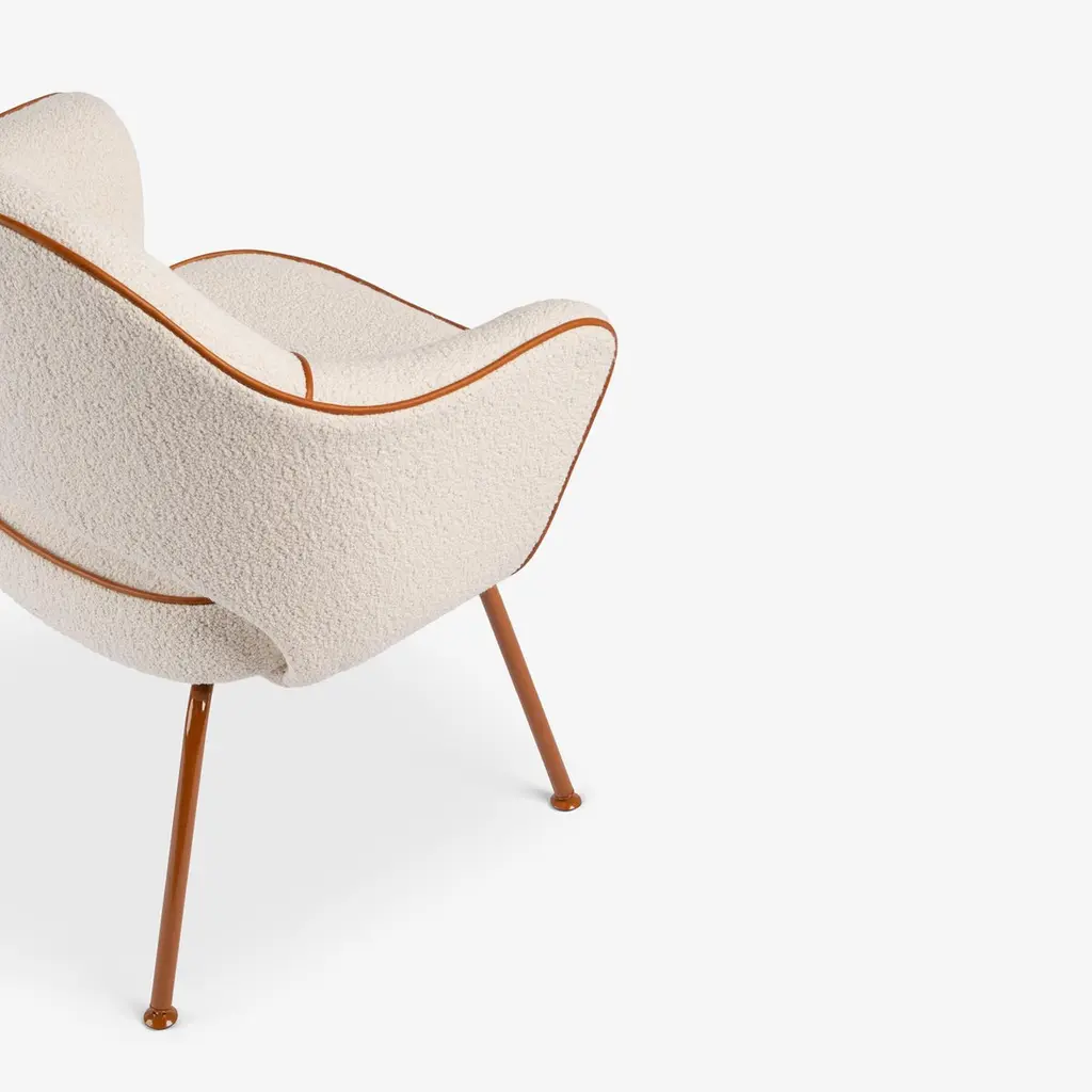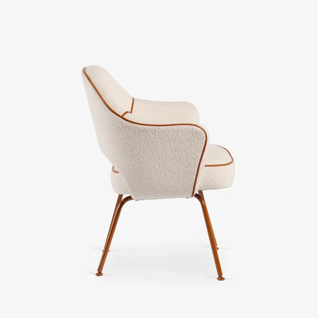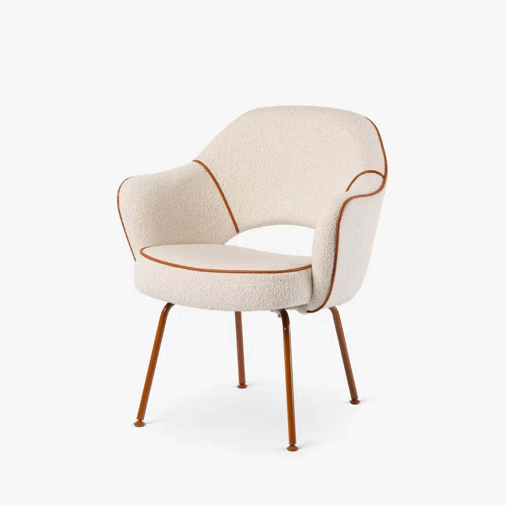 Eero Saarinen’s career, though brief, left an indelible mark on both furniture design and architecture. His work was visionary, bridging disciplines and redefining how design could harmonize with the human form. Among his many contributions, the Saarinen Executive Chair remains one of his most enduring and recognizable creations, celebrated for its sculptural beauty and everyday usability.The Saarinen Executive Arm Chair is a quintessential piece of the Mid-Century Modern movement, known for its versatility and comfort. Its graceful curves invite the sitter to relax, while the subtle flexibility of the open back provides just the right amount of give. As with all of Saarinen’s work, the chair feels as much a sculpture as a functional object, elegant from every angle.Our team selected an Italian bouclé in Ivory, a textured yet exceptionally soft fabric that highlights Saarinen’s sculptural curves. To further define the chair’s silhouette, we added piping in Italian leather and finished the hardware with a glossy Terracotta coat. Together, these details bring a 75-year-old design into a fresh and inviting light. The result is a timeless piece elevated by some of the finest materials.We have quantity of this Saarinen Executive Arm Chair as shown in Bouclé and Terracotta. These are priced per chair, and you may select the number of chairs for your order. Feel free to contact us to discuss quantities, a combination of Arm and Armless Chairs, or with any questions at all.