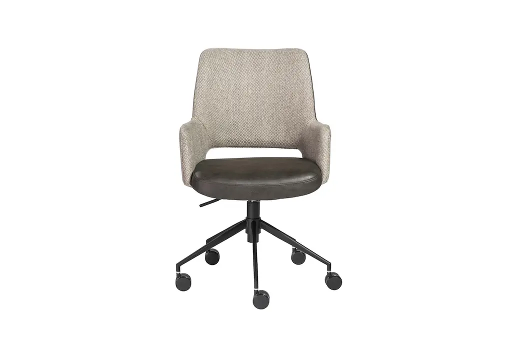 The Kopervik Light Grey Two Tone Upholstered Desk Chair With Tilt is a stylish and modern addition to any office space. This chair features casters, wheels, gas lift, swivel, and rolling capabilities, making it both functional and comfortable.