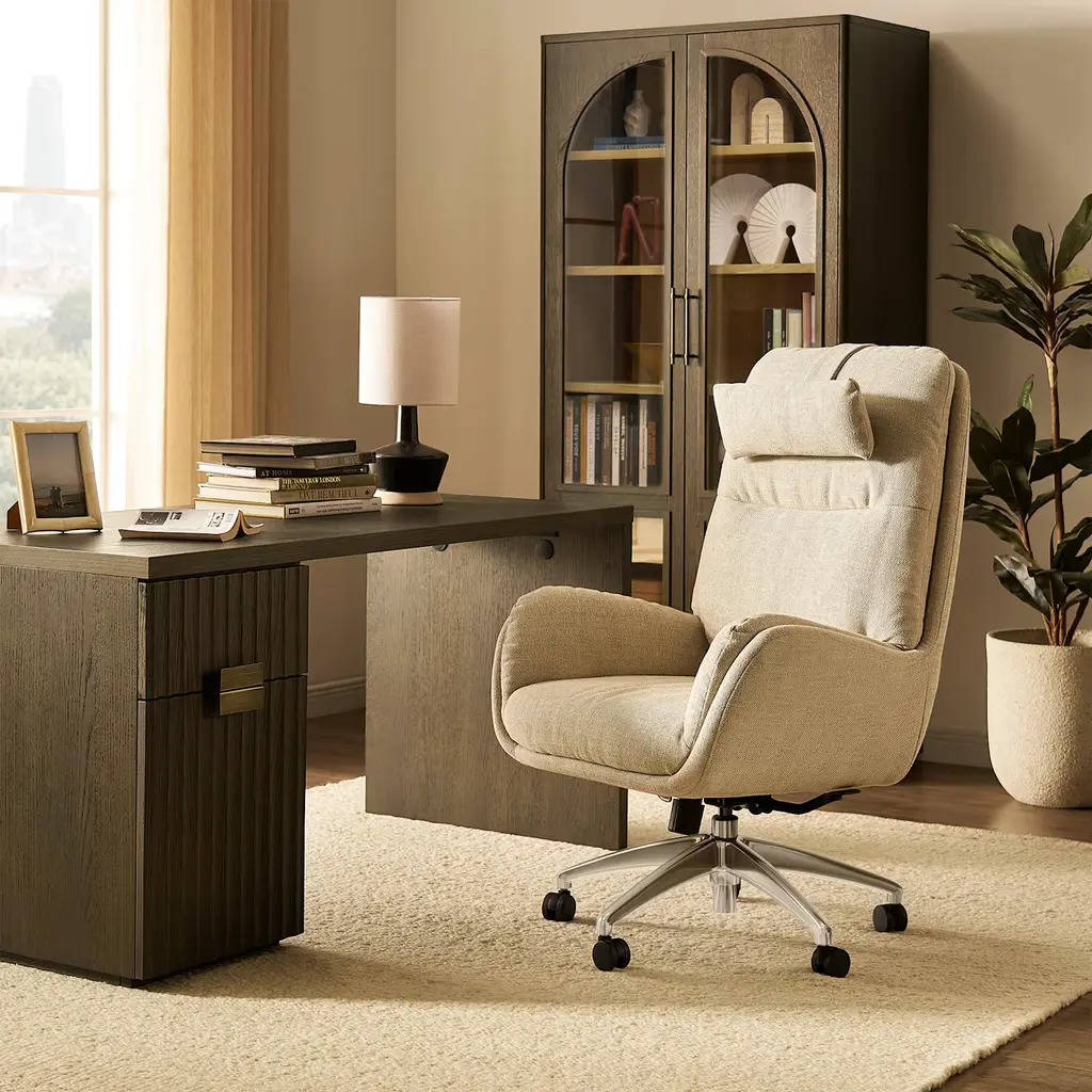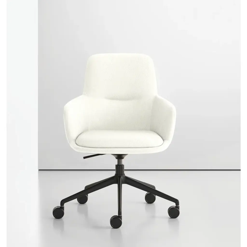 The Kylo chair was designed with comfort in mind, resulting in a swivel with a cozy shell that envelops. Kylo is available as a low-profile mid-back or a high-back for added support. The sleek design highlights rounded curves and gentle lines. Kylo is supported by a five-star polished aluminum or matte-black base with dual-wheel casters. The chair features a swivel tilt mechanism and pneumatic lift for adjustable heights.