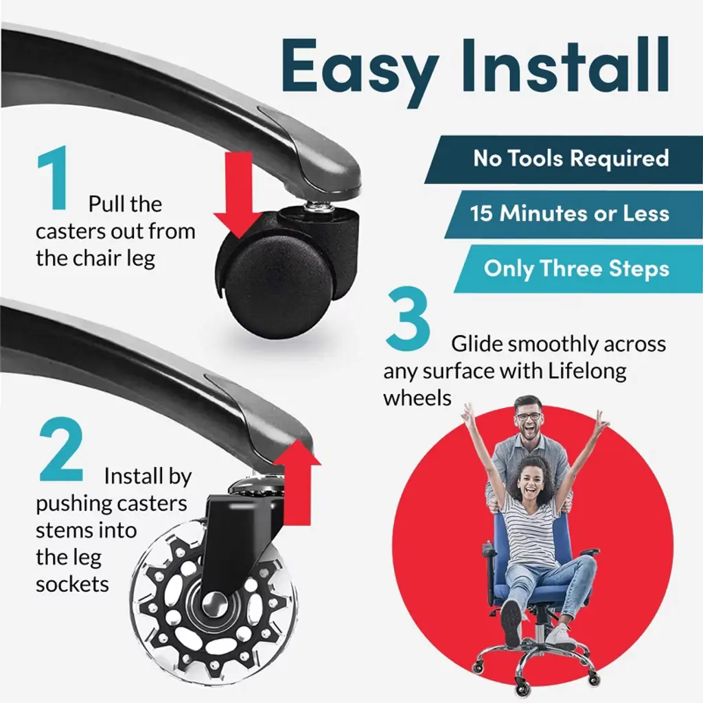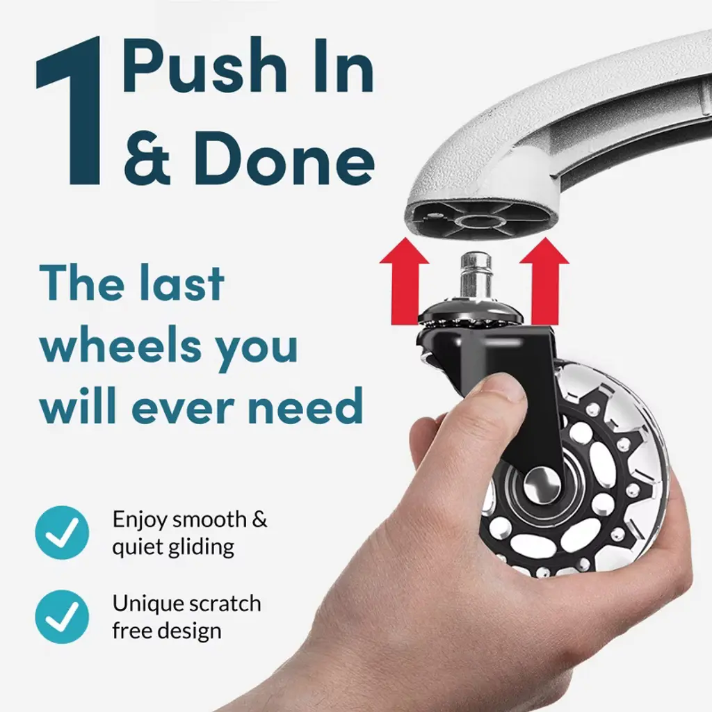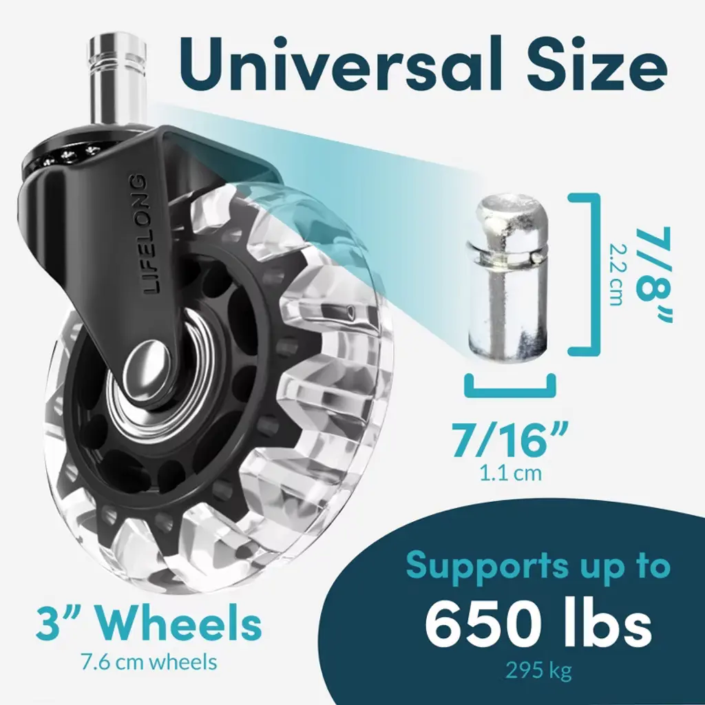 Lifelong Wheels stem chair casters protect floors from scratches and marks on any surface, including hardwood, tile, laminate, carpet, mats, concrete, stone, and vinyl. Enjoy effortless and whisper-quiet rolling. High grade steel, precision ball bearings, and durable polyurethane make these office chair wheels heavy duty and long lasting. Perfect for computer desk chairs, conference rooms, drafting, cubicle, reception, and executives. Compatible with Herman Miller Aeron, Humanscale Freedom, dxracer gaming, Hon, Gaiam, Serta, Lane, Ergonomic, Thomasville, Angelo, Brylane, Broyhill, Eames, Alera, Eames, Staples, and more.