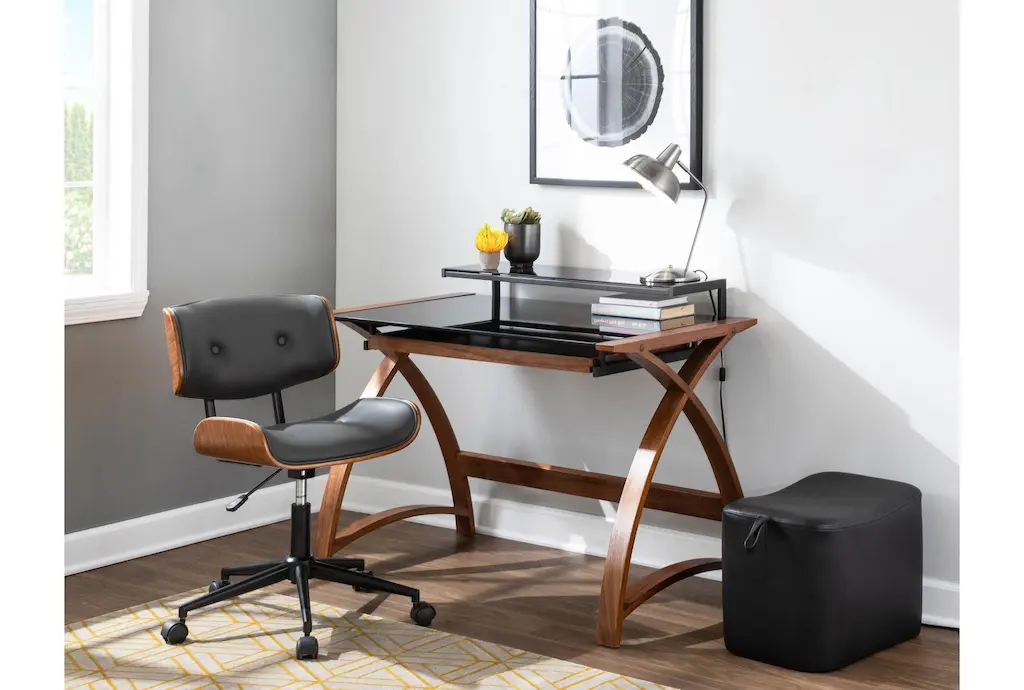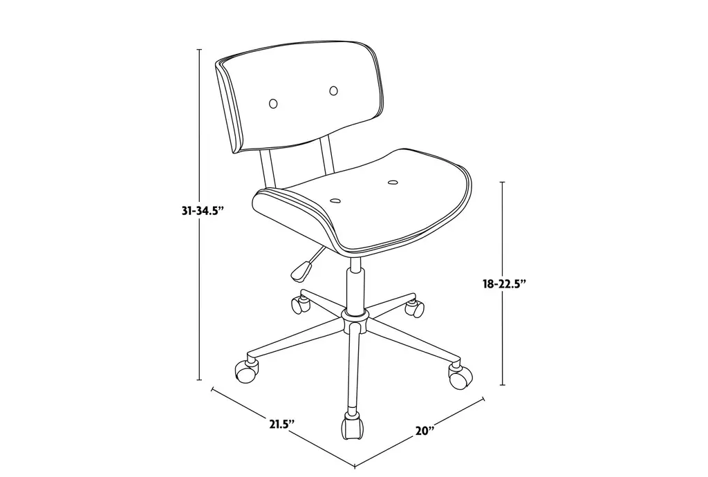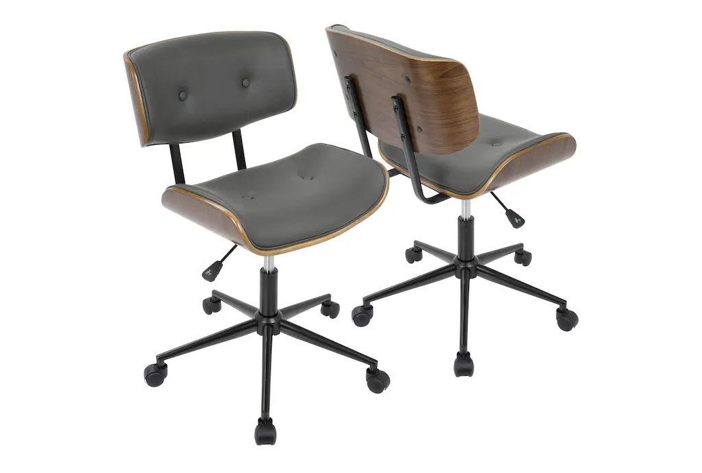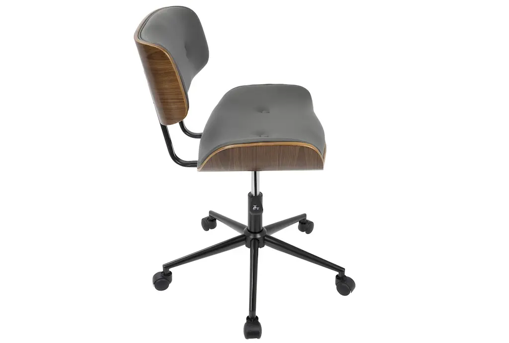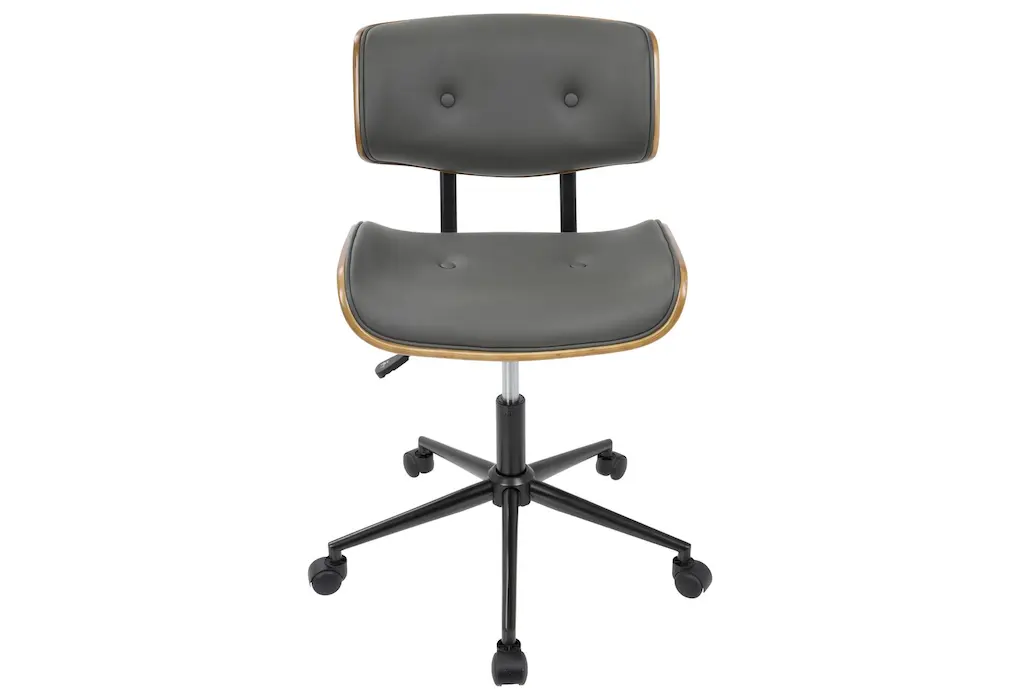 Experience comfort and style with the Linnea Walnut Brown Grey Faux Leather Swivel Adjustable Rolling Wood Office Desk Chair. This modern, armless chair is designed with ergonomics in mind, ensuring you remain comfortable throughout your workday. The combination of walnut brown and grey faux leather adds a sophisticated touch to any office or study space.