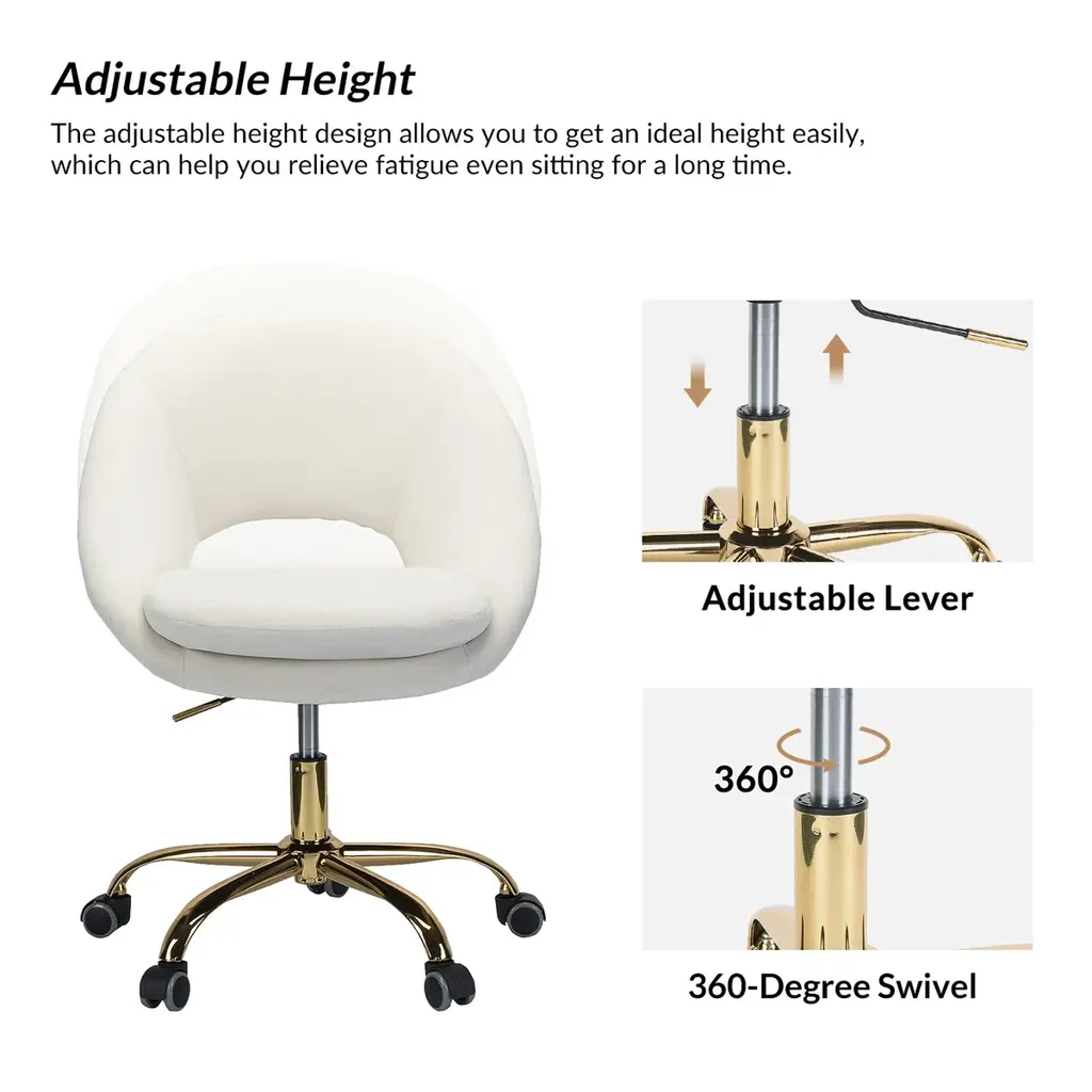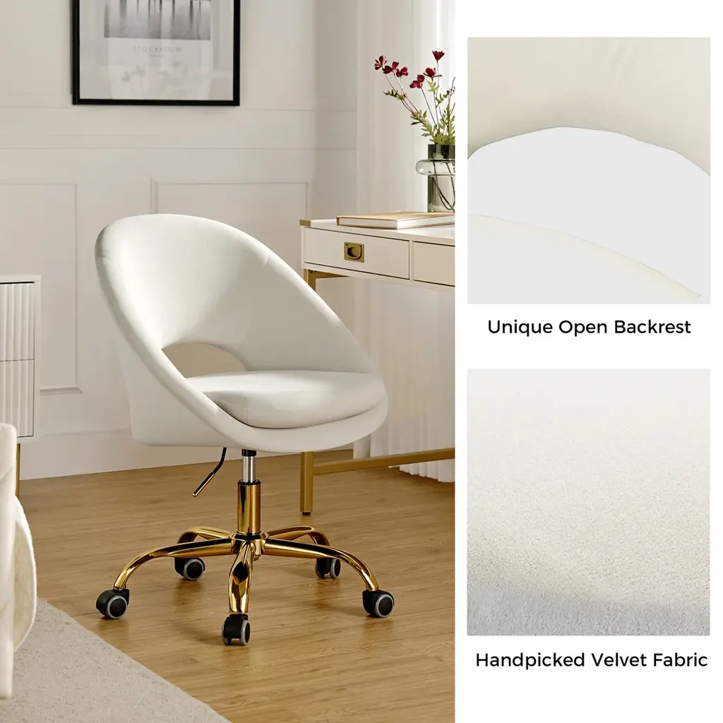 About This Product Modern and stylish, this desk chair is just what your home office needs. It showcases a rounded open back that surrounds a circular seat cushion. Upholstered in velvet, it comes in a variety of solid tones that easily goes with your preferred color scheme. Five metal legs are in a glam gold finish, and they're capped off with casters for hassle-free movement from task to task. A height-adjustable seat and a 360° swivel make it a cinch to WFH in style. Hand-curated by Kelly Clarkson. Features Product includes: One (1) mid-century modern task chair Upholstered with premium velvet fabric, comfortable for skin touch High-density foam filling with a metal and manufactured wood frame provide comfort and support Simple assembly: Just attach legs as assembly instruction