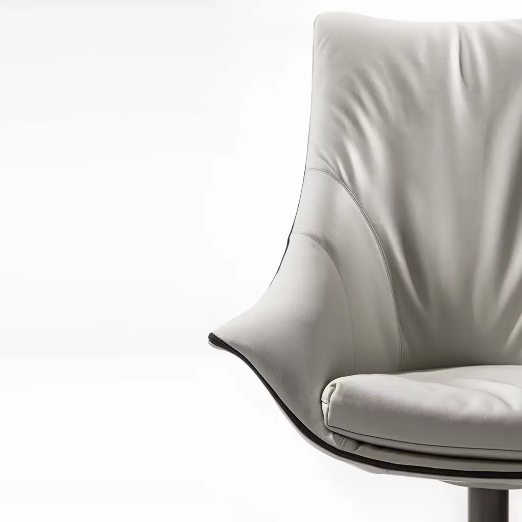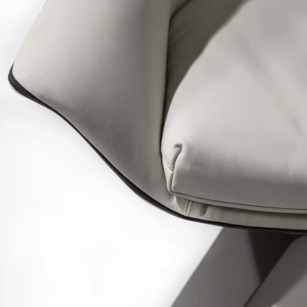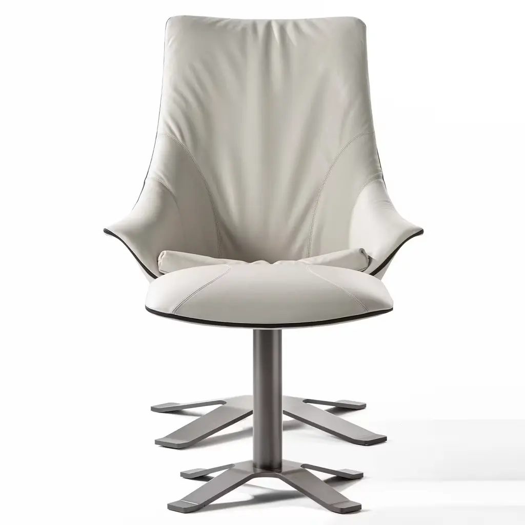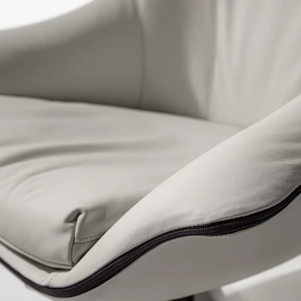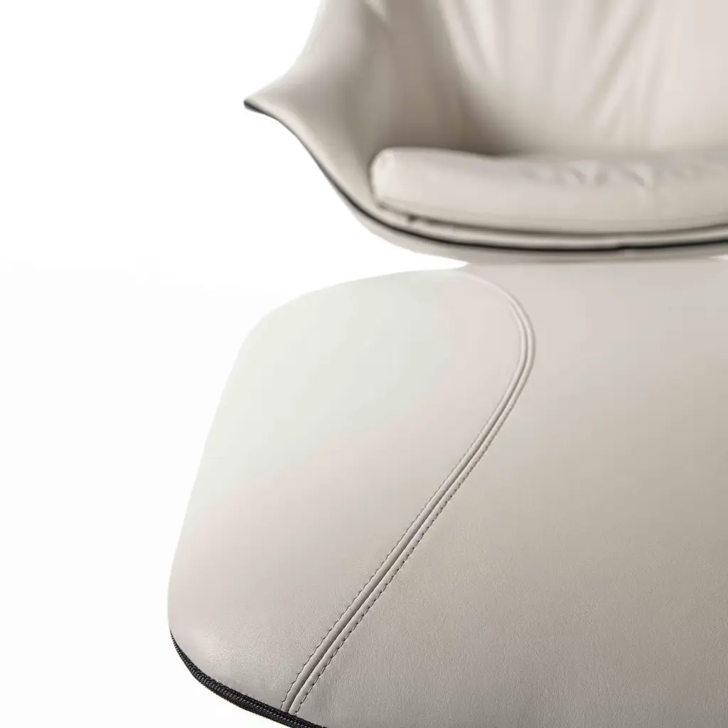Prioritizing comfort without compromising on comfort, this armchair is the epitome of modern elegance. Sporting an all-white look, the polyurethane shell with a tall back and slightly flared armrests is supported by a 4-star fixed base and upholstered inside with fine leather (built-in seat cushion included). Customization is available in several colors both for the base and upholstery (also in leather, eco-leather, and client's fabric). Pouf not included but available for purchase separately, please inquire with the Concierge.