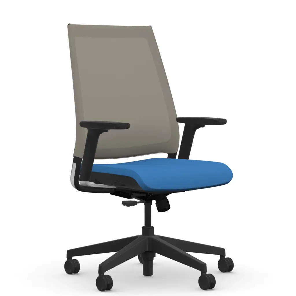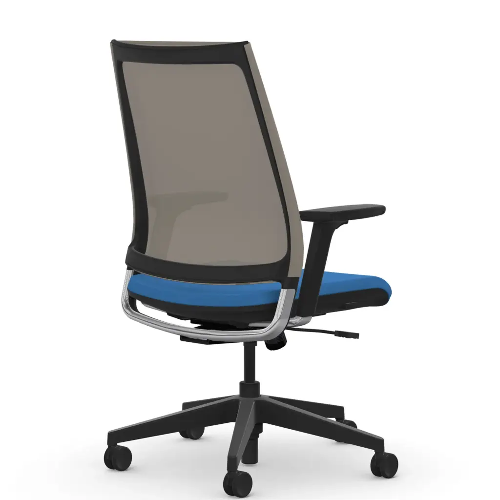 Clean, contemporary styling with distinctive aluminum accents. Advanced ergonomic features that support healthy posture. 4-way height/width adjustable arms. Simple synchro control has an upright back lock, center knob for back recline tension, pneumatic height adjustment, and 360° swivel. Seat adjustment to fit a wide range of body types. Choose from 10 seat colors in our contract-grade, bleach cleanable (10:1 solution) and extra durable Vivid fabric