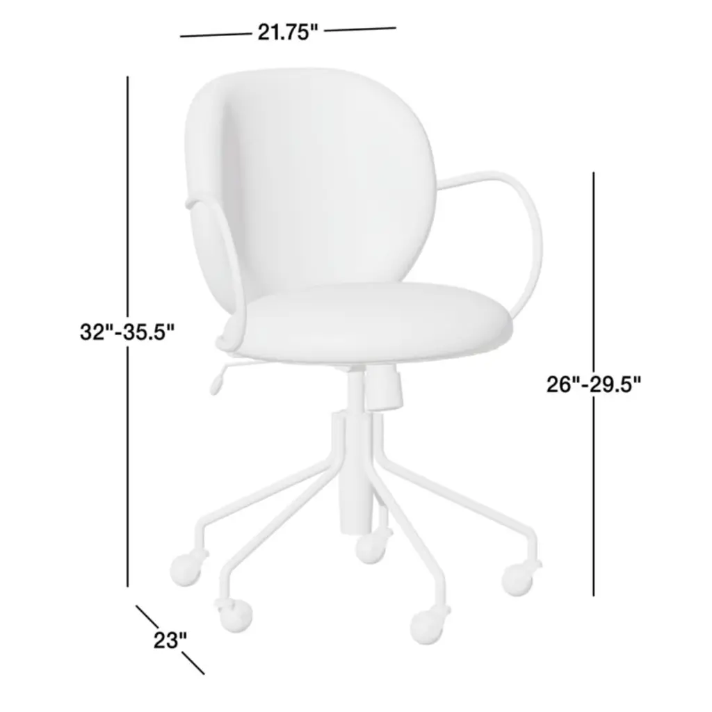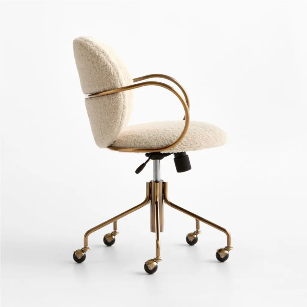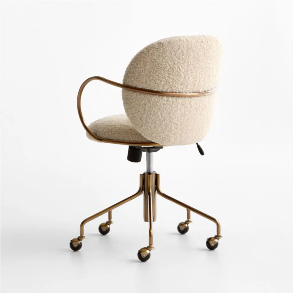 Where home-office comfort meets celestial inspiration. Our Luna office chair beckons with rounded forms and plush embrace of soft, boucle upholstery. A contoured oval back and cushioned seat fashion a comfortable sit, while the tubular frame loops armrests that wrap around the back. A burnished brass finish on the frame and caster base provide a warm complement to the ivory upholstery.