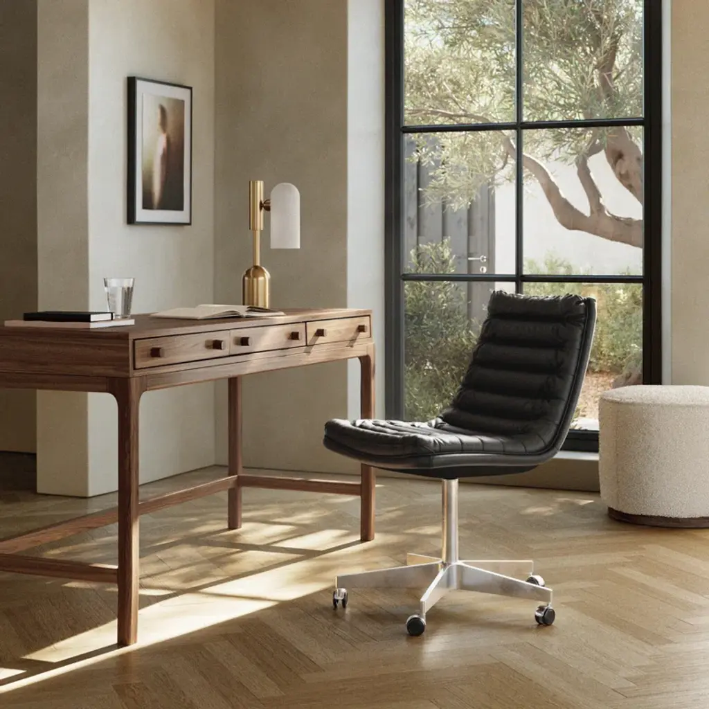 Taking a cue from mid-century office style, tan-colored top-grain leather ensures total comfort. Shiny steel casters for ease in the workplace. Height not adjustable.