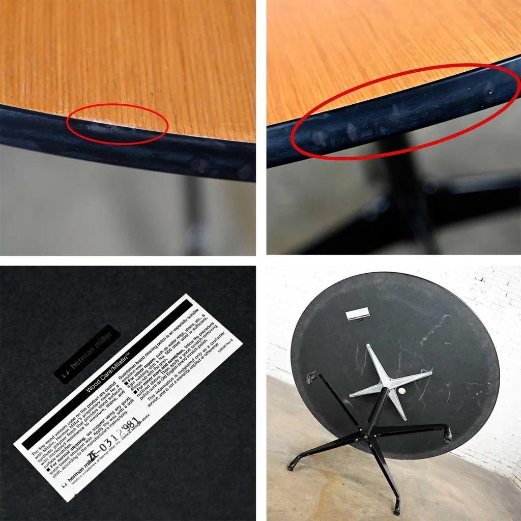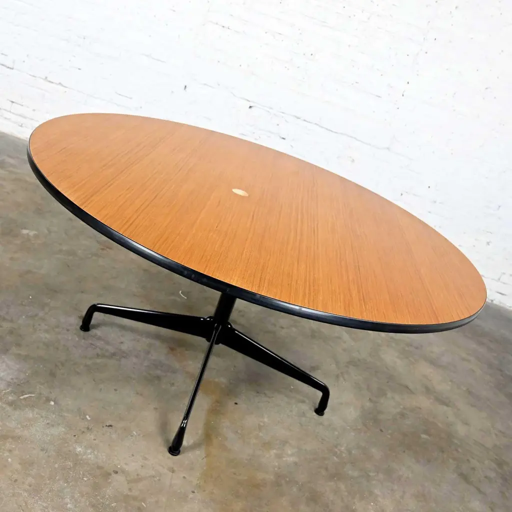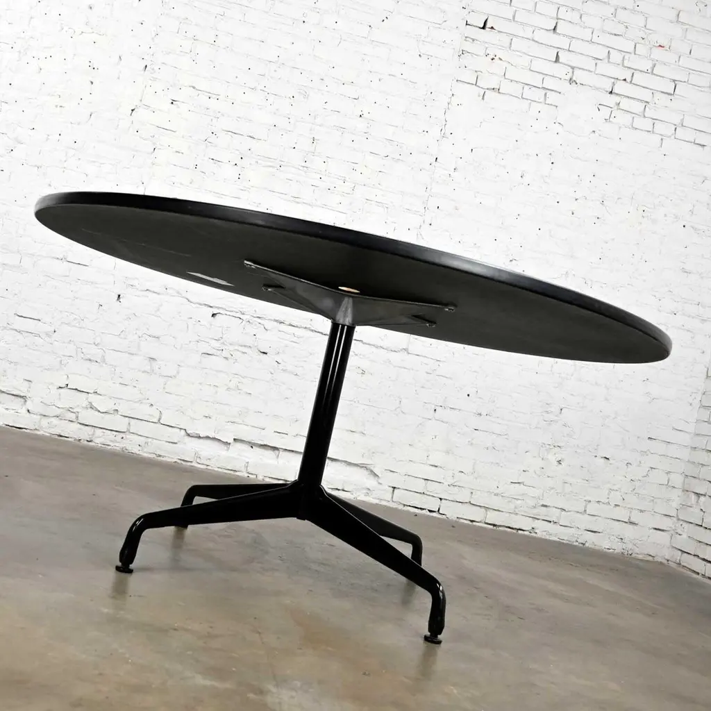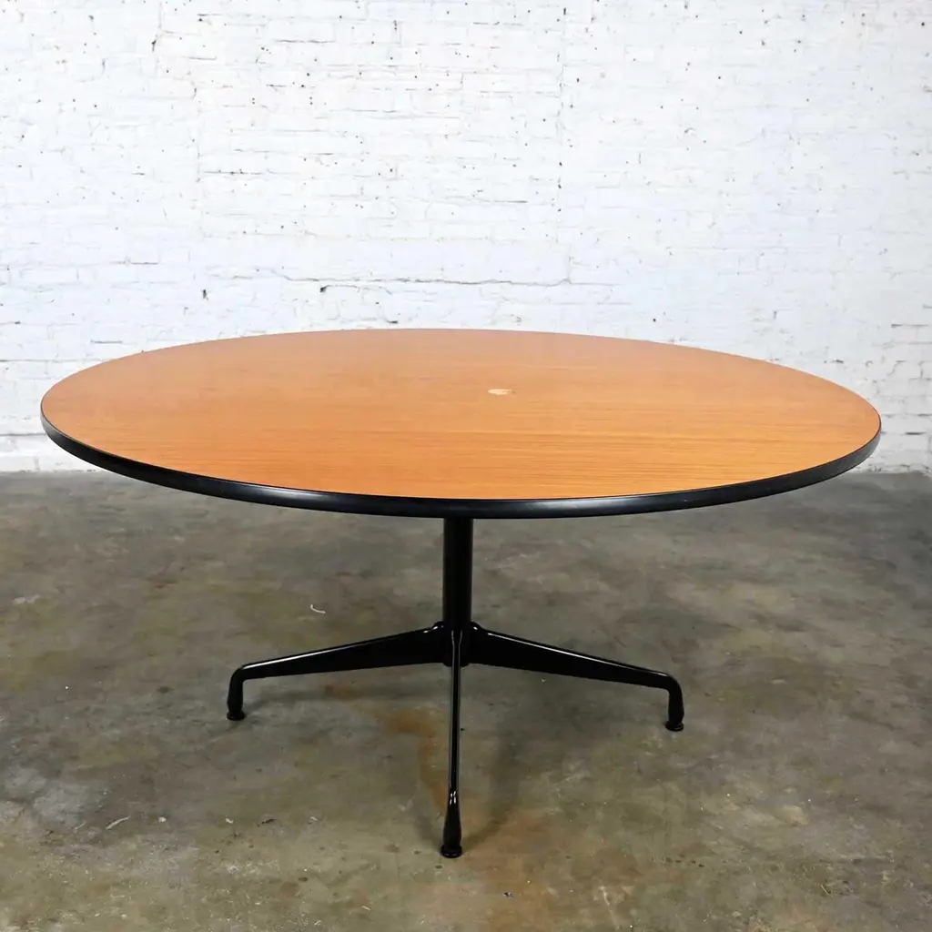 Wonderful vintage Mid-Century Modern Eames for Herman Miller 60” round tables comprised of light natural oak wood veneer tops, black universal bases, and aluminum spider attachment. There are 3 that we are selling separately. Beautiful condition, keeping in mind that these are vintage and not new so will have signs of use and wear. Table in photos is not the table you will receive but is indicative of its condition. You will get photos of the table you purchase before shipping to approve. Please see photos and zoom in for details. We attempt to portray any imperfections. You will get photos of the table you purchase before shipping to approve. Circa, Late 20th century.NOTE: We have a total of 15 of these gorgeous Eames for Herman Miller universal base tables available for you to purchase. 10 have light natural wood veneer round tops & black pedestal & universal bases. 3 of the tables exactly the same but have a gromet hole in the top. We have 1 with a black shaft and an aluminum universal base. They are priced individually. So, check out our other listings.NOTE & DISCLAIMER: The table in the photographs may not be the actual table you receive. However, you will be sent photographs for your approval of the actual table you will be receiving prior to shipping.Tons of Terrific Tables!!! And did we mention… Eames for Herman Miller?? An abundance of awesome-ness!! This is the Classic universal base design by the iconic duo of designer’s husband and wife team Charles and Ray Eames which was designed and began production in 1949. The 16 tables that we have to offer to you were produced late 20th century. And these 3 tables have a gromet hole in the top. You will have the opportunity to choose whether you want one (or all 3!) with the gromet hole or not at checkout. The tops are round with light natural oak wood veneer and mounted on the Eames iconic universal base. This base, including the legs, pedestal, and table edge is black, and the spider attachment is aluminum colored. It can be used in an office as a conference table, but it would be equally as wonderful in your dining room. It is a handsome and timeless table that will host many options of dining or office chairs. The epitome of Mid-Century Modern style. It’s definitely an AWESOME piece of furniture thanks to the genius that was Charles and Ray Eames.Charles Eames was born in St. Louis, Missouri in 1907. Ray Kaiser Eames was born in Sacramento, California in 1912. They met at Cranbrook Academy of Art in Michigan and were married in 1941. They moved together to California and continued their design work they began together at Cranbrook. A commission, which they acquired from the government during WWII to produce molded plywood splints and stretchers, launched a career producing iconic Mid-Century Modern furnishings which are still fresh and sought after today. The Eames and their association with Herman Miller were the partnership of the century. If you want to learn more about Charles and Ray please visit Eames Office, the Eames Official website.Herman Miller started life as Star furniture Co. in Zeeland, Michigan in 1905 a producer of high-quality furniture. Becoming Michigan Star Furniture Co in 1919, and then in 1923, when long time employee Dirk Jan De Pree and his father-in-law purchased 51% of the company stock, it was renamed Herman Miller Furniture Company. And remained so until the 1960s when it became Herman Miller, Inc. Until the 1930s they produced only traditional wood furniture, but the Great Depression caused a need for change, and they hired modernist Gilbert Rohde who took the company in a new successful direction. Upon Rohde’s death in 1944 he was replaced by none other than the renowned George Nelson. Working with the likes of not only Charles and Ray Eames but Isamu Noguchi, Alexander Girard, and Robert Propst, to name just a few, Nelson led Herman Miller to became one of the finest names in furniture and design.Charles and Ray Eames had the vision of making a better world. One in which things were designed to bring pleasure into our lives. This table can do that for you! Don’t wait… Make one, two, four, six, eight, or ALL 15 of them yours!! Table Each:• Height – 29 Inches• Width – 60 Inches• Depth – 60 Inches• Top Thickness – 1 Inches• Weight – 95.5 Pounds Boxed Size Each:• Height – 35 Inches• Width – 66 Inches• Depth – 66 Inches• Weight – 130 Pounds.