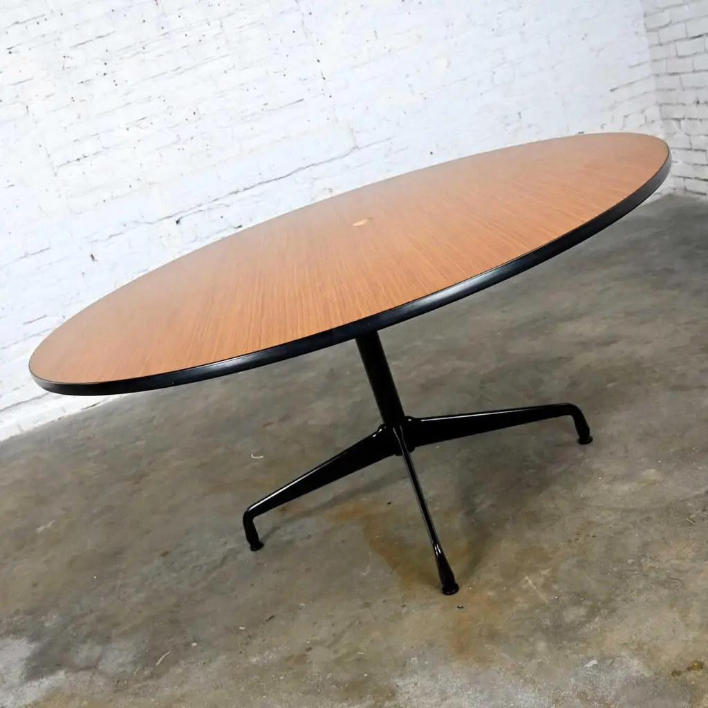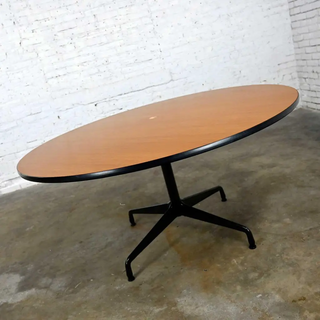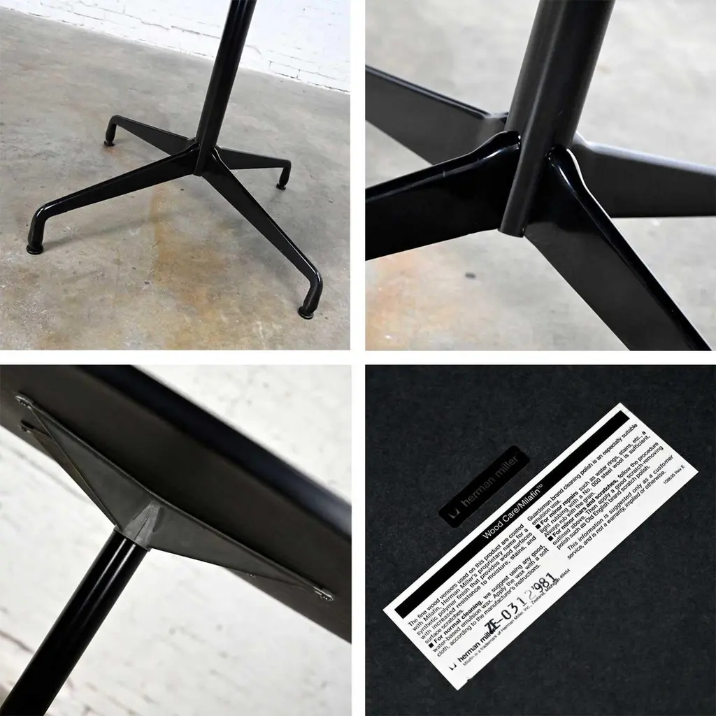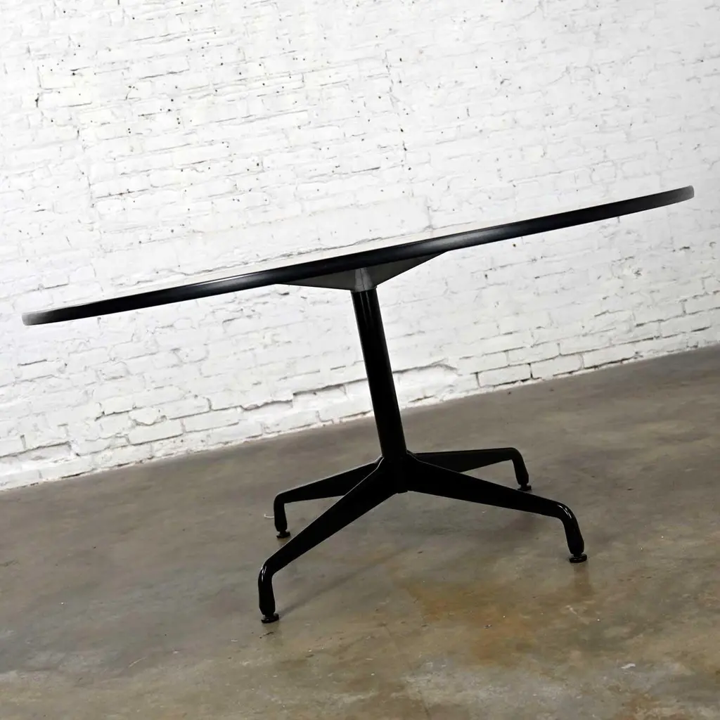 Wonderful vintage Mid-Century Modern Eames for Herman Miller 60” round tables comprised of light natural oak wood veneer tops, black universal bases, and aluminum spider attachment. There are 3 that we are selling separately. Beautiful condition, keeping in mind that these are vintage and not new so will have signs of use and wear. Table in photos is not the table you will receive but is indicative of its condition. You will get photos of the table you purchase before shipping to approve. Please see photos and zoom in for details. We attempt to portray any imperfections. You will get photos of the table you purchase before shipping to approve. Circa, Late 20th century.NOTE: We have a total of 15 of these gorgeous Eames for Herman Miller universal base tables available for you to purchase. 10 have light natural wood veneer round tops & black pedestal & universal bases. 3 of the tables exactly the same but have a gromet hole in the top. We have 1 with a black shaft and an aluminum universal base. They are priced individually. So, check out our other listings.NOTE & DISCLAIMER: The table in the photographs may not be the actual table you receive. However, you will be sent photographs for your approval of the actual table you will be receiving prior to shipping.Tons of Terrific Tables!!! And did we mention… Eames for Herman Miller?? An abundance of awesome-ness!! This is the Classic universal base design by the iconic duo of designer’s husband and wife team Charles and Ray Eames which was designed and began production in 1949. The 16 tables that we have to offer to you were produced late 20th century. And these 3 tables have a gromet hole in the top. You will have the opportunity to choose whether you want one (or all 3!) with the gromet hole or not at checkout. The tops are round with light natural oak wood veneer and mounted on the Eames iconic universal base. This base, including the legs, pedestal, and table edge is black, and the spider attachment is aluminum colored. It can be used in an office as a conference table, but it would be equally as wonderful in your dining room. It is a handsome and timeless table that will host many options of dining or office chairs. The epitome of Mid-Century Modern style. It’s definitely an AWESOME piece of furniture thanks to the genius that was Charles and Ray Eames.Charles Eames was born in St. Louis, Missouri in 1907. Ray Kaiser Eames was born in Sacramento, California in 1912. They met at Cranbrook Academy of Art in Michigan and were married in 1941. They moved together to California and continued their design work they began together at Cranbrook. A commission, which they acquired from the government during WWII to produce molded plywood splints and stretchers, launched a career producing iconic Mid-Century Modern furnishings which are still fresh and sought after today. The Eames and their association with Herman Miller were the partnership of the century. If you want to learn more about Charles and Ray please visit Eames Office, the Eames Official website.Herman Miller started life as Star furniture Co. in Zeeland, Michigan in 1905 a producer of high-quality furniture. Becoming Michigan Star Furniture Co in 1919, and then in 1923, when long time employee Dirk Jan De Pree and his father-in-law purchased 51% of the company stock, it was renamed Herman Miller Furniture Company. And remained so until the 1960s when it became Herman Miller, Inc. Until the 1930s they produced only traditional wood furniture, but the Great Depression caused a need for change, and they hired modernist Gilbert Rohde who took the company in a new successful direction. Upon Rohde’s death in 1944 he was replaced by none other than the renowned George Nelson. Working with the likes of not only Charles and Ray Eames but Isamu Noguchi, Alexander Girard, and Robert Propst, to name just a few, Nelson led Herman Miller to became one of the finest names in furniture and design.Charles and Ray Eames had the vision of making a better world. One in which things were designed to bring pleasure into our lives. This table can do that for you! Don’t wait… Make one, two, four, six, eight, or ALL 15 of them yours!! Table Each:• Height – 29 Inches• Width – 60 Inches• Depth – 60 Inches• Top Thickness – 1 Inches• Weight – 95.5 Pounds Boxed Size Each:• Height – 35 Inches• Width – 66 Inches• Depth – 66 Inches• Weight – 130 Pounds.