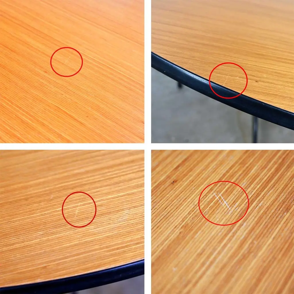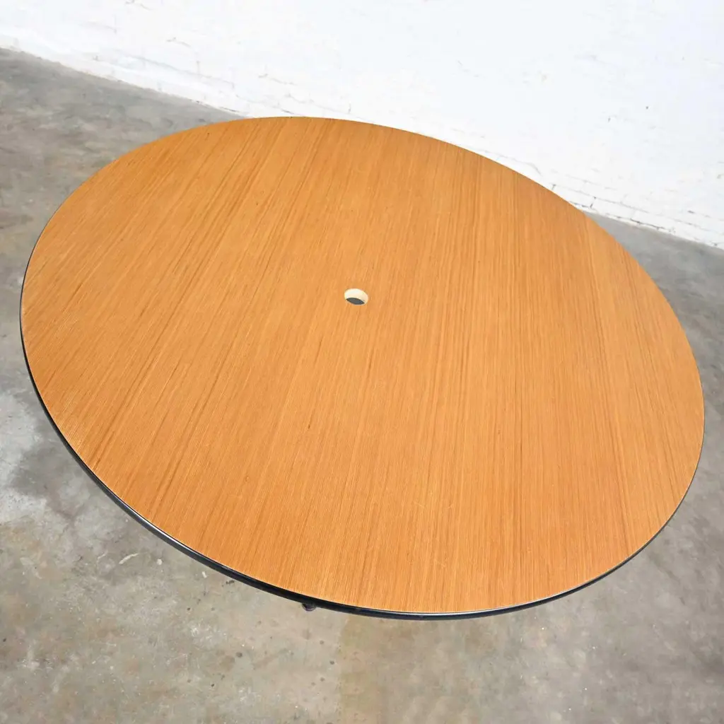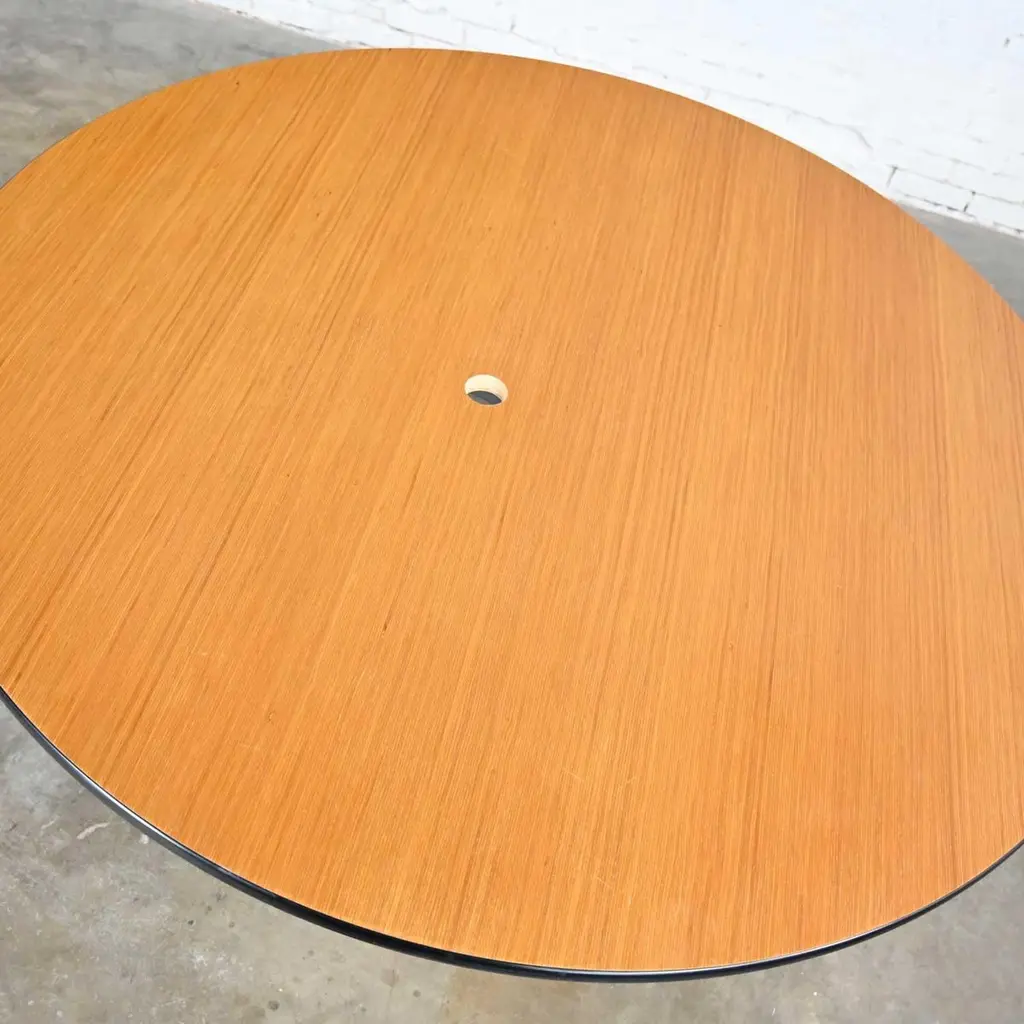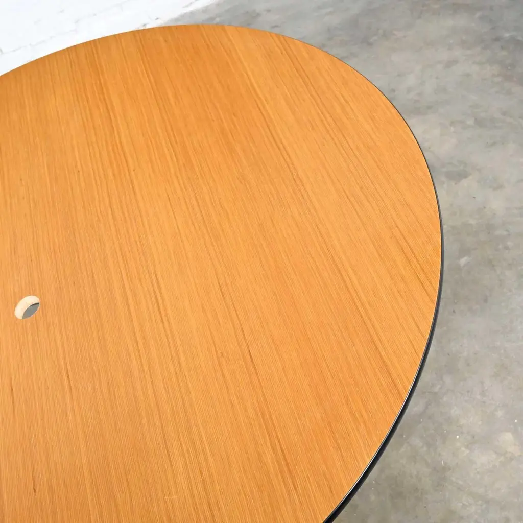 Wonderful vintage Mid-Century Modern Eames for Herman Miller 60” round tables comprised of light natural oak wood veneer tops, black universal bases, and aluminum spider attachment. There are 3 that we are selling separately. Beautiful condition, keeping in mind that these are vintage and not new so will have signs of use and wear. Table in photos is not the table you will receive but is indicative of its condition. You will get photos of the table you purchase before shipping to approve. Please see photos and zoom in for details. We attempt to portray any imperfections. You will get photos of the table you purchase before shipping to approve. Circa, Late 20th century.NOTE: We have a total of 15 of these gorgeous Eames for Herman Miller universal base tables available for you to purchase. 10 have light natural wood veneer round tops & black pedestal & universal bases. 3 of the tables exactly the same but have a gromet hole in the top. We have 1 with a black shaft and an aluminum universal base. They are priced individually. So, check out our other listings.NOTE & DISCLAIMER: The table in the photographs may not be the actual table you receive. However, you will be sent photographs for your approval of the actual table you will be receiving prior to shipping.Tons of Terrific Tables!!! And did we mention… Eames for Herman Miller?? An abundance of awesome-ness!! This is the Classic universal base design by the iconic duo of designer’s husband and wife team Charles and Ray Eames which was designed and began production in 1949. The 16 tables that we have to offer to you were produced late 20th century. And these 3 tables have a gromet hole in the top. You will have the opportunity to choose whether you want one (or all 3!) with the gromet hole or not at checkout. The tops are round with light natural oak wood veneer and mounted on the Eames iconic universal base. This base, including the legs, pedestal, and table edge is black, and the spider attachment is aluminum colored. It can be used in an office as a conference table, but it would be equally as wonderful in your dining room. It is a handsome and timeless table that will host many options of dining or office chairs. The epitome of Mid-Century Modern style. It’s definitely an AWESOME piece of furniture thanks to the genius that was Charles and Ray Eames.Charles Eames was born in St. Louis, Missouri in 1907. Ray Kaiser Eames was born in Sacramento, California in 1912. They met at Cranbrook Academy of Art in Michigan and were married in 1941. They moved together to California and continued their design work they began together at Cranbrook. A commission, which they acquired from the government during WWII to produce molded plywood splints and stretchers, launched a career producing iconic Mid-Century Modern furnishings which are still fresh and sought after today. The Eames and their association with Herman Miller were the partnership of the century. If you want to learn more about Charles and Ray please visit Eames Office, the Eames Official website.Herman Miller started life as Star furniture Co. in Zeeland, Michigan in 1905 a producer of high-quality furniture. Becoming Michigan Star Furniture Co in 1919, and then in 1923, when long time employee Dirk Jan De Pree and his father-in-law purchased 51% of the company stock, it was renamed Herman Miller Furniture Company. And remained so until the 1960s when it became Herman Miller, Inc. Until the 1930s they produced only traditional wood furniture, but the Great Depression caused a need for change, and they hired modernist Gilbert Rohde who took the company in a new successful direction. Upon Rohde’s death in 1944 he was replaced by none other than the renowned George Nelson. Working with the likes of not only Charles and Ray Eames but Isamu Noguchi, Alexander Girard, and Robert Propst, to name just a few, Nelson led Herman Miller to became one of the finest names in furniture and design.Charles and Ray Eames had the vision of making a better world. One in which things were designed to bring pleasure into our lives. This table can do that for you! Don’t wait… Make one, two, four, six, eight, or ALL 15 of them yours!! Table Each:• Height – 29 Inches• Width – 60 Inches• Depth – 60 Inches• Top Thickness – 1 Inches• Weight – 95.5 Pounds Boxed Size Each:• Height – 35 Inches• Width – 66 Inches• Depth – 66 Inches• Weight – 130 Pounds.