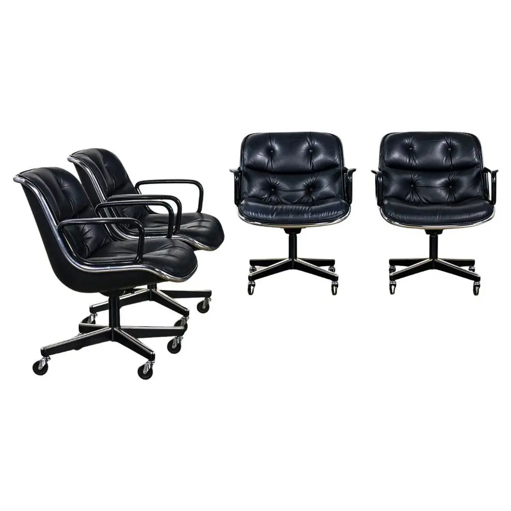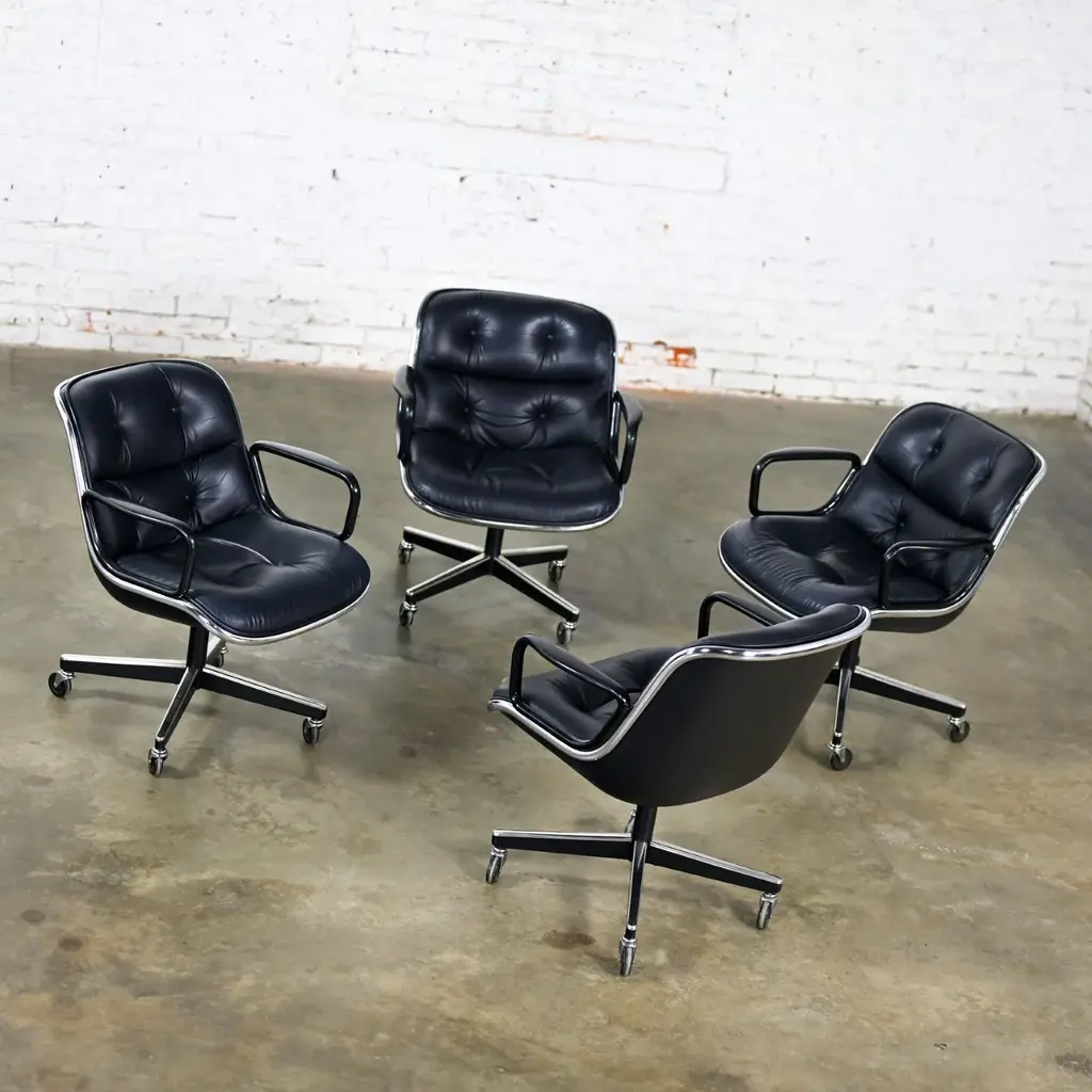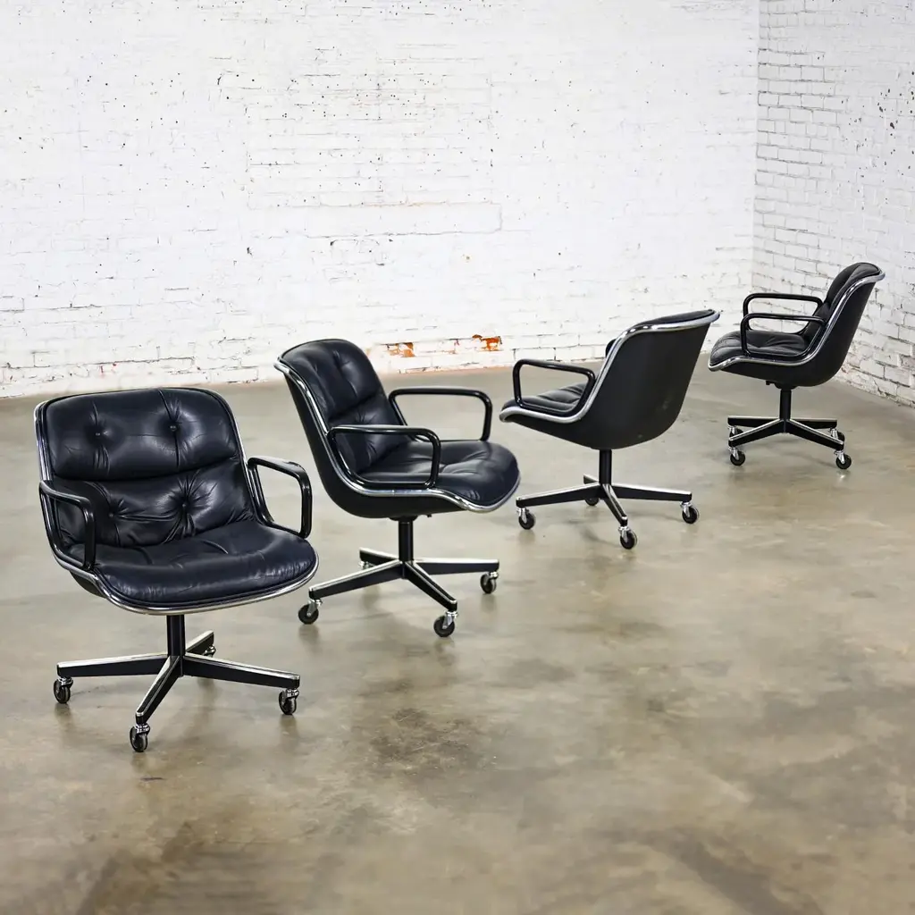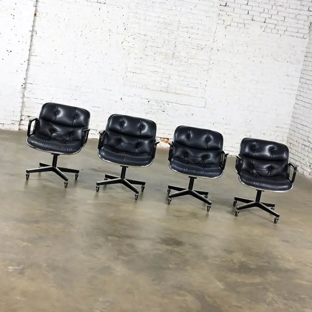 Fabulous MCM (Mid-Century Modern) to Modern Executive armchairs by Charles Pollock for Knoll set of 4. Each chair is comprised of a black leather seat and back with button detail, aluminum band, chrome shaft, black plastic arms, and a 4-prong stainless base with casters. Beautiful condition, keeping in mind that these are vintage and not new so will have signs of use and wear even if it has been refinished or restored. Specifically, no outstanding flaws that we have detected. Please see photos, zoom in for details, and see long description as they are part of the condition report. We attempt to portray any imperfections. Circa, Designed 1963, Production 1986. NOTE: We have 13 of these Executive Armchairs by Charles Pollock for Knoll available. We have several listings composed of other groupings here for sale, check them out!! We will also send you a photo of the exact chairs you will be getting so you can examine and approve prior to shipping. Talk about a FAB FOUR!!! Did someone say Charles Pollock for KNOLL??? YES, PLEASE!!!! Without a doubt, this is JUST the classic chair set you have been looking for! I mean, what’s not to love? First off, they’re designed by the iconic Charles Pollock…. for the ELITE Knoll Furniture, and they bear a quintessential Mid Century Modern to Modern CLASSIC style sure to withstand the hands of time. And as if that’s not enough to entice you, let’s talk about the epic 4-prong base with stainless arms and painted black sides, gorgeous casters, and cylindrical chrome shaft! The ergonomically pleasing bucket style seat is wrapped in sultry, rich black leather with a button detail on the seat and back, and it has precisely complacent black plastic arms. The entire bucket seat is surrounded by an aluminum band that was described by Charles Pollock as “rim technology.” Which he created to hold the entire design together both structurally and visually. This design was first introduced in 1963 and is an appealing and sought-after look still today. This exemplary office chair is both stylish and comfortable. They could be just what you need for your new home office, around a game table or breakfast nook, or as extra seating in your living or family room. Whether you have a mid-century modern home, an industrial loft, modern country, mountain ranch home, OR an executive position at the office… this design is simply timeless and will blend in beautifully with any décor. It’s Charles Pollock for Knoll folks… you can’t go wrong!! The Pollock Executive Chair was designed for Knoll in 1963 and is among the best-selling executive chairs in the history of office furniture design. Pollock’s connection with Knoll began after he designed a chair in 1963 specifically to introduce them. He remembered… “I had a crummy little apartment on West 25th Street starting in the 1940s,” Pollock once stated in a Bauhaus interview, “With hardly anything to build anything, I built this damn chair with my bare hands. One day, I carried it on an elevator–it’s heavy! –and I was getting off the elevator, and I knocked Florence Knoll down! I just left; I was so embarrassed. I told my psychiatrist, and he said, ‘This is perfect! Now you write her a letter and you say you were so embarrassed and how much you love Knoll and how you worked so hard on this chair.’ And she hired me.” And that’s the beginning of Knoll and the infamous chair designer, Charles Pollock. In addition to designing for Knoll and his Pollock Executive chair collection, he is also well-known for his designs for Bernhardt and the CP Lounge Collection. The Pollock Executive chair for Knoll features what Pollock described as “rim technology” which is the use of a single aluminum band around the chairs perimeter to hold the design together both structurally, and visually. Fifty years after its introduction, the Pollock Chair continues to exude timeless elegance in any home or office. Elite Designer? Check! Iconic Manufacturer? Check! Timeless…Classic Style? Check! These fabulous Executive Armchairs by Charles Pollock for Knoll have ALL the boxes checked!! Now, all you need to do is… make them YOURS!!! Chair Size Each: - Height: 32 Inches - Width: 26.5 Inches - Depth: 28 Inches - Seat Height: 18.5 Inches - Arm Height: 26 Inches - Inside Seat Width: 21.5 Inches - Inside Seat Depth: 18.5 Inches - Inside Back Height: 16.5 Inches - Clearance to floor: 3.25 Inches - Weight: 39.62 Pounds Crated Size: - Length: 62 Inches - Width: 36 Inches - Height: 60 Inches - Weight: 325 Pounds We ask that the buyer cover freight. Please send zip code for a quote to your area.