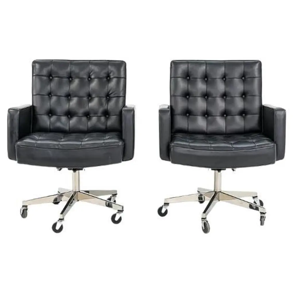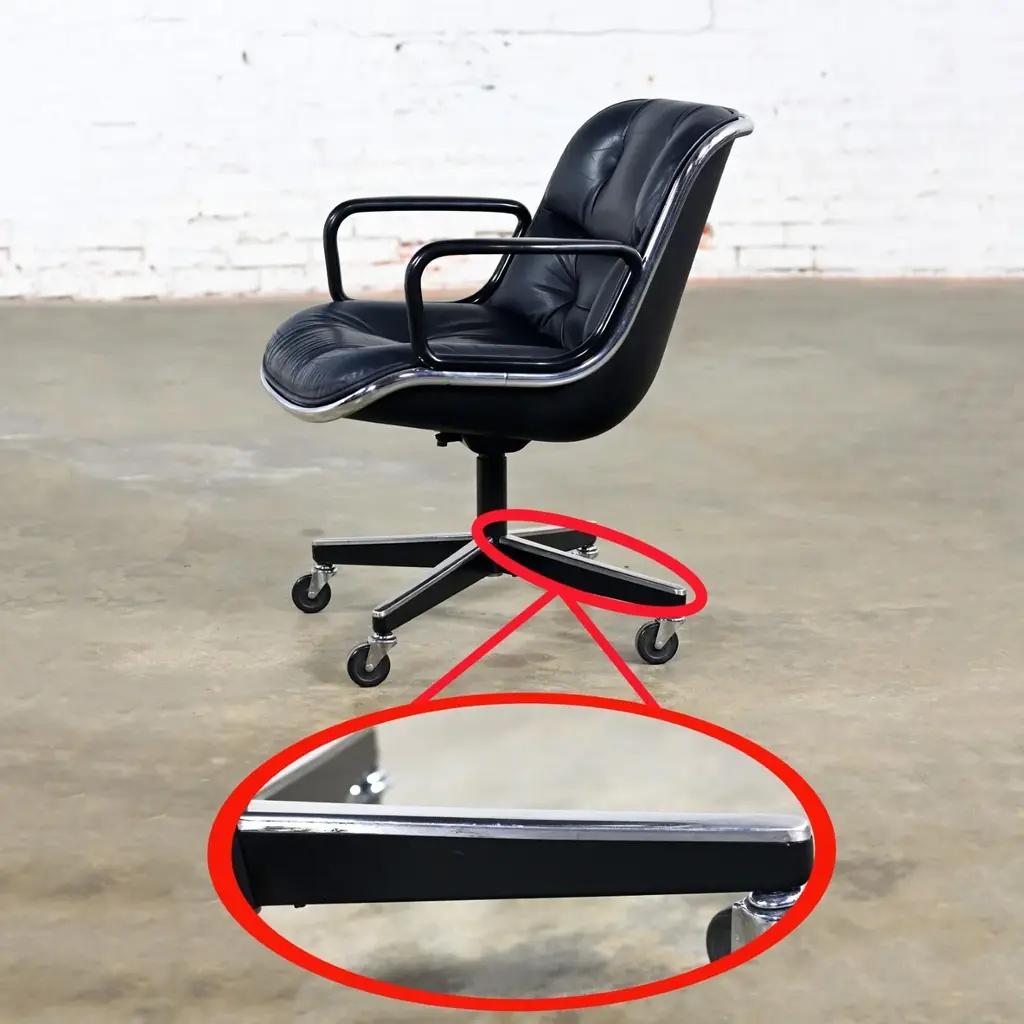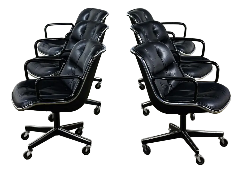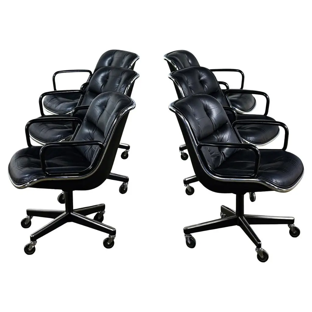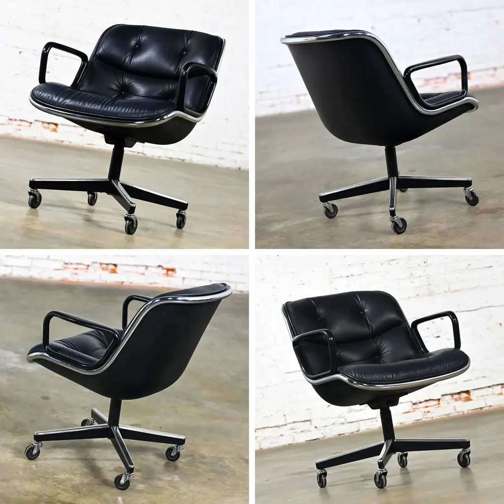 Fabulous MCM (Mid-Century Modern) to Modern Executive armchairs by Charles Pollock for Knoll set of 4. Each chair is comprised of a black leather seat and back with button detail, aluminum band, chrome shaft, black plastic arms, and a 4-prong stainless base with casters. Beautiful condition, keeping in mind that these are vintage and not new so will have signs of use and wear even if it has been refinished or restored. Specifically, no outstanding flaws that we have detected. Please see photos, zoom in for details, and see long description as they are part of the condition report. We attempt to portray any imperfections. Circa, Designed 1963, Production 1986. NOTE: We have 13 of these Executive Armchairs by Charles Pollock for Knoll available. We have several listings composed of other groupings here for sale, check them out!! We will also send you a photo of the exact chairs you will be getting so you can examine and approve prior to shipping. Talk about a FAB FOUR!!! Did someone say Charles Pollock for KNOLL??? YES, PLEASE!!!! Without a doubt, this is JUST the classic chair set you have been looking for! I mean, what’s not to love? First off, they’re designed by the iconic Charles Pollock…. for the ELITE Knoll Furniture, and they bear a quintessential Mid Century Modern to Modern CLASSIC style sure to withstand the hands of time. And as if that’s not enough to entice you, let’s talk about the epic 4-prong base with stainless arms and painted black sides, gorgeous casters, and cylindrical chrome shaft! The ergonomically pleasing bucket style seat is wrapped in sultry, rich black leather with a button detail on the seat and back, and it has precisely complacent black plastic arms. The entire bucket seat is surrounded by an aluminum band that was described by Charles Pollock as “rim technology.” Which he created to hold the entire design together both structurally and visually. This design was first introduced in 1963 and is an appealing and sought-after look still today. This exemplary office chair is both stylish and comfortable. They could be just what you need for your new home office, around a game table or breakfast nook, or as extra seating in your living or family room. Whether you have a mid-century modern home, an industrial loft, modern country, mountain ranch home, OR an executive position at the office… this design is simply timeless and will blend in beautifully with any décor. It’s Charles Pollock for Knoll folks… you can’t go wrong!! The Pollock Executive Chair was designed for Knoll in 1963 and is among the best-selling executive chairs in the history of office furniture design. Pollock’s connection with Knoll began after he designed a chair in 1963 specifically to introduce them. He remembered… “I had a crummy little apartment on West 25th Street starting in the 1940s,” Pollock once stated in a Bauhaus interview, “With hardly anything to build anything, I built this damn chair with my bare hands. One day, I carried it on an elevator–it’s heavy! –and I was getting off the elevator, and I knocked Florence Knoll down! I just left; I was so embarrassed. I told my psychiatrist, and he said, ‘This is perfect! Now you write her a letter and you say you were so embarrassed and how much you love Knoll and how you worked so hard on this chair.’ And she hired me.” And that’s the beginning of Knoll and the infamous chair designer, Charles Pollock. In addition to designing for Knoll and his Pollock Executive chair collection, he is also well-known for his designs for Bernhardt and the CP Lounge Collection. The Pollock Executive chair for Knoll features what Pollock described as “rim technology” which is the use of a single aluminum band around the chairs perimeter to hold the design together both structurally, and visually. Fifty years after its introduction, the Pollock Chair continues to exude timeless elegance in any home or office. Elite Designer? Check! Iconic Manufacturer? Check! Timeless…Classic Style? Check! These fabulous Executive Armchairs by Charles Pollock for Knoll have ALL the boxes checked!! Now, all you need to do is… make them YOURS!!! Chair Size Each: - Height: 32 Inches - Width: 26.5 Inches - Depth: 28 Inches - Seat Height: 18.5 Inches - Arm Height: 26 Inches - Inside Seat Width: 21.5 Inches - Inside Seat Depth: 18.5 Inches - Inside Back Height: 16.5 Inches - Clearance to floor: 3.25 Inches - Weight: 39.62 Pounds Crated Size: - Length: 62 Inches - Width: 36 Inches - Height: 60 Inches - Weight: 325 Pounds We ask that the buyer cover freight. Please send zip code for a quote to your area.