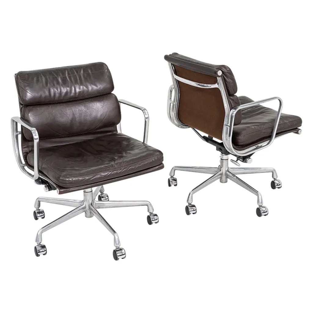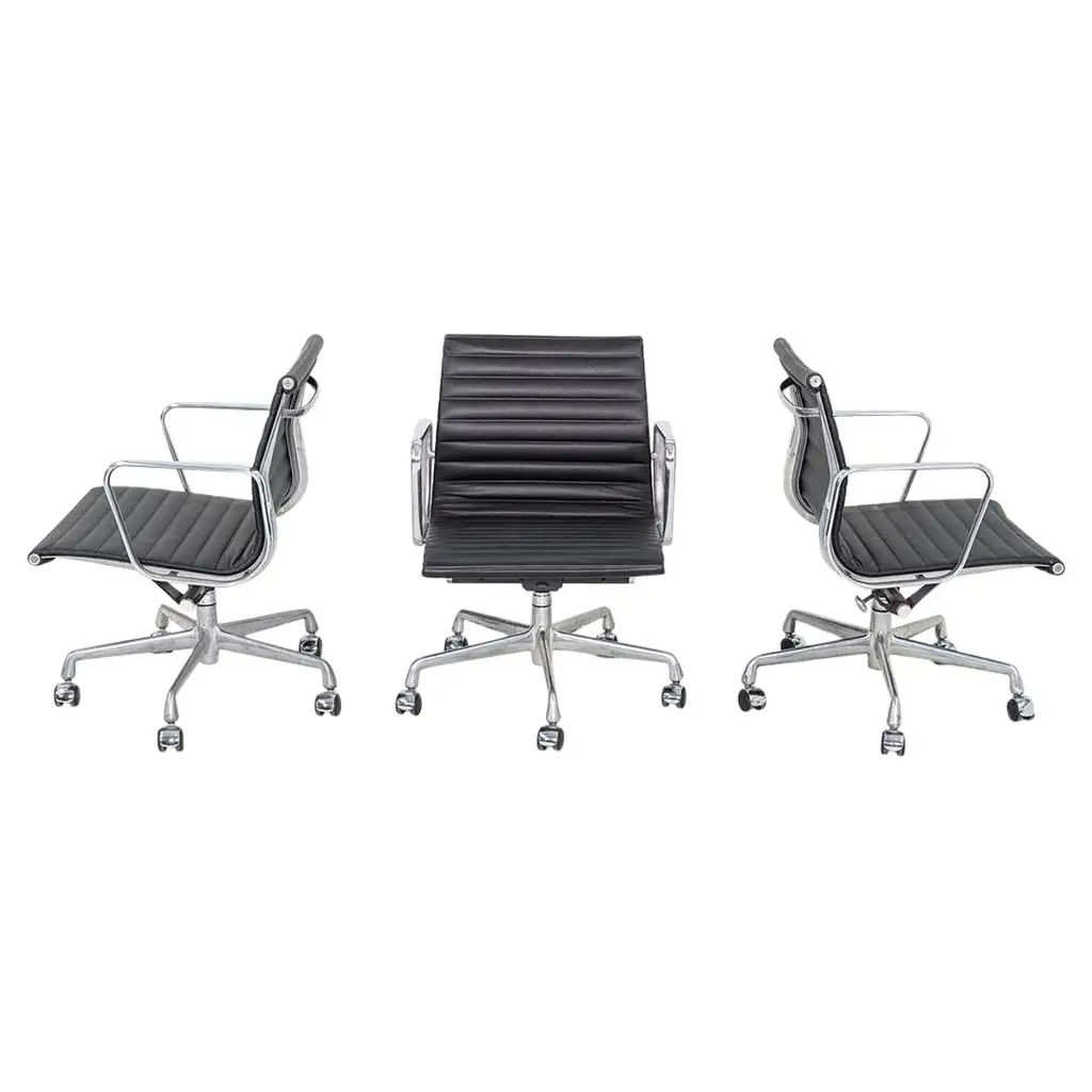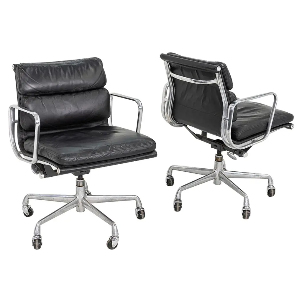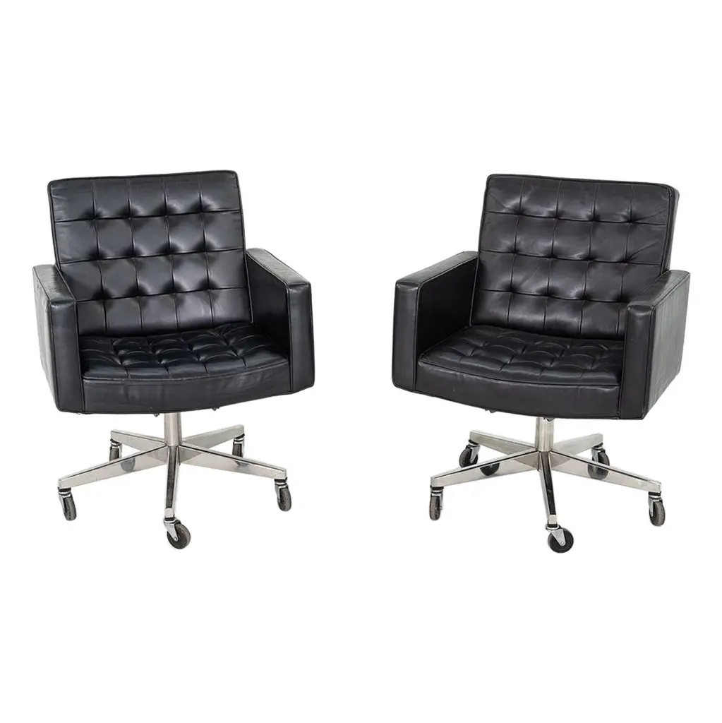 Fabulous MCM (Mid-Century Modern) to Modern Executive armchairs by Charles Pollock for Knoll set of 4. Each chair is comprised of a black leather seat and back with button detail, aluminum band, chrome shaft, black plastic arms, and a 4-prong stainless base with casters. Beautiful condition, keeping in mind that these are vintage and not new so will have signs of use and wear even if it has been refinished or restored. Specifically, no outstanding flaws that we have detected. Please see photos, zoom in for details, and see long description as they are part of the condition report. We attempt to portray any imperfections. Circa, Designed 1963, Production 1986. NOTE: We have 13 of these Executive Armchairs by Charles Pollock for Knoll available. We have several listings composed of other groupings here for sale, check them out!! We will also send you a photo of the exact chairs you will be getting so you can examine and approve prior to shipping. Talk about a FAB FOUR!!! Did someone say Charles Pollock for KNOLL??? YES, PLEASE!!!! Without a doubt, this is JUST the classic chair set you have been looking for! I mean, what’s not to love? First off, they’re designed by the iconic Charles Pollock…. for the ELITE Knoll Furniture, and they bear a quintessential Mid Century Modern to Modern CLASSIC style sure to withstand the hands of time. And as if that’s not enough to entice you, let’s talk about the epic 4-prong base with stainless arms and painted black sides, gorgeous casters, and cylindrical chrome shaft! The ergonomically pleasing bucket style seat is wrapped in sultry, rich black leather with a button detail on the seat and back, and it has precisely complacent black plastic arms. The entire bucket seat is surrounded by an aluminum band that was described by Charles Pollock as “rim technology.” Which he created to hold the entire design together both structurally and visually. This design was first introduced in 1963 and is an appealing and sought-after look still today. This exemplary office chair is both stylish and comfortable. They could be just what you need for your new home office, around a game table or breakfast nook, or as extra seating in your living or family room. Whether you have a mid-century modern home, an industrial loft, modern country, mountain ranch home, OR an executive position at the office… this design is simply timeless and will blend in beautifully with any décor. It’s Charles Pollock for Knoll folks… you can’t go wrong!! The Pollock Executive Chair was designed for Knoll in 1963 and is among the best-selling executive chairs in the history of office furniture design. Pollock’s connection with Knoll began after he designed a chair in 1963 specifically to introduce them. He remembered… “I had a crummy little apartment on West 25th Street starting in the 1940s,” Pollock once stated in a Bauhaus interview, “With hardly anything to build anything, I built this damn chair with my bare hands. One day, I carried it on an elevator–it’s heavy! –and I was getting off the elevator, and I knocked Florence Knoll down! I just left; I was so embarrassed. I told my psychiatrist, and he said, ‘This is perfect! Now you write her a letter and you say you were so embarrassed and how much you love Knoll and how you worked so hard on this chair.’ And she hired me.” And that’s the beginning of Knoll and the infamous chair designer, Charles Pollock. In addition to designing for Knoll and his Pollock Executive chair collection, he is also well-known for his designs for Bernhardt and the CP Lounge Collection. The Pollock Executive chair for Knoll features what Pollock described as “rim technology” which is the use of a single aluminum band around the chairs perimeter to hold the design together both structurally, and visually. Fifty years after its introduction, the Pollock Chair continues to exude timeless elegance in any home or office. Elite Designer? Check! Iconic Manufacturer? Check! Timeless…Classic Style? Check! These fabulous Executive Armchairs by Charles Pollock for Knoll have ALL the boxes checked!! Now, all you need to do is… make them YOURS!!! Chair Size Each: - Height: 32 Inches - Width: 26.5 Inches - Depth: 28 Inches - Seat Height: 18.5 Inches - Arm Height: 26 Inches - Inside Seat Width: 21.5 Inches - Inside Seat Depth: 18.5 Inches - Inside Back Height: 16.5 Inches - Clearance to floor: 3.25 Inches - Weight: 39.62 Pounds Crated Size: - Length: 62 Inches - Width: 36 Inches - Height: 60 Inches - Weight: 325 Pounds We ask that the buyer cover freight. Please send zip code for a quote to your area.