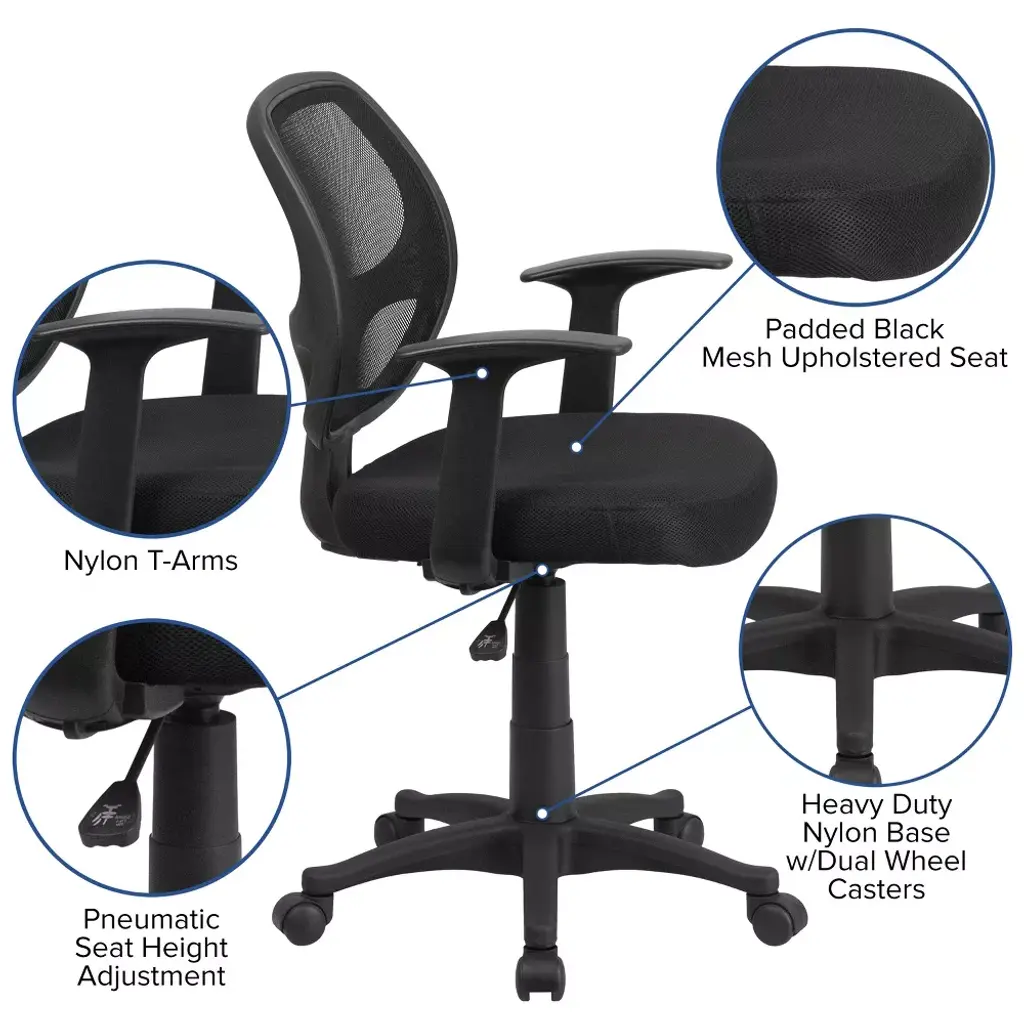 This mesh task chair is designed to keep you cool and comfortable all day. A ventilated mesh back allows air to circulate, keeping you cool no matter how high the pressure gets and built-in lumbar support helps prevent back strain and muscle fatigue. The swivel seat is foam and covered with black mesh upholstery. Raise and lower the seat using the pneumatic seat height adjustment lever, conveniently located under the seat. The heavy-duty, nylon base with dual wheel casters makes it easy to roll across the floor. Whether it's a day filled with meetings or you're working to beat a tight deadline, this stylish chair provides the support you need to be productive.