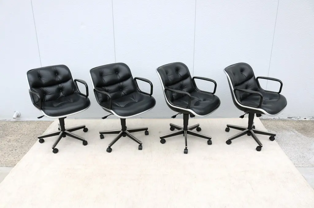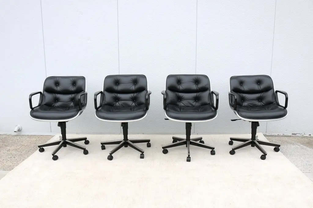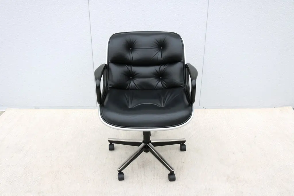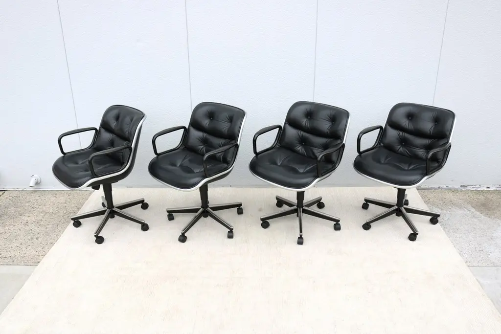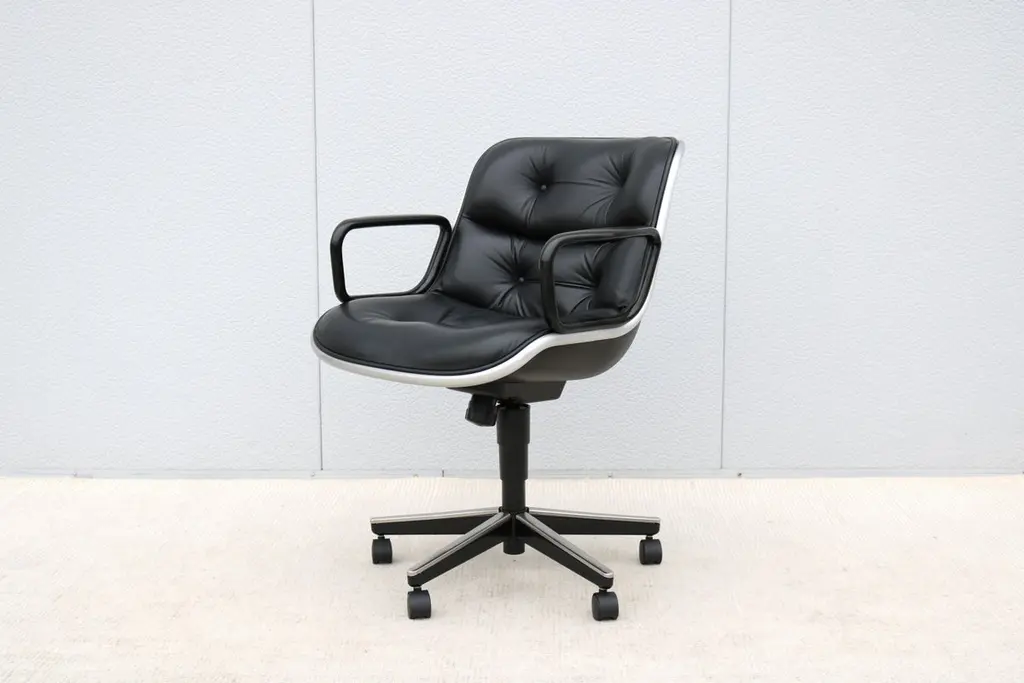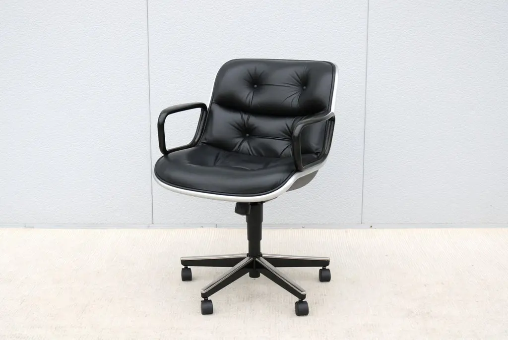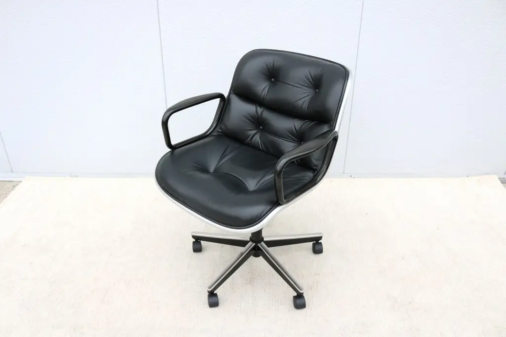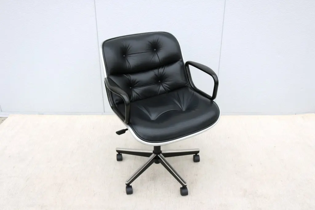 Stunning authentic mid-century modern Pollock executive arm chair.One of Knoll's most significant chairs was designed in 1963 by Charles Pollock.Sixty years after its introduction, the Pollock chair continues to exude timeless elegance in any home or workplace interiors, with innovative comfort features.Please note I have 4 chairs available, selling them individually (the price listed is for one chair)Updated: 2 chairs are sold, only 2 chairs are still available.Specifications:Upholstered in stunning high-quality black leather.360 degrees swivel.Pneumatic seat height adjustment.Tilt with manual tilt tension adjustment.The seat and back are multi-density urethane foam with button tufting.Black textured polypropylene outer shell.Aluminum polished rim (frame)Arms are seamless, black phenolic plastic.5-star base with hard-wheel casters and stainless steel top caps.Designer: Charles Pollock 1963Manufacturer: Knoll, authentic has the label attached under the seat.Made in USA.Year manufactured: 2006Dimensions: Height 31" to 36" x Width 26.25" x Depth 28" x Seat height 18" to 23" x Arm height 24" to 29" x Weight 44 lbs.