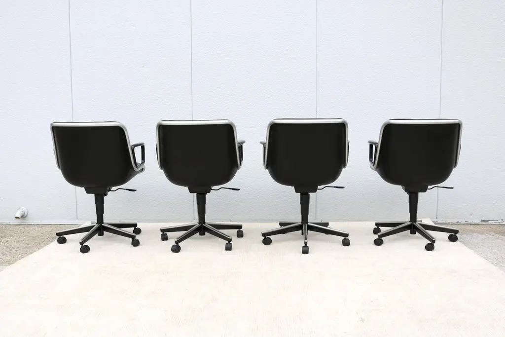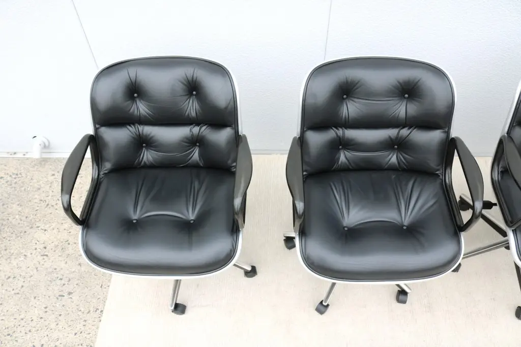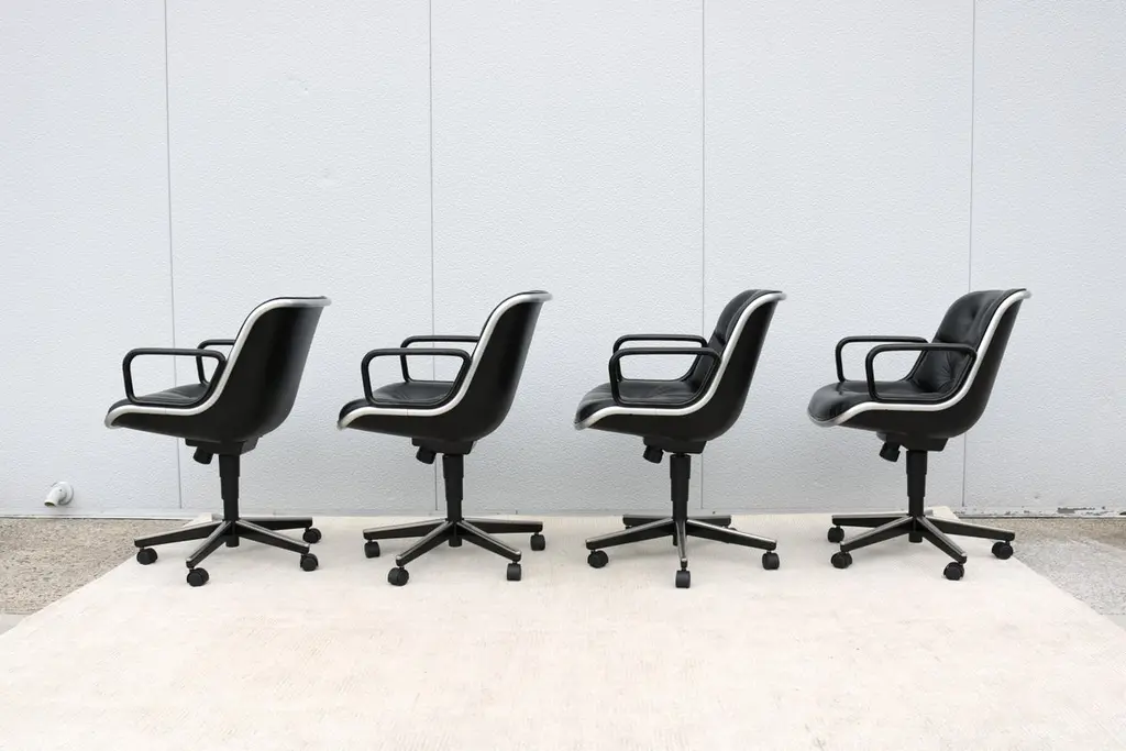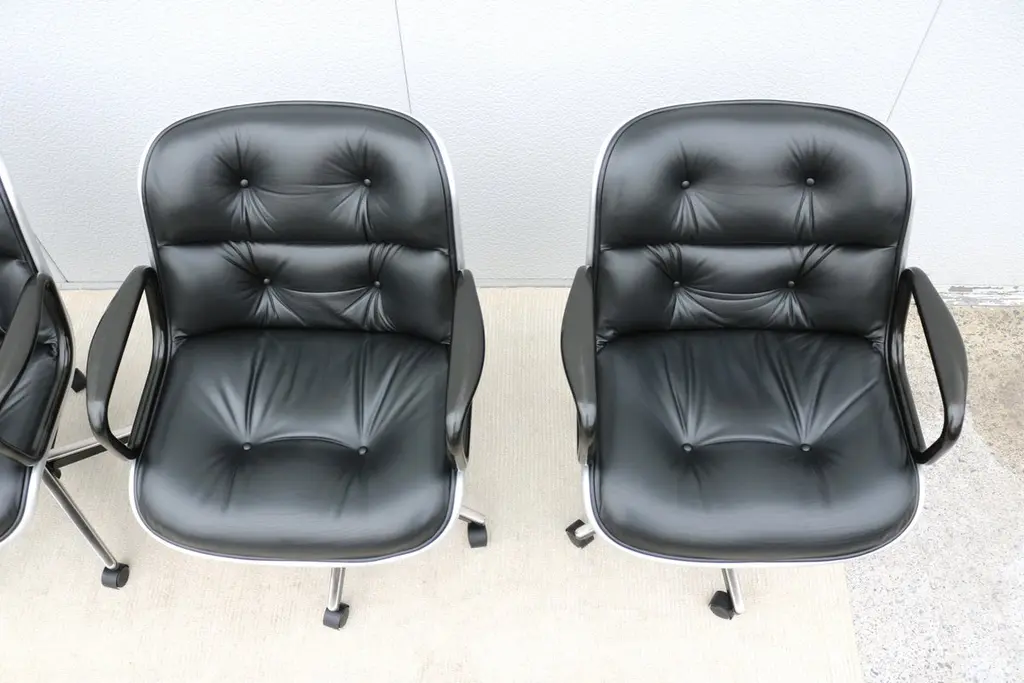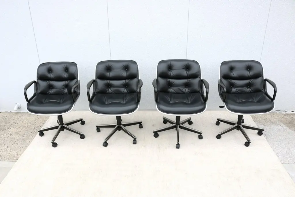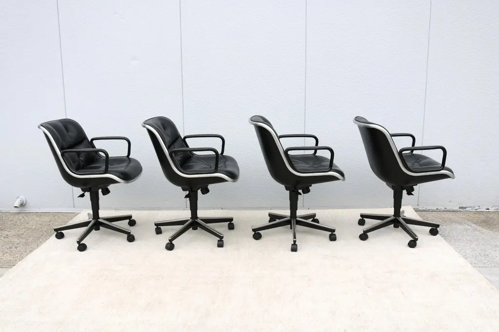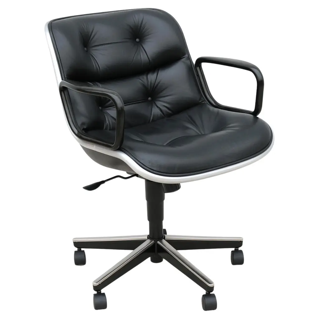 Stunning authentic mid-century modern Pollock executive arm chair.One of Knoll's most significant chairs was designed in 1963 by Charles Pollock.Sixty years after its introduction, the Pollock chair continues to exude timeless elegance in any home or workplace interiors, with innovative comfort features.Please note I have 4 chairs available, selling them individually (the price listed is for one chair)Updated: 2 chairs are sold, only 2 chairs are still available.Specifications:Upholstered in stunning high-quality black leather.360 degrees swivel.Pneumatic seat height adjustment.Tilt with manual tilt tension adjustment.The seat and back are multi-density urethane foam with button tufting.Black textured polypropylene outer shell.Aluminum polished rim (frame)Arms are seamless, black phenolic plastic.5-star base with hard-wheel casters and stainless steel top caps.Designer: Charles Pollock 1963Manufacturer: Knoll, authentic has the label attached under the seat.Made in USA.Year manufactured: 2006Dimensions: Height 31" to 36" x Width 26.25" x Depth 28" x Seat height 18" to 23" x Arm height 24" to 29" x Weight 44 lbs.