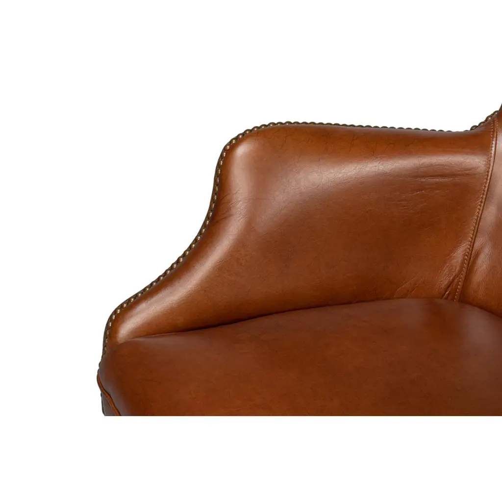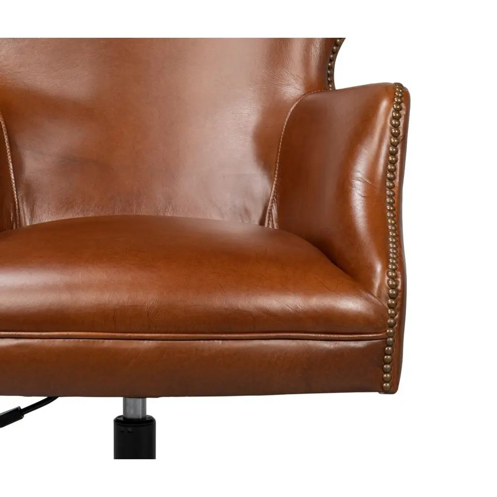 A modern brown leather desk chair with brass nailhead trim. A truly timeless classic style crafted in rich brown leather. This practical and functional chair will elevate the look and feel of any office while you work in comfort. Made of top-grain leather in a "vintage cigar" color. Sits on a 5 ball caster swivel base. This chair has a lever to adjust the back and height. Color variation is common and acceptable on vintage leather. Dimensions: 25" W x 29" D x 35" HSeat: 19" H x 19" DArm: 25" H.