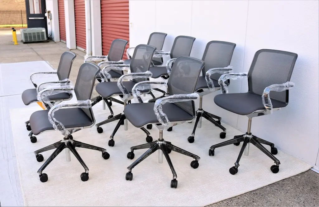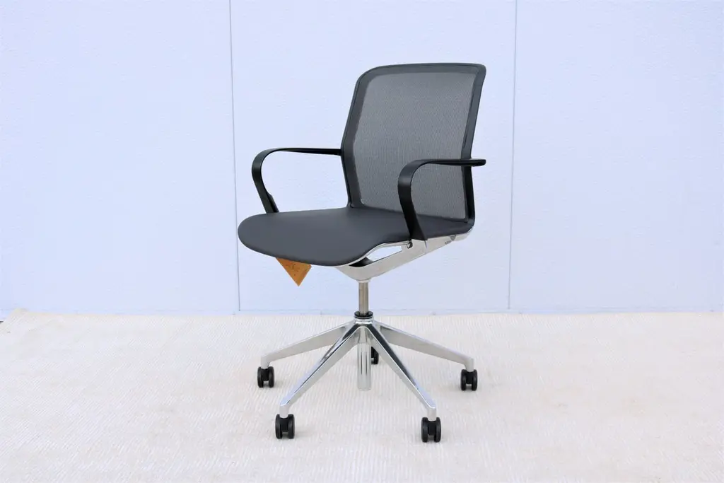 The ergonomic Filo mesh back conference chair designed by EOOS for Keilhauer successfully combines comfort, technology and elegant. Features soft seat and supportive breathable backrest mesh allows air to circulate and offers sustained comfort.Filo is a light and versatile, beautiful and functional chair that can be used at home or office as conference or office desk chair.Please note I have 9 chairs available, selling them individually (the price listed is for one chair)Features and adjustments:Seat is upholstered in Grade A leather, Kenora KE55166 Cinder, color slate gray.Mesh back, off black graphite colorCushioning Material: high density 100% polyurethane foamPolished aluminum frameFive-star polished aluminum swivel base with castersCarrier and arms black color5" Pneumatic seat height adjustment (17.5" - 22.5")Designed by: EOOS, Martin Bergmann, Gernot Bohmann and Harald Grundl.Model: Filo 9421PA Manufacturer: KeilhauerMade in: Canada.Dimensions: Height 35.5" - 40.5" x Depth 25" x Width 25" x Arm height 26" - 31" Seat width 20" x Seat depth 19".Condition: These chairs are (brand new) never been used, have the manufacturer's original packaging cover and tag, but missing the original box.Brand new this chair retails for approximately $ 2200.00+ eachRecommend checking Keilhauer website for quality and reputation of brand!